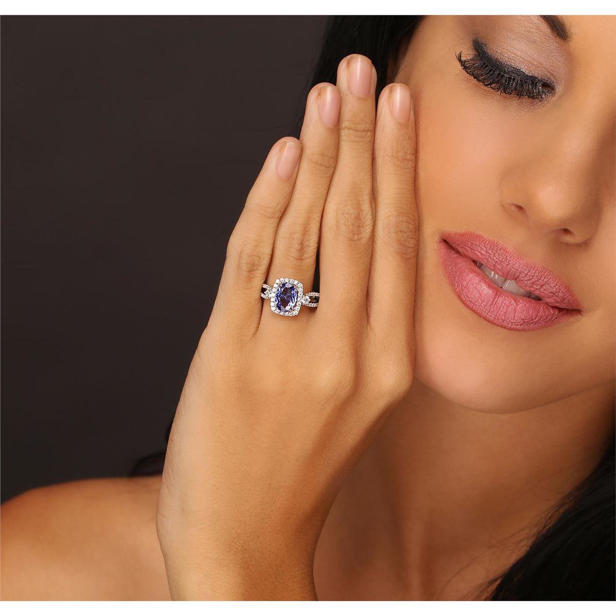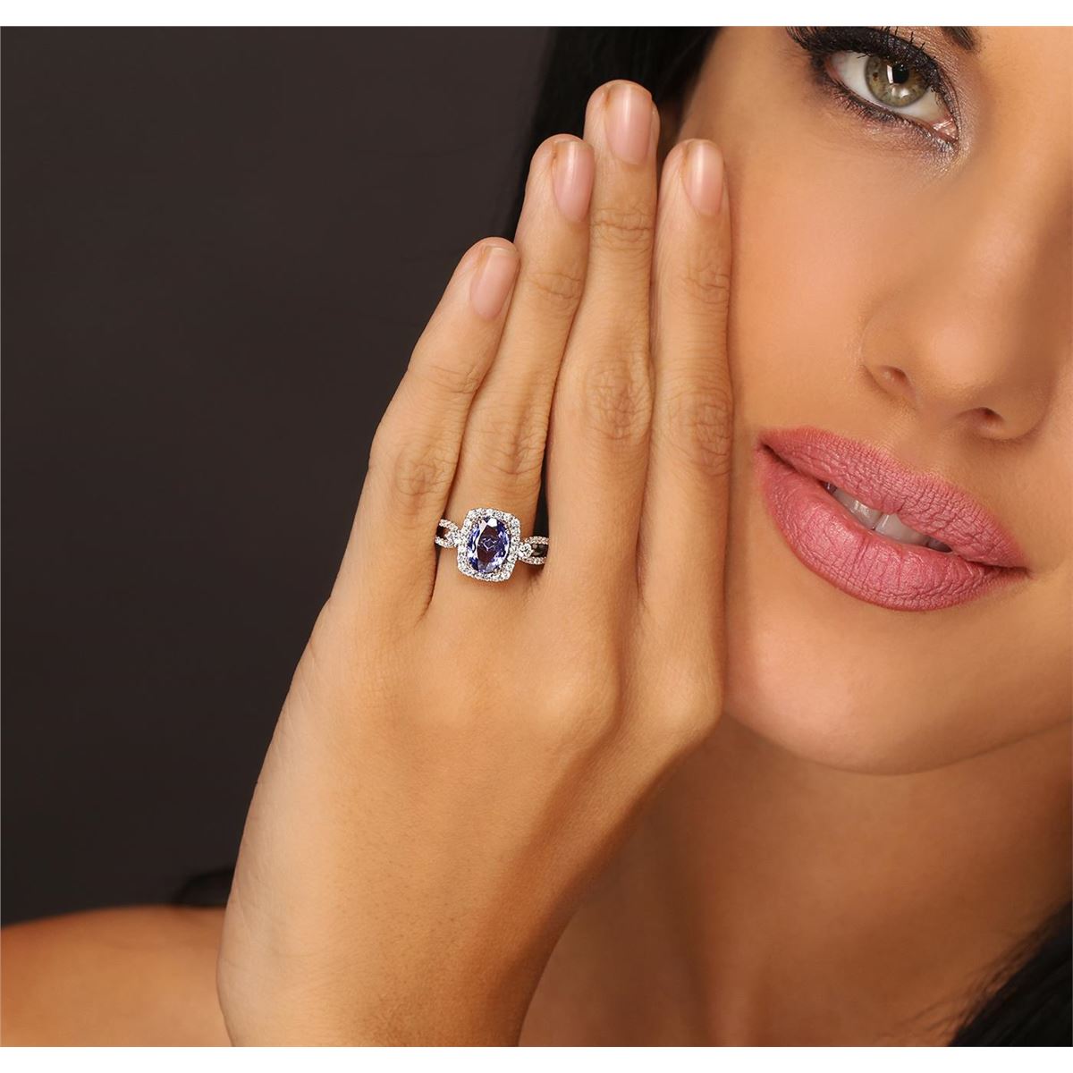 One electronically tested 18KT white gold Ladies combination cast & assembled ring with a bright polish finish. Condition is new. Identified with markings of "750". Containing: One prong set oval modified brilliant cut natural tanzanite, measuring 9.20 x 6.60 x 4.29mm, approximate weight of 1.79ct., clarity is eye clean, type I, medium, moderately strong, violet color, (GIA V 5/4), cut is good. Colored gemstones are presumed to have been subjected to commonly used color/clarity enhancement processes. Fifty-Four prong set round brilliant cut diamonds, measuring 1.30 - 1.20 x 0.75mm (depth est.) approximate total weight of 54 Stones = 0.38ct. Clarity of I-1 to I-2, Color of H - I, Cut is Good. Two prong set round brilliant cut diamonds, measuring 2.50 - 2.50 x 1.50mm (depth est.) approximate total weight of 2 Stones = 0.11ct. Clarity of SI-1, Color of I, Cut is Very Good. Total Weight of Colored Stones 1.79ct. Total Weight of Diamonds 0.50ct. Total Weight of Ring 4.80 grams. GGL Appraised at $6,235.00.