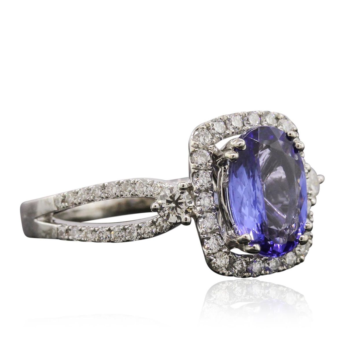 One electronically tested 18KT white gold Ladies combination cast & assembled ring with a bright polish finish. Condition is new. Identified with markings of "750". Containing: One prong set oval modified brilliant cut natural tanzanite, measuring 9.20 x 6.60 x 4.29mm, approximate weight of 1.79ct., clarity is eye clean, type I, medium, moderately strong, violet color, (GIA V 5/4), cut is good. Colored gemstones are presumed to have been subjected to commonly used color/clarity enhancement processes. Fifty-Four prong set round brilliant cut diamonds, measuring 1.30 - 1.20 x 0.75mm (depth est.) approximate total weight of 54 Stones = 0.38ct. Clarity of I-1 to I-2, Color of H - I, Cut is Good. Two prong set round brilliant cut diamonds, measuring 2.50 - 2.50 x 1.50mm (depth est.) approximate total weight of 2 Stones = 0.11ct. Clarity of SI-1, Color of I, Cut is Very Good. Total Weight of Colored Stones 1.79ct. Total Weight of Diamonds 0.50ct. Total Weight of Ring 4.80 grams. GGL Appraised at $6,235.00.