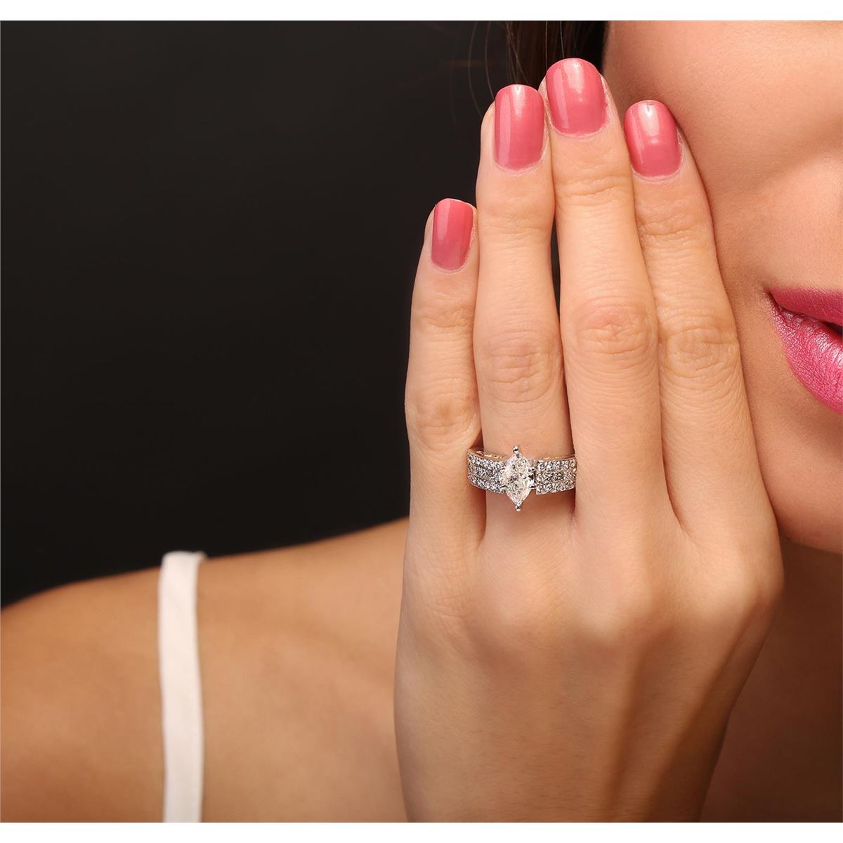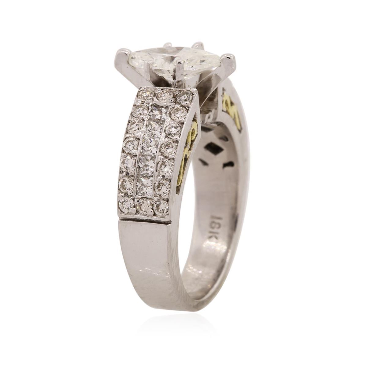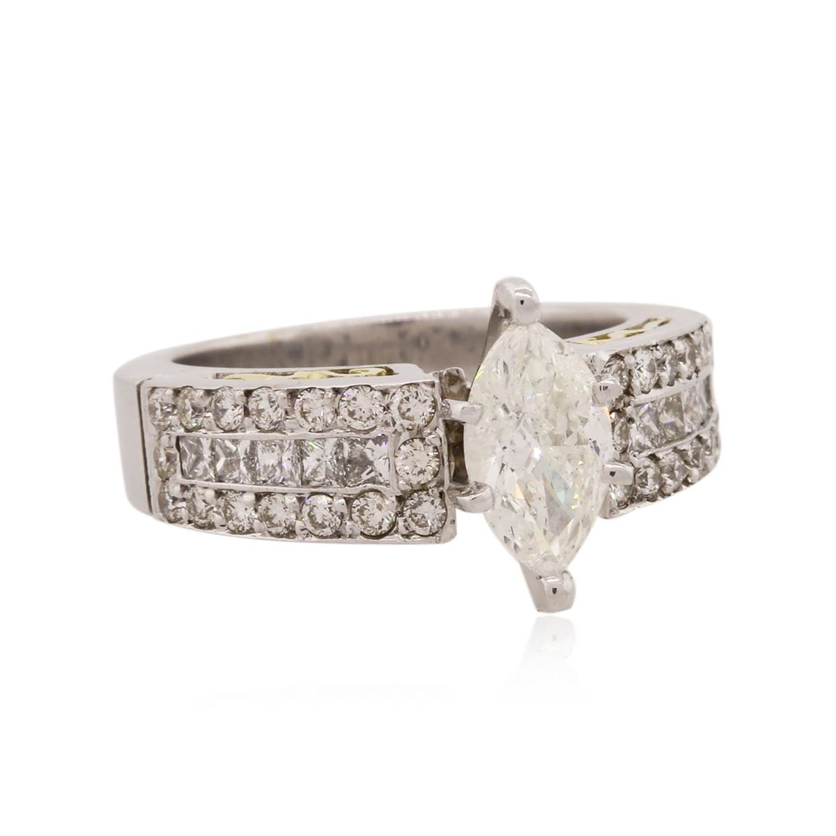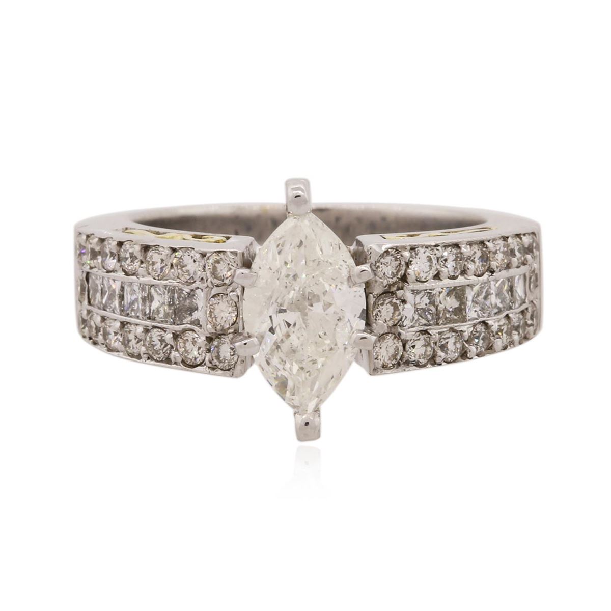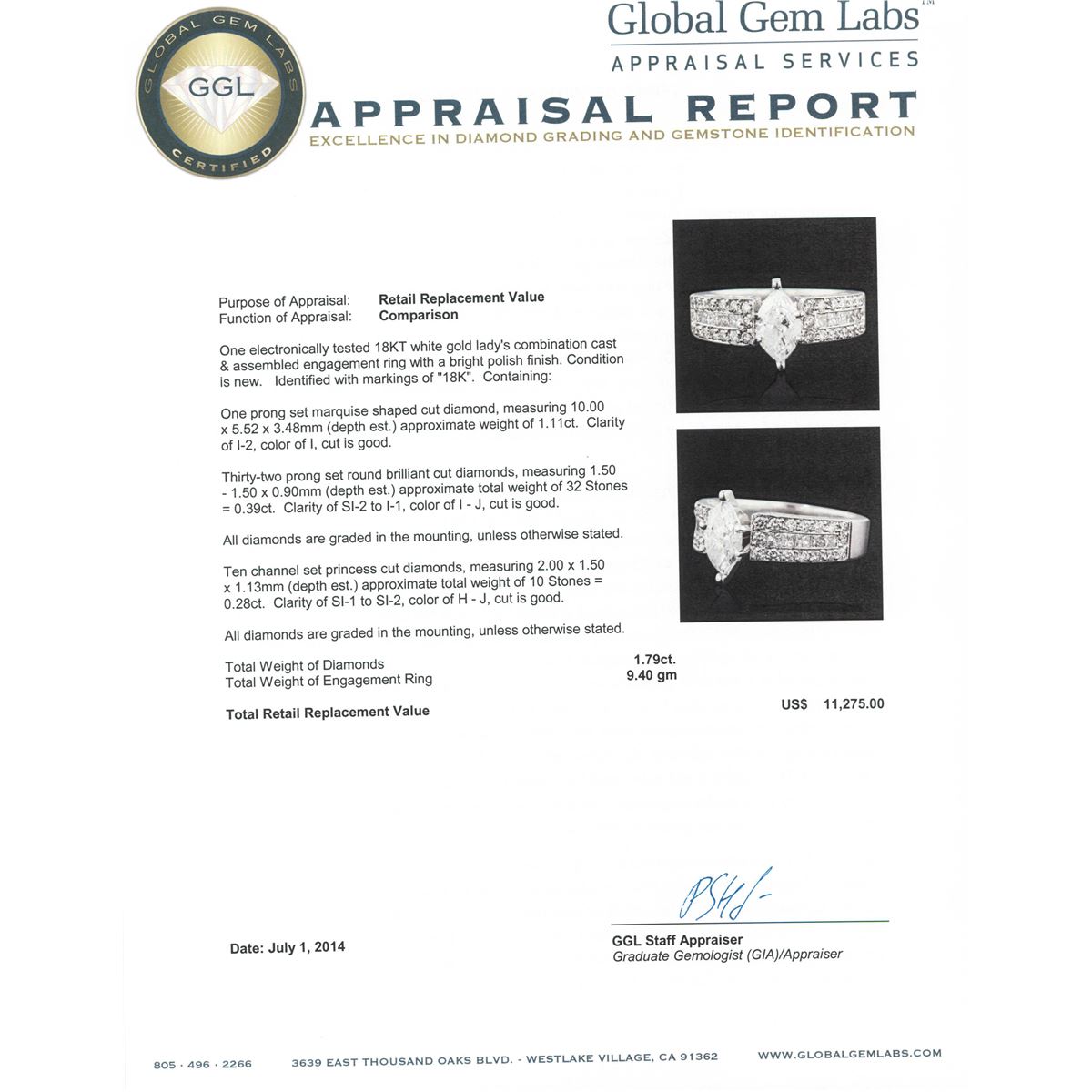 One electronically tested 18KT white gold Ladies combination cast & assembled engagement ring with a bright polish finish. Condition is new. Identified with markings of "18K". Containing: One prong set marquise shaped cut diamond, measuring 10.00 x 5.52 x 3.48mm (depth est.) approximate weight of 1.11ct. Clarity: I-2. Color: I, Cut is Good. Thirty-Two prong set round brilliant cut diamonds, measuring 1.50 - 1.50 x 0.90mm (depth est.) approximate total weight of 32 Stones = 0.39ct. Clarity: SI-2 to I-1. Color: I - J, Cut is Good. All diamonds are graded in the mounting, unless otherwise stated. Ten channel set princess cut diamonds, measuring 2.00 x 1.50 x 1.13mm (depth est.) approximate total weight of 10 Stones = 0.28ct. Clarity: SI-1 to SI-2. Color: H - J, Cut is Good. All diamonds are graded in the mounting, unless otherwise stated. Total Weight of Diamonds 1.79ct. Total Weight of Engagement Ring 9.40 grams. GGL Appraised at $11,275.00.