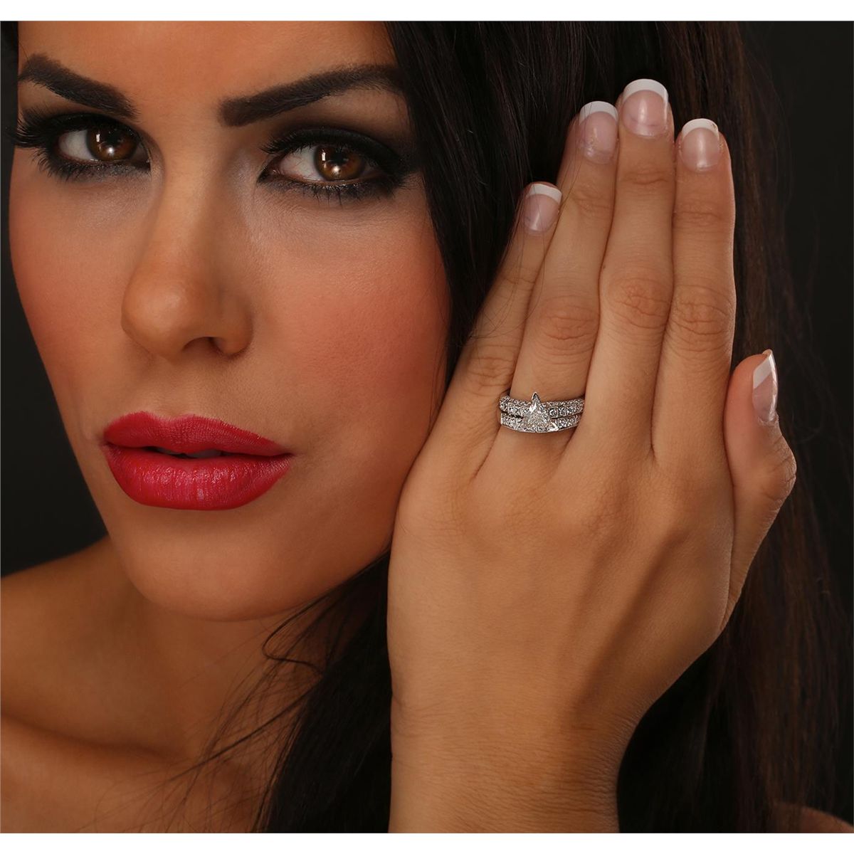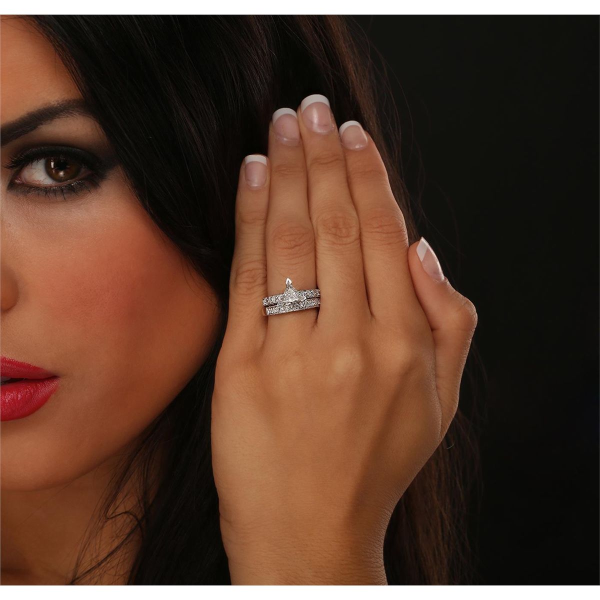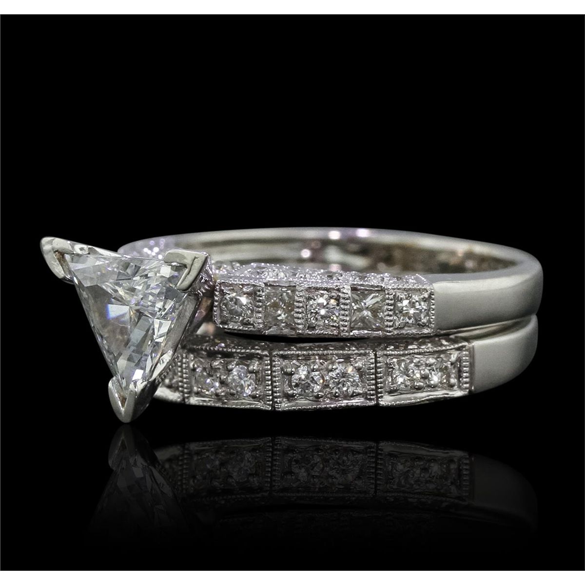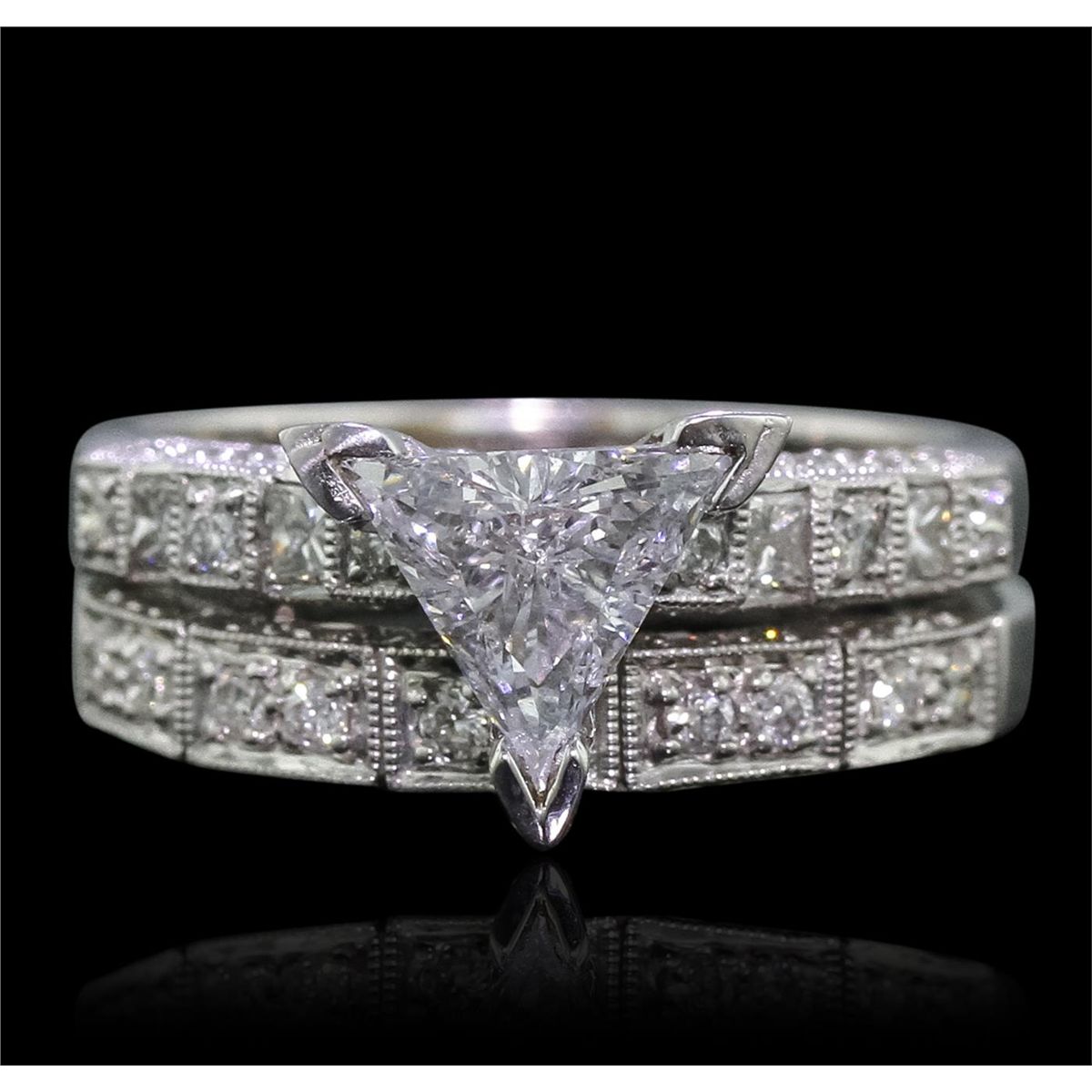 One electronically tested 18KT white gold ladies cast diamond wedding set. Condition is new, good workmanship. The wedding set includes a diamond engagement ring and a diamond wedding band. The engagement ring features a diamond supported by elaborate diamond set shoulders. The set is completed by a matching diamond wedding band. Each ring is completed by a two millimeter wide band. Bright polish finish with milgrain detailing throughout. Identified with markings of "18K 750". Containing: One prong set triangular cut (straight sides) diamond, measuring 9.09 x 8.19 x 2.83mm (depth est.) approximate weight of 1.04ct. Graded loose prior to setting in the EGL Laboratory. Clarity: SI-1. Color: Depth 31.0%. Table 50.0%. Sixty-Two bead and channel set round brilliant and princess cut diamonds approximate. Total Weight of 62 Stones = 0.76ct. Graded in the setting. Clarity: VS-2 to SI-2. Color: G - I. Total Weight of Diamonds 1.80ct. Total Weight of Wedding Set 7.79 grams. AIG Appraised at $30,865.00.