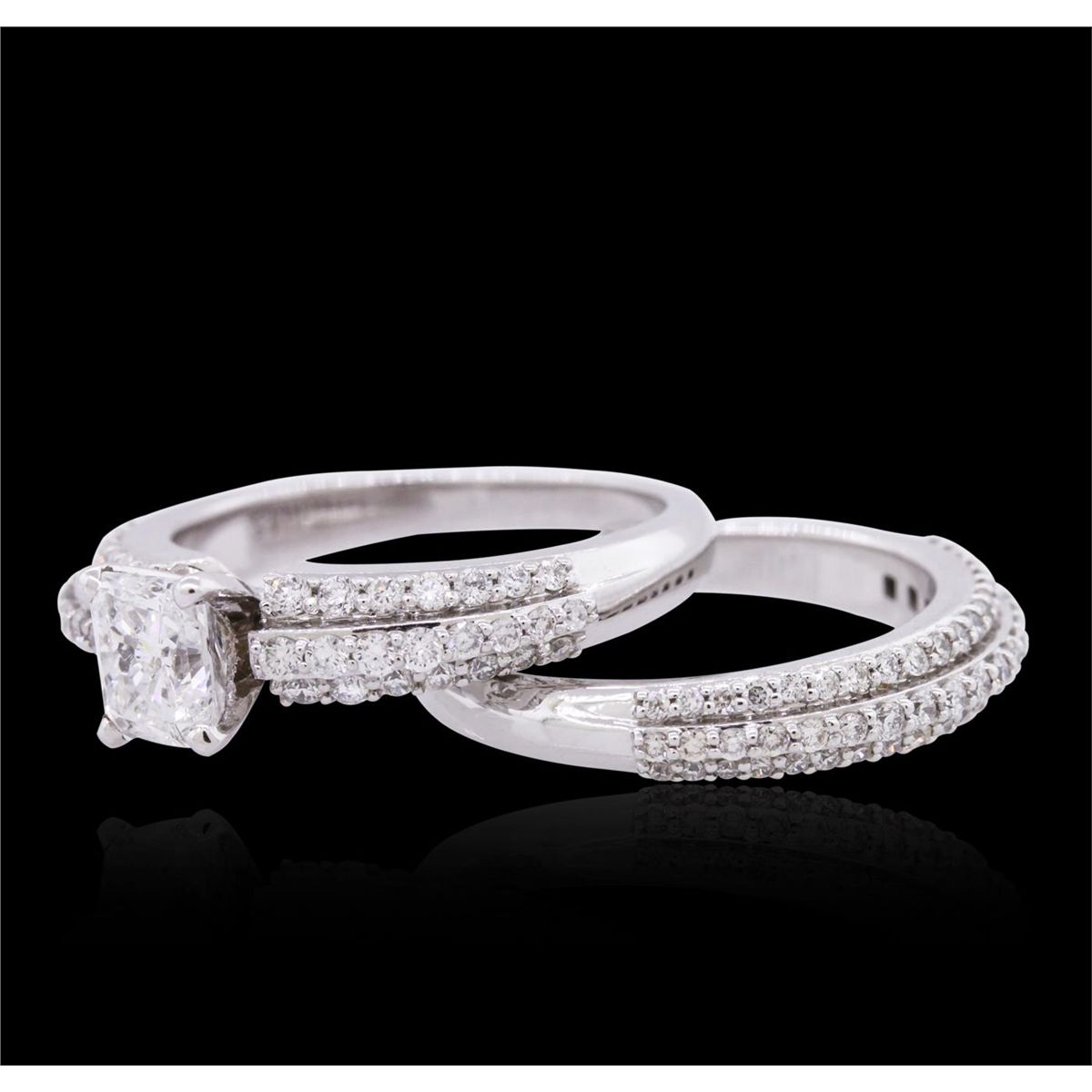One wedding ring set featuring: 18KT white gold weighing 8.54 grams containing one diamond center stone with a total weight of 1.03ct and 103 round diamonds with a total weight of 0.81cts.