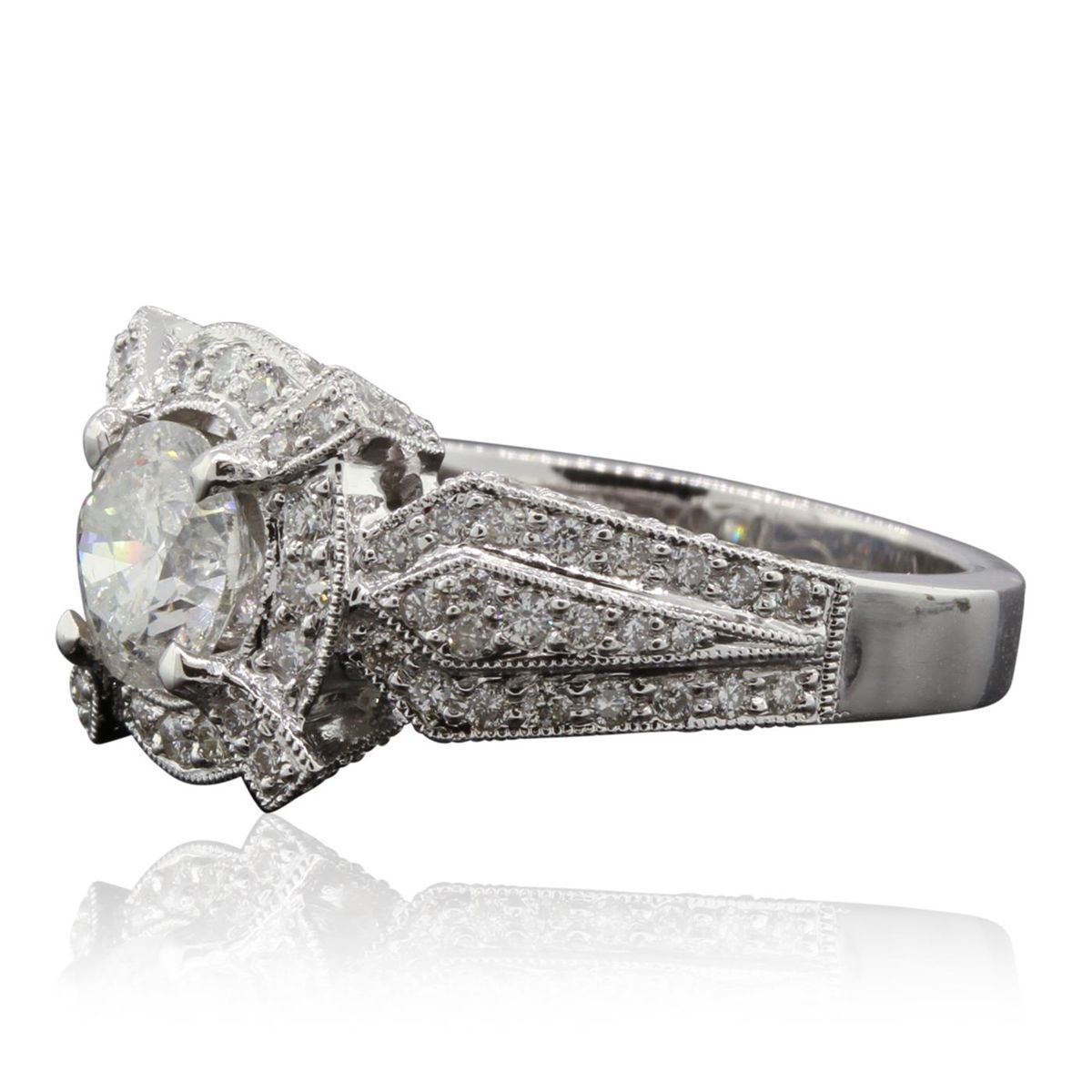 One electronically tested 18KT white gold Ladies combination cast & assembled engagement ring with a bright polish finish. Identified with markings of "18KP". Condition is excellent. Containing: One prong set round brilliant cut diamond, measuring 6.50 - 6.40 x 4.00mm (depth est.) approximate weight of 1.10ct. Clarity of I-2, Color of G, Cut is Good. One Hundred Seven bead set round brilliant cut diamonds, measuring 1.10 - 1.10 x 0.66mm (depth est.) approximate total weight of 107 Stones = 0.75ct. Clarity of VS-2 to SI-1, Color of G - H, Cut is Very Good. Total Weight of Diamonds 1.85ct. Total Weight of Ring 7.80gm. GGL Appraised at $16,930.00.