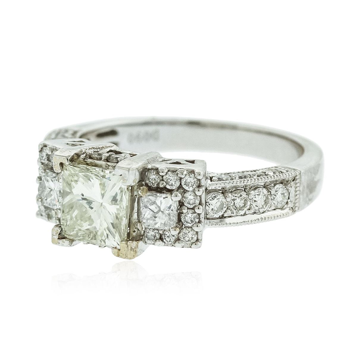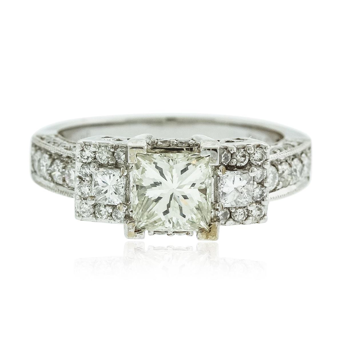One electronically tested 18KT white gold Ladies combination cast & assembled engagement ring with a bright polish finish. Condition is new. Identified with markings of "18K". Containing: One prong set princess cut diamond, measuring 5.81 x 5.75 x 4.05mm (depth est.) approximate weight of 1.11ct. Clarity: SI-1. Color: K, Cut is Good. Two prong set princess cut diamonds, measuring 2.50 x 2.50 x 1.88mm (depth est.) approximate. Total Weight of 2 Stones = 0.19ct. Clarity: SI-2. Color: G - H, Cut is Good. Forty-Four prong set round brilliant cut diamonds, measuring 1.80 - 1.30 x 0.93mm (depth est.) approximate. Total Weight of 44 Stones = 0.60ct. Clarity: SI-2 to I-1. Color: H - I, Cut is Good. Total Weight of Diamonds 1.90ct. Total Weight of Engagement Ring 6.10 grams. GGL Appraised at $16,060.00.