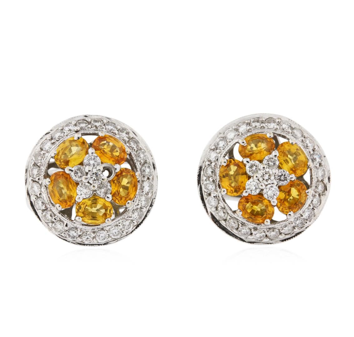 One pair electronically tested 18KT white gold ladies cast & assembled yellow sapphire and diamond earrings with omega backs. Bright polish finish with milgrain detailing. Identified with markings of "18K". Condition is good. Containing: Ten prong set oval mixed cut natural yellow sapphires, measuring 4.00 x 3.00 x 1.95mm, approximate total weight of 1.90ct., clarity is eye clean, type II, medium dark, brownish, orangy yellow color, (GIA oY 6/3), cut is good. Transmitting light with no distortion, transparent. Measurements & the color grade are an average for the group. Graded in the setting. One Hundred Twenty prong set round brilliant cut diamonds, measuring 1.60 - 1.50 x 0.93mm (depth est.) approximate total weight of 120 Stones = 1.73ct. Graded in the setting. Clarity: SI-1 to I-1. Color: G - I. Total Weight of Colored Stones 1.90ct. Total Weight of Diamonds 1.73ct. Total Weight of Earrings 7.60 grams. AIG Appraised at $7,255.00.