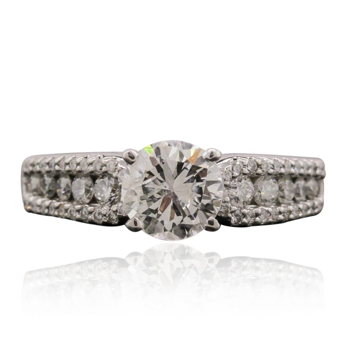 One electronically tested 18KT white gold ladies cast diamond unity ring with a bright polish finish. Condition is good. The featured diamond is supported by diamond set shoulders, completed by a two millimeter wide band. Identified with markings of "18K 750". Containing: One prong set round brilliant cut diamond, measuring 6.35 - 6.30 x 4.20mm (depth est.), 6.00.%. GTCF approximate weight of 1.18ct, laser drilled with a faint blue fluorescence. Graded in the setting. Clarity: I-1. Color: IDepth 66.5%. Table 67.3%. Four channel set round brilliant cut diamonds, measuring 2.20 - 2.10 x 1.29mm (depth est.) approximate. Total Weight of 4 Stones = 0.24ct. Graded in the setting. Clarity: SI-1 to I-1. Color: G - H Six channel set round brilliant cut diamonds, measuring 1.80 - 1.70 x 1.05mm (depth est.) approximate. Total Weight of 6 Stones = 0.21ct. Graded in the setting. Clarity: SI-1 to I-1. Color: G - H Forty-Two prong set round brilliant cut diamonds, measuring 1.10 - 1.00 x 0.63mm (depth est.) approximate. Total Weight of 42 Stones = 0.27ct. Graded in the setting. Clarity: VS-1 to SI-1. Color: G - I. Total Weight of Diamonds 1.90ct. Total Weight of Ring 4.54 grams. AIG Appraised at $20,500.00.