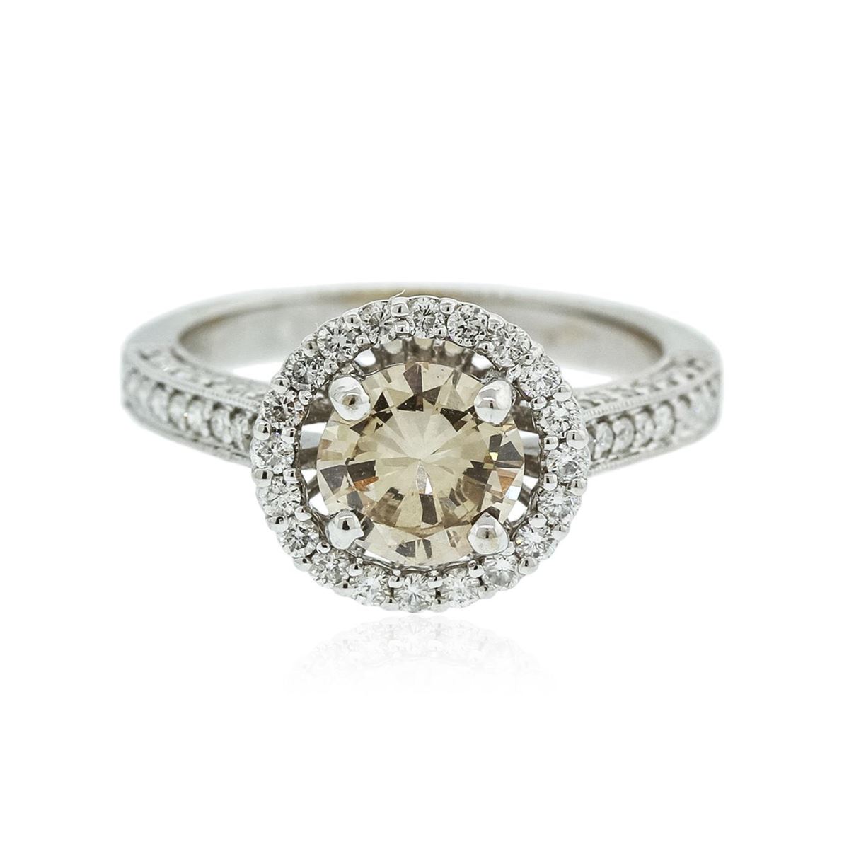 One electronically tested 18KT white gold ladies cast diamond unity ring. Condition is new, good workmanship. The featured diamond is set within a diamond bezel supported by diamond set shoulders, completed by a two and one-half millimeter wide band. Bright polish finish with milgrain detailing. Identified with markings of "18K 750". Containing: One prong set round brilliant cut diamond, measuring 6.90 - 6.85 x 3.70mm (depth est.) approximate weight of 1.13ct with a medium strong blue fluorescence. Graded in the setting. Clarity: VS-2. Depth: 53.8%. Table 72.7%. Sixty-Eight bead and prong set round brilliant cut diamonds, measuring 1.60 - 1.20 x 0.84mm (depth est.) approximate. Total Weight of 68 Stones = 0.78ct. Graded in the setting. Clarity: SI-2 to I-2. Color: G - I. Total Weight of Diamonds 1.91ct. Total Weight of Ring 4.86 grams. AIG Appraised at $13,460.00.