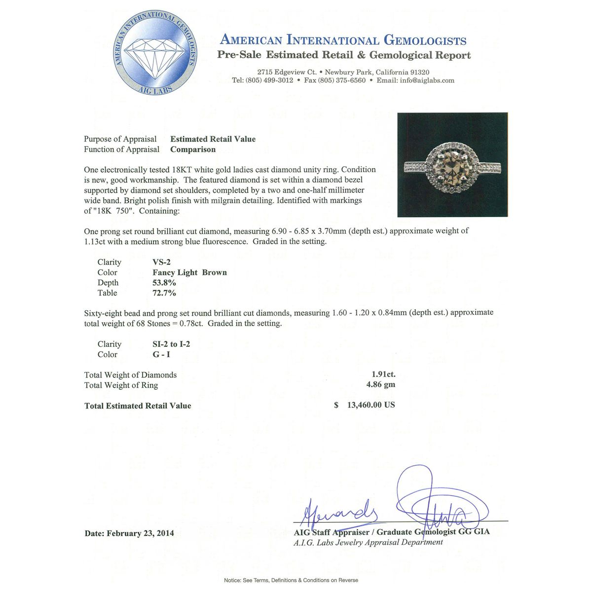 One electronically tested 18KT white gold ladies cast diamond unity ring. Condition is new, good workmanship. The featured diamond is set within a diamond bezel supported by diamond set shoulders, completed by a two and one-half millimeter wide band. Bright polish finish with milgrain detailing. Identified with markings of "18K 750". Containing: One prong set round brilliant cut diamond, measuring 6.90 - 6.85 x 3.70mm (depth est.) approximate weight of 1.13ct with a medium strong blue fluorescence. Graded in the setting. Clarity: VS-2. Depth: 53.8%. Table 72.7%. Sixty-Eight bead and prong set round brilliant cut diamonds, measuring 1.60 - 1.20 x 0.84mm (depth est.) approximate. Total Weight of 68 Stones = 0.78ct. Graded in the setting. Clarity: SI-2 to I-2. Color: G - I. Total Weight of Diamonds 1.91ct. Total Weight of Ring 4.86 grams. AIG Appraised at $13,460.00.