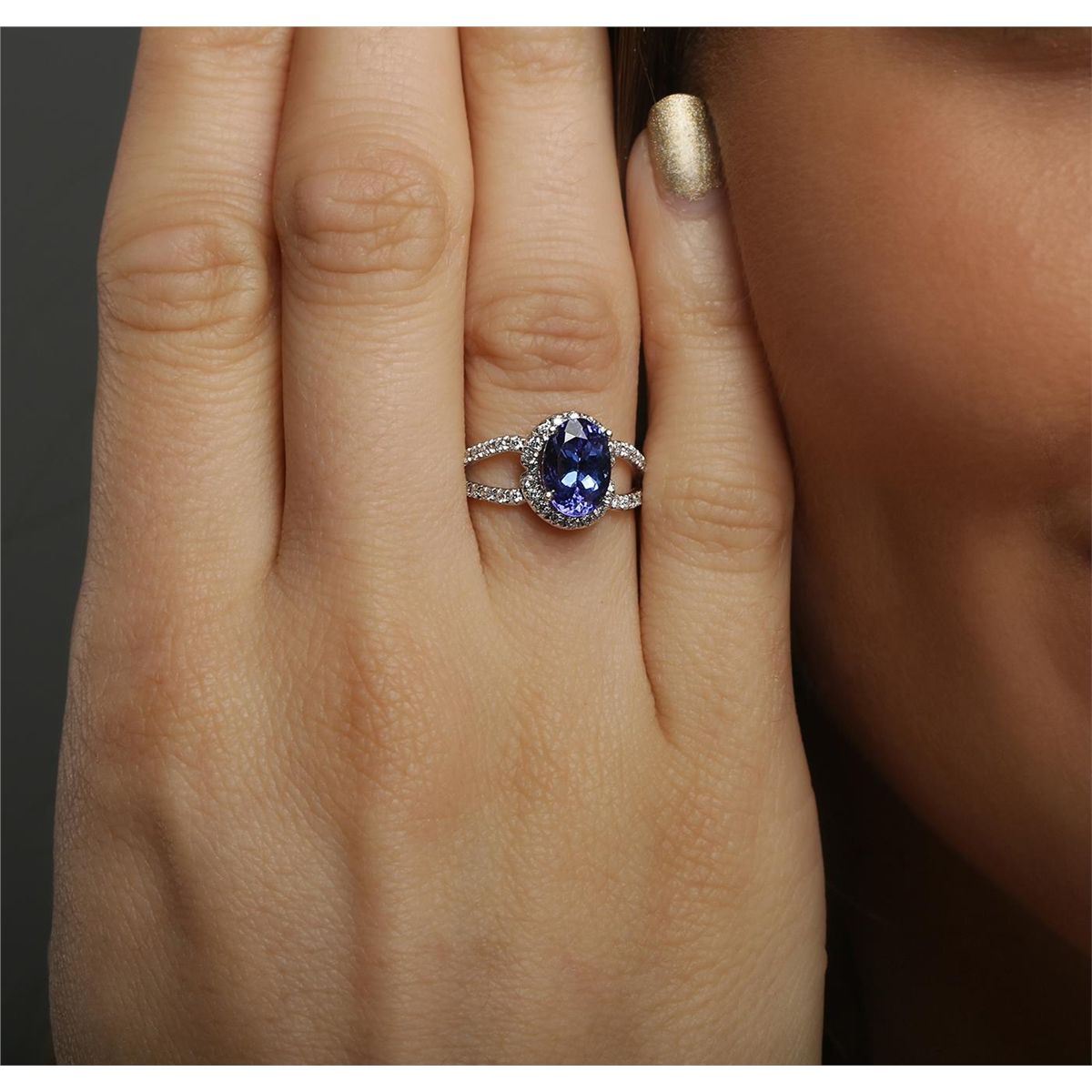 One electronically tested 18KT white gold ladies combination cast & assembled prong set ring with a split shoulder shank with a bright polish finish. Identified with markings of "750". Condition is new. Containing: One prong set oval modified brilliant cut natural tanzanite, measuring 9.06 x 6.48 x 4.76mm, approximate weight of 1.93ct., clarity is eye clean, type I, medium, moderately strong, bluish violet color, (GIA bV 5/4), cut is good. Seventy prong set round brilliant cut diamonds, measuring 1.10 - 1.10 x 0.66mm (depth est.) approximate total weight of 70 Stones = 0.49ct. Clarity: SI-2 to I-1. Color: H - I, Cut is Good. All diamonds and colored gemstones are graded in the mounting, unless otherwise stated, Colored gemstones are presumed to have been subjected to commonly used enhancement processes. Total Weight of Colored Stones 1.93ct. Total Weight of Diamonds 0.49ct. Total Weight of Ring 4.80 grams. GGL Appraised at $6,450.00.