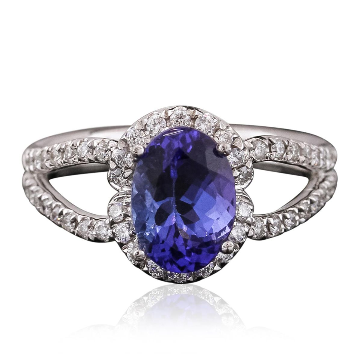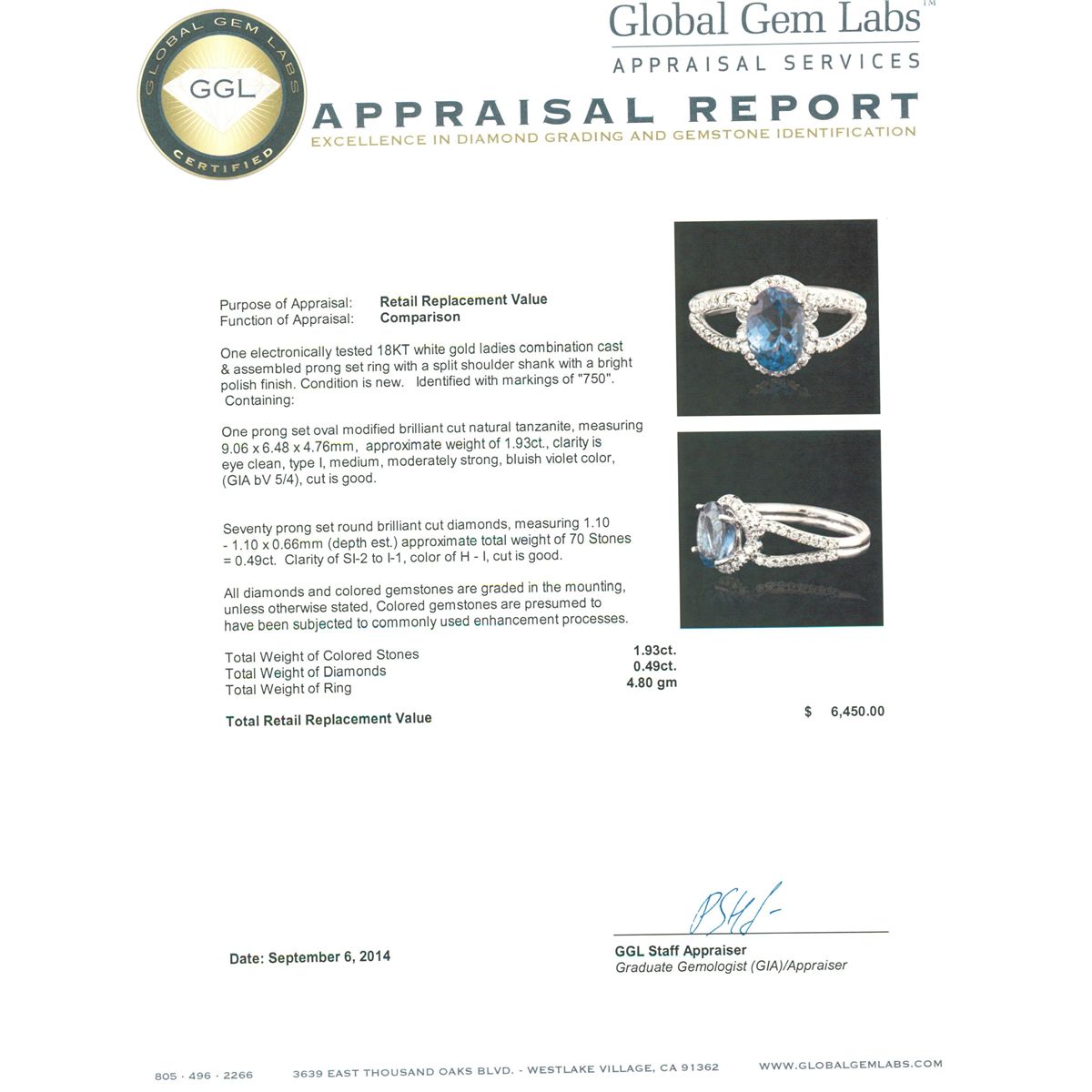 One electronically tested 18KT white gold ladies combination cast & assembled prong set ring with a split shoulder shank with a bright polish finish. Identified with markings of "750". Condition is new. Containing: One prong set oval modified brilliant cut natural tanzanite, measuring 9.06 x 6.48 x 4.76mm, approximate weight of 1.93ct., clarity is eye clean, type I, medium, moderately strong, bluish violet color, (GIA bV 5/4), cut is good. Seventy prong set round brilliant cut diamonds, measuring 1.10 - 1.10 x 0.66mm (depth est.) approximate total weight of 70 Stones = 0.49ct. Clarity: SI-2 to I-1. Color: H - I, Cut is Good. All diamonds and colored gemstones are graded in the mounting, unless otherwise stated, Colored gemstones are presumed to have been subjected to commonly used enhancement processes. Total Weight of Colored Stones 1.93ct. Total Weight of Diamonds 0.49ct. Total Weight of Ring 4.80 grams. GGL Appraised at $6,450.00.