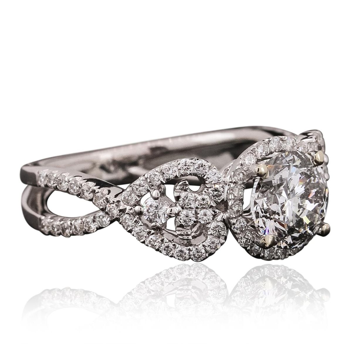 One electronically tested 18KT white gold ladies combination cast & assembled engagement ring with a bright polish finish. Identified with markings of "750". Condition is new. Containing: One prong set round brilliant cut diamond, measuring 6.99 - 6.96 x 4.45mm (depth est.) approximate weight of 1.32ct. Clarity: I-2. Color: I, Cut is Good. Eighty-Eight prong set round brilliant cut diamonds, measuring 1.70 - 1.10 x 0.84mm (depth est.) approximate total weight of 88 Stones = 0.61ct. Clarity: SI-1 to I-1. Color: H - I, Cut is Good. All diamonds are graded in the mounting, unless otherwise stated. Total Weight of Diamonds 1.93ct. Total Weight of Ring 5.40 grams. GGL Appraised at $16,835.00.