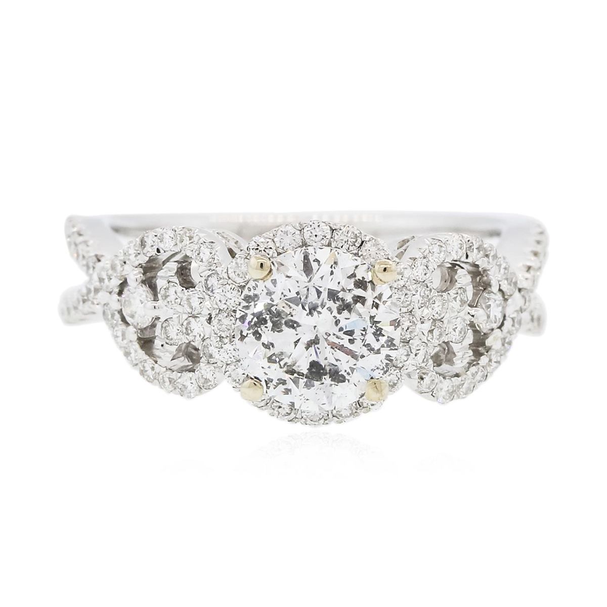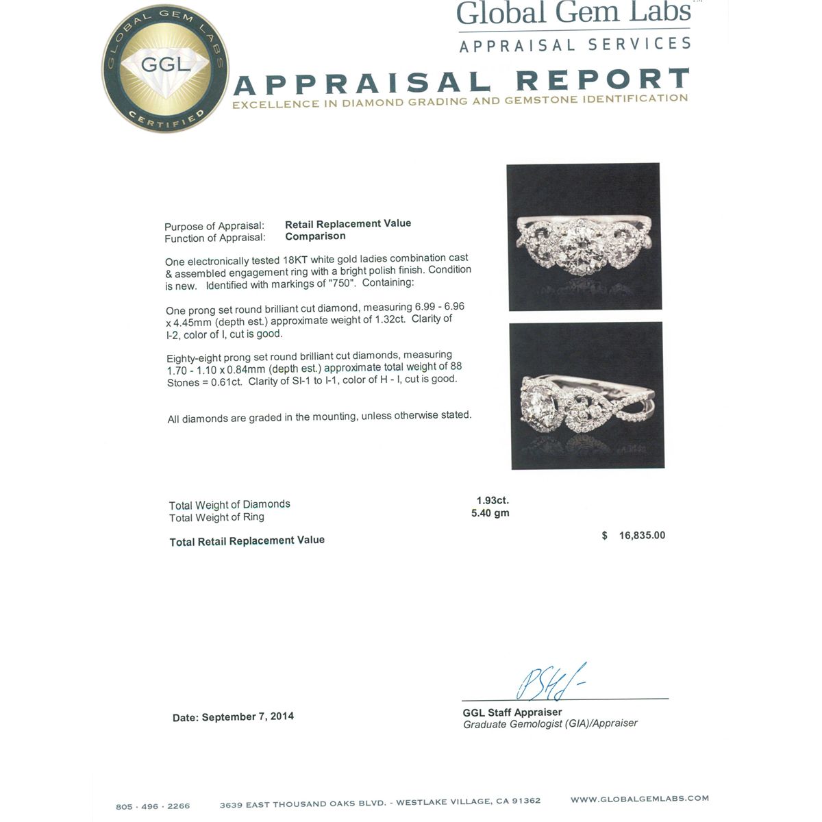 One electronically tested 18KT white gold ladies combination cast & assembled engagement ring with a bright polish finish. Identified with markings of "750". Condition is new. Containing: One prong set round brilliant cut diamond, measuring 6.99 - 6.96 x 4.45mm (depth est.) approximate weight of 1.32ct. Clarity: I-2. Color: I, Cut is Good. Eighty-Eight prong set round brilliant cut diamonds, measuring 1.70 - 1.10 x 0.84mm (depth est.) approximate total weight of 88 Stones = 0.61ct. Clarity: SI-1 to I-1. Color: H - I, Cut is Good. All diamonds are graded in the mounting, unless otherwise stated. Total Weight of Diamonds 1.93ct. Total Weight of Ring 5.40 grams. GGL Appraised at $16,835.00.