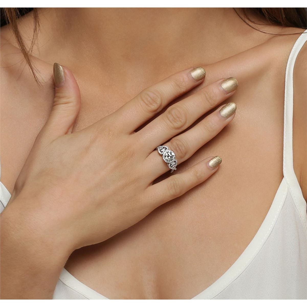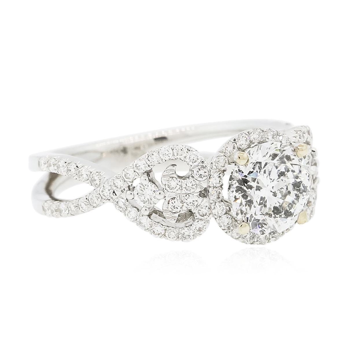 One electronically tested 18KT white gold ladies combination cast & assembled engagement ring with a bright polish finish. Identified with markings of "750". Condition is new. Containing: One prong set round brilliant cut diamond, measuring 6.99 - 6.96 x 4.45mm (depth est.) approximate weight of 1.32ct. Clarity: I-2. Color: I, Cut is Good. Eighty-Eight prong set round brilliant cut diamonds, measuring 1.70 - 1.10 x 0.84mm (depth est.) approximate total weight of 88 Stones = 0.61ct. Clarity: SI-1 to I-1. Color: H - I, Cut is Good. All diamonds are graded in the mounting, unless otherwise stated. Total Weight of Diamonds 1.93ct. Total Weight of Ring 5.40 grams. GGL Appraised at $16,835.00.