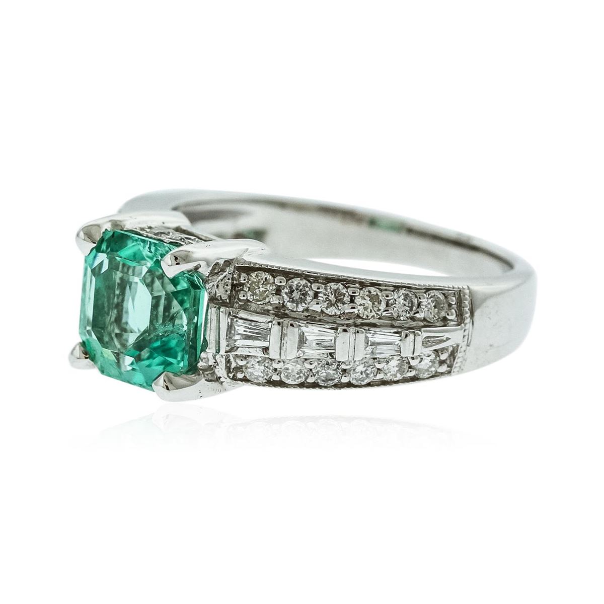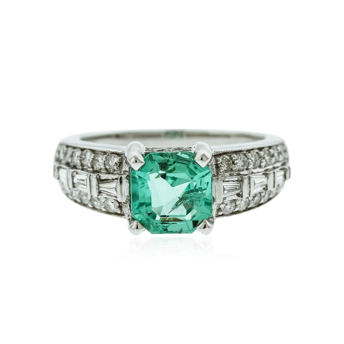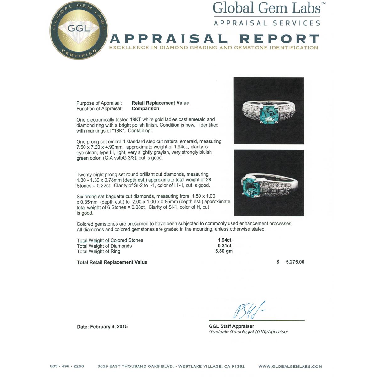 One electronically tested 18KT white gold ladies cast emerald and diamond ring with a bright polish finish. Identified with markings of "18K". Condition is new. Containing: One prong set emerald standard step cut natural emerald, measuring 7.50 x 7.20 x 4.90mm, approximate weight of 1.94ct., clarity is eye clean, type III, light, very slightly grayish, very strongly bluish green color, (GIA vstbG 3/3), cut is good. Twenty-Eight prong set round brilliant cut diamonds, measuring 1.30 - 1.30 x 0.78mm (depth est.) approximate total weight of 28 Stones = 0.22ct. Clarity: SI-2 to I-1. Color: H - I, Cut is Good. Six prong set baguette cut diamonds, measuring from 1.50 x 1.00. x 0.85mm (depth est.) to 2.00. x 1.00. x 0.85mm (depth est.) approximate total weight of 6 Stones = 0.08ct. Clarity: SI-1. Color: H, Cut is Good. Colored gemstones are presumed to have been subjected to commonly used enhancement processes. All diamonds and colored gemstones are graded in the mounting, unless otherwise stated. Total Weight of Colored Stones 1.94ct. Total Weight of Diamonds 0.31ct. Total Weight of Ring 6.80 grams. GGL Appraised at $5,275.00.