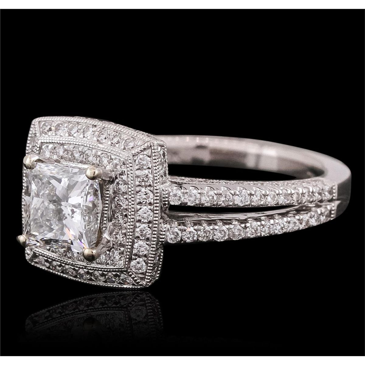 One electronically tested 18KT white gold ladies combination cast & assembled engagement ring with a bright polish finish. Identified with markings of "18K". Condition is new. Containing: One prong set princess cut diamond, measuring 5.62 x 5.54 x 4.16mm (depth est.) approximate weight of 1.06ct. Clarity: I-1. Color: J, Cut is Good. One Hundred Forty-Seven prong set round brilliant cut diamonds, measuring 1.20 - 1.20 x 0.72mm (depth est.) approximate total weight of 147 Stones = 0.93ct. Clarity: SI-2 to I-1. Color: I - J, Cut is Good. All diamonds are graded in the mounting, unless otherwise stated. Total Weight of Diamonds 1.99ct. Total Weight of Ring 6.30 grams. GGL Appraised at $15,575.00.