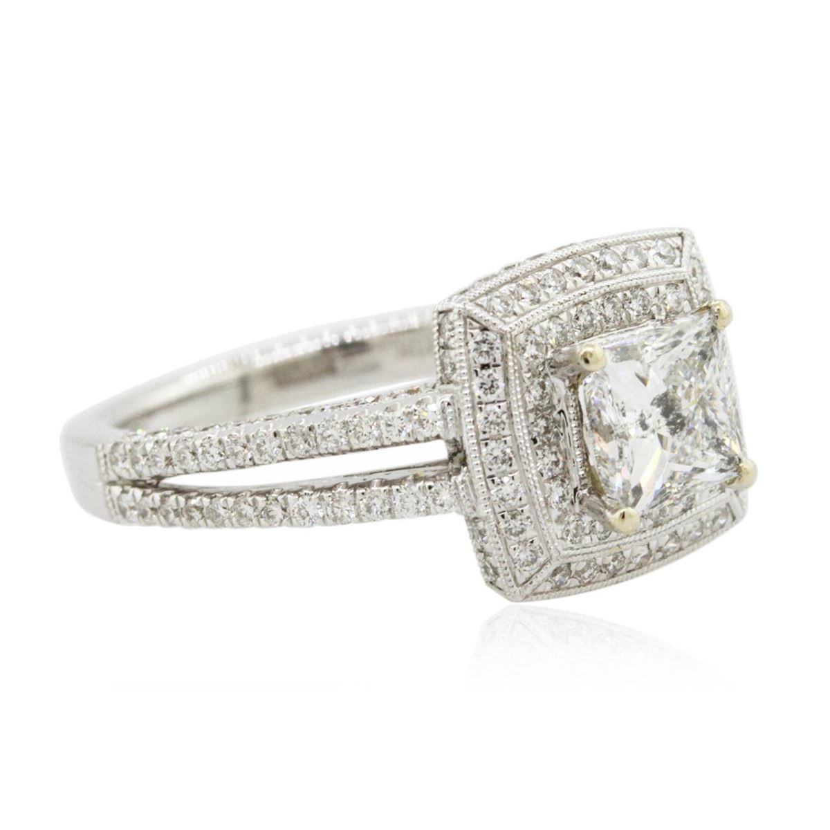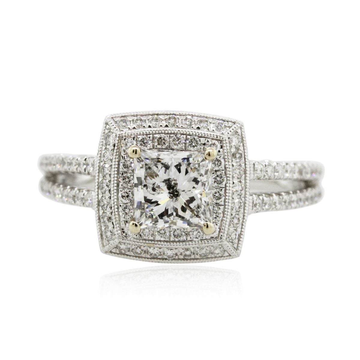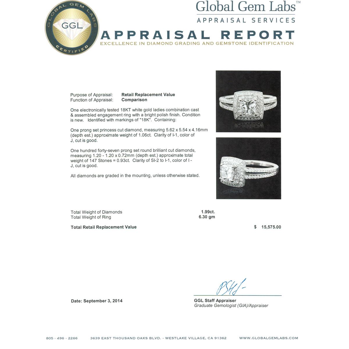 One electronically tested 18KT white gold ladies combination cast & assembled engagement ring with a bright polish finish. Identified with markings of "18K". Condition is new. Containing: One prong set princess cut diamond, measuring 5.62 x 5.54 x 4.16mm (depth est.) approximate weight of 1.06ct. Clarity: I-1. Color: J, Cut is Good. One Hundred Forty-Seven prong set round brilliant cut diamonds, measuring 1.20 - 1.20 x 0.72mm (depth est.) approximate total weight of 147 Stones = 0.93ct. Clarity: SI-2 to I-1. Color: I - J, Cut is Good. All diamonds are graded in the mounting, unless otherwise stated. Total Weight of Diamonds 1.99ct. Total Weight of Ring 6.30 grams. GGL Appraised at $15,575.00.