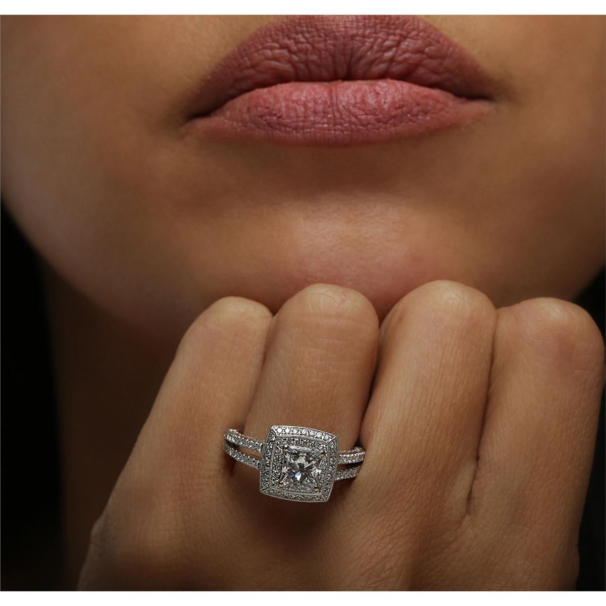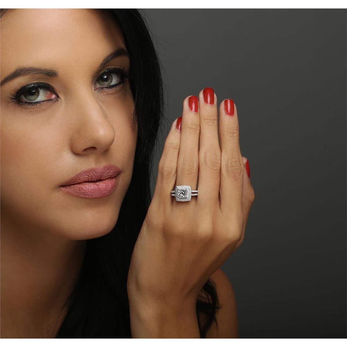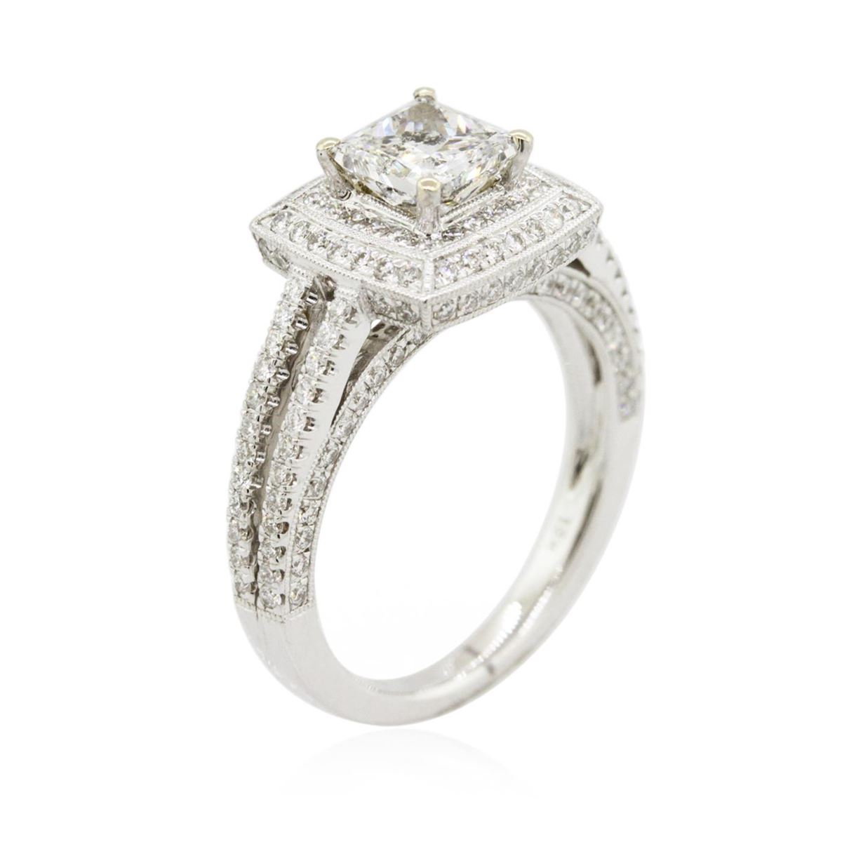 One electronically tested 18KT white gold ladies combination cast & assembled engagement ring with a bright polish finish. Identified with markings of "18K". Condition is new. Containing: One prong set princess cut diamond, measuring 5.62 x 5.54 x 4.16mm (depth est.) approximate weight of 1.06ct. Clarity: I-1. Color: J, Cut is Good. One Hundred Forty-Seven prong set round brilliant cut diamonds, measuring 1.20 - 1.20 x 0.72mm (depth est.) approximate total weight of 147 Stones = 0.93ct. Clarity: SI-2 to I-1. Color: I - J, Cut is Good. All diamonds are graded in the mounting, unless otherwise stated. Total Weight of Diamonds 1.99ct. Total Weight of Ring 6.30 grams. GGL Appraised at $15,575.00.