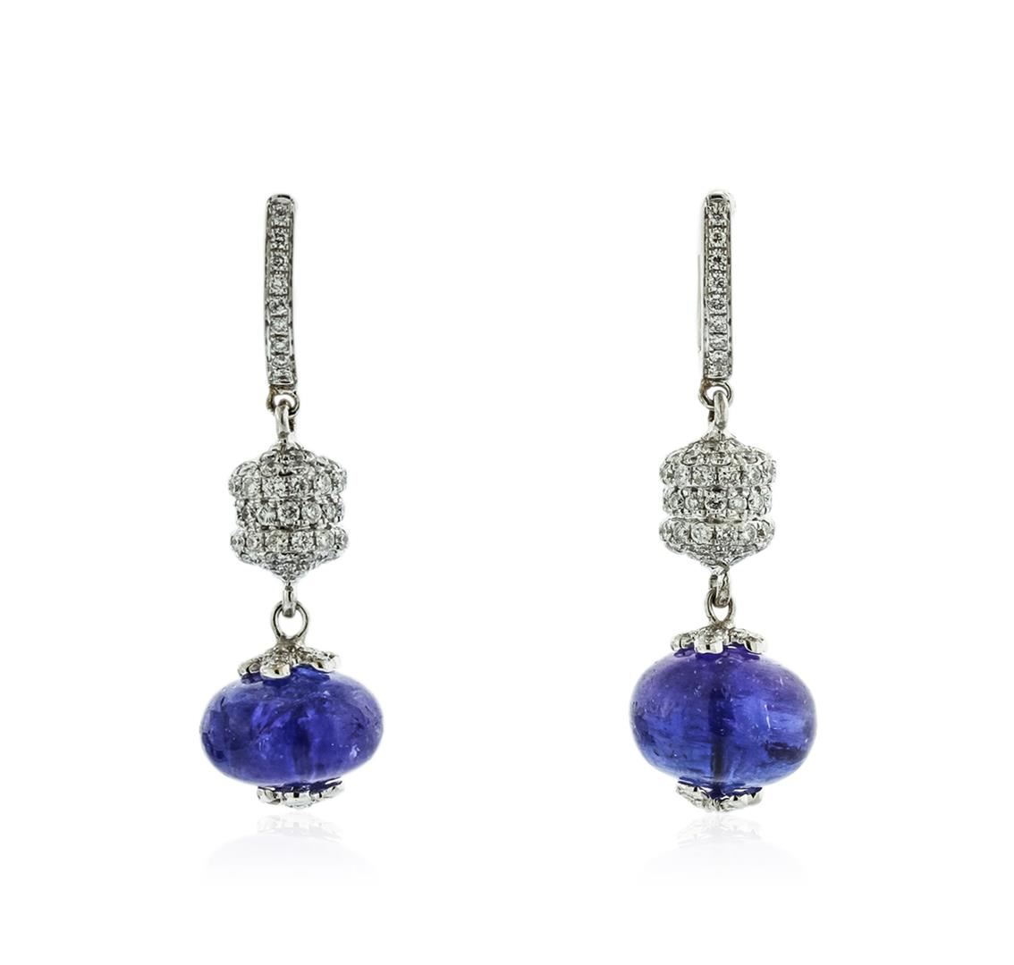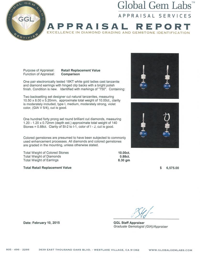 One pair electronically tested 18KT white gold ladies cast tanzanite and diamond earrings with hinged clip backs with a bright polish finish. Identified with markings of "750". Condition is new. Containing: Two backsetting set designer cut natural tanzanites, measuring 10.50 x 8.00 x 5.20mm, approximate total weight of 10.00ct., clarity is moderately included, type I, medium, moderately strong, violet color, (GIA V 5/4), cut is good. One Hundred Forty prong set round brilliant cut diamonds, measuring 1.20 - 1.20 x 0.72mm (depth est.) approximate total weight of 140 Stones = 0.88ct. Clarity: SI-2 to I-1. Color: I - J, Cut is Good. Colored gemstones are presumed to have been subjected to commonly used enhancement processes. All diamonds and colored gemstones are graded in the mounting, unless otherwise stated. Total Weight of Colored Stones 10.00ct. Total Weight of Diamonds 0.88ct. Total Weight of Earrings 8.30 grams. GGL Appraised at $6,575.00.