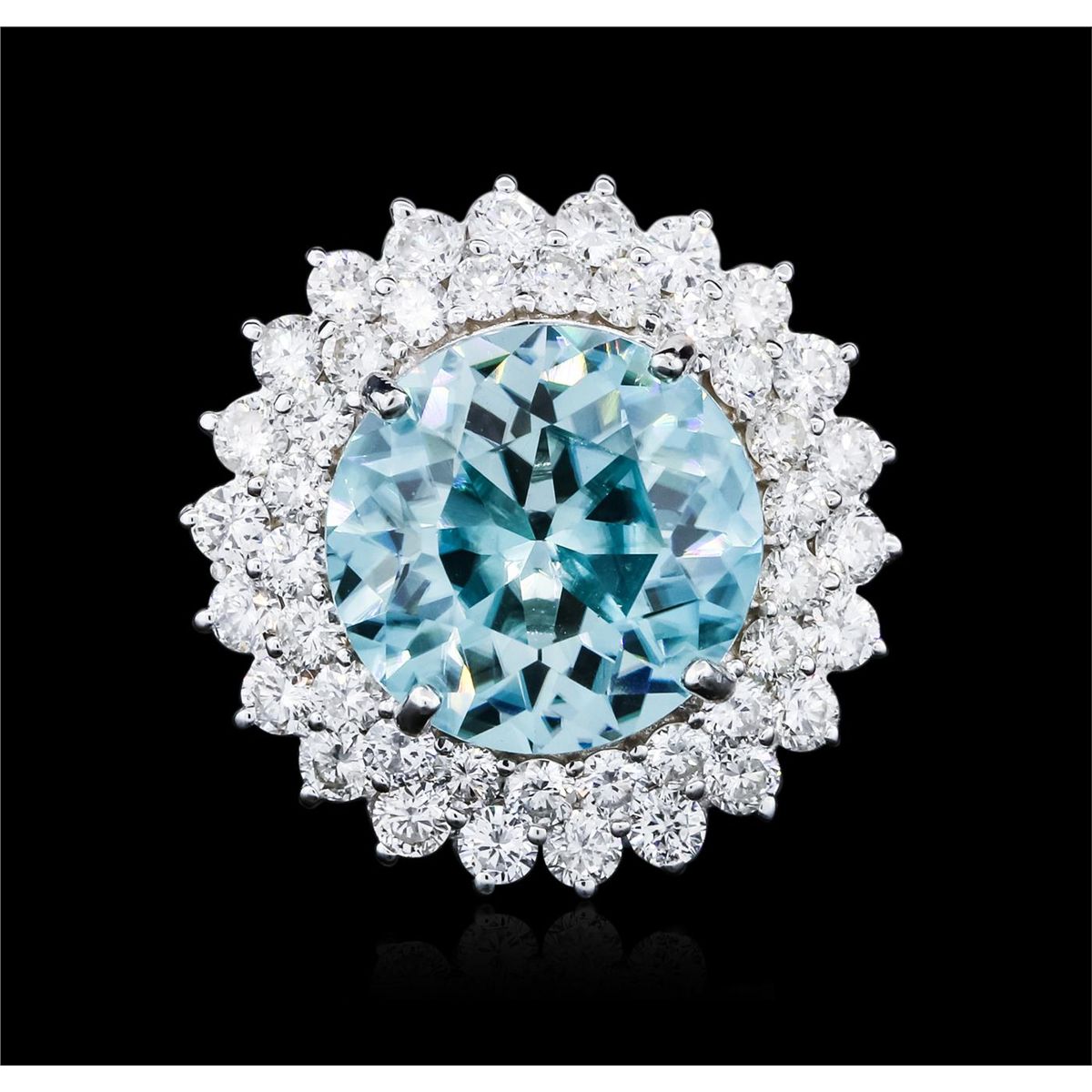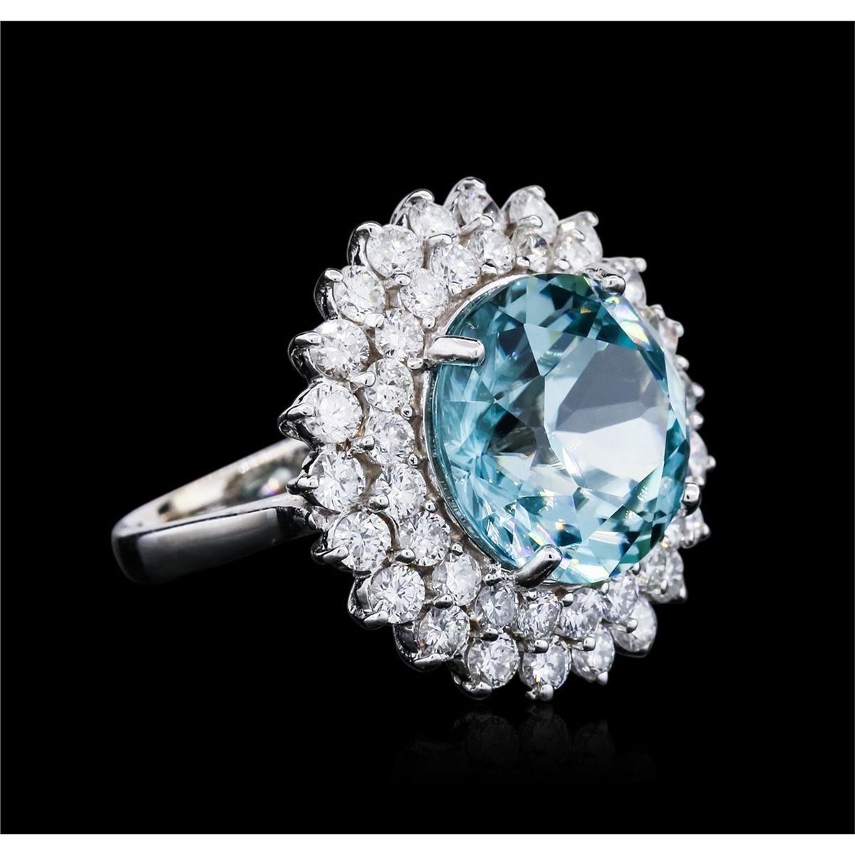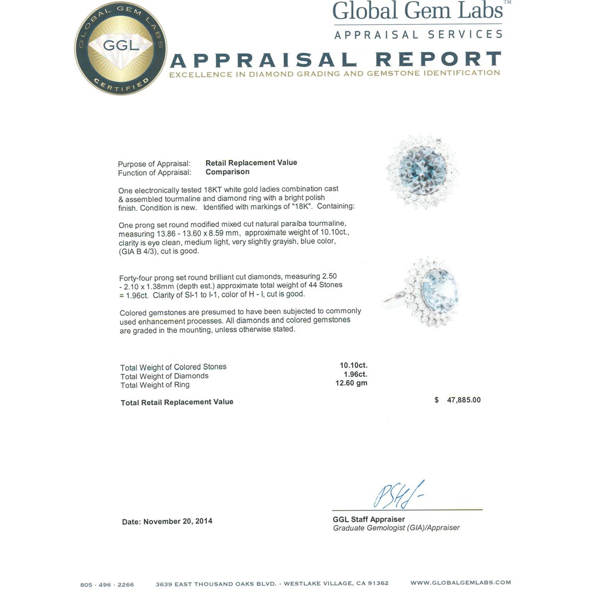 One electronically tested 18KT white gold ladies combination cast & assembled tourmaline and diamond ring with a bright polish finish. Identified with markings of "18K". Condition is new. Containing: One prong set round modified mixed cut natural paraiba tourmaline, measuring 13.86 - 13.60 x 8.59 mm, approximate weight of 10.10ct., clarity is eye clean, medium light, very slightly grayish, blue color, (GIA B 4/3), cut is good. Forty-Four prong set round brilliant cut diamonds, measuring 2.50 - 2.10 x 1.38mm (depth est.) approximate total weight of 44 Stones = 1.96ct. Clarity: SI-1 to I-1. Color: H - I, Cut is Good. Colored gemstones are presumed to have been subjected to commonly used enhancement processes. All diamonds and colored gemstones are graded in the mounting, unless otherwise stated. Total Weight of Colored Stones 10.10ct. Total Weight of Diamonds 1.96ct. Total Weight of Ring 12.60 grams. GGL Appraised at $47,885.00.
