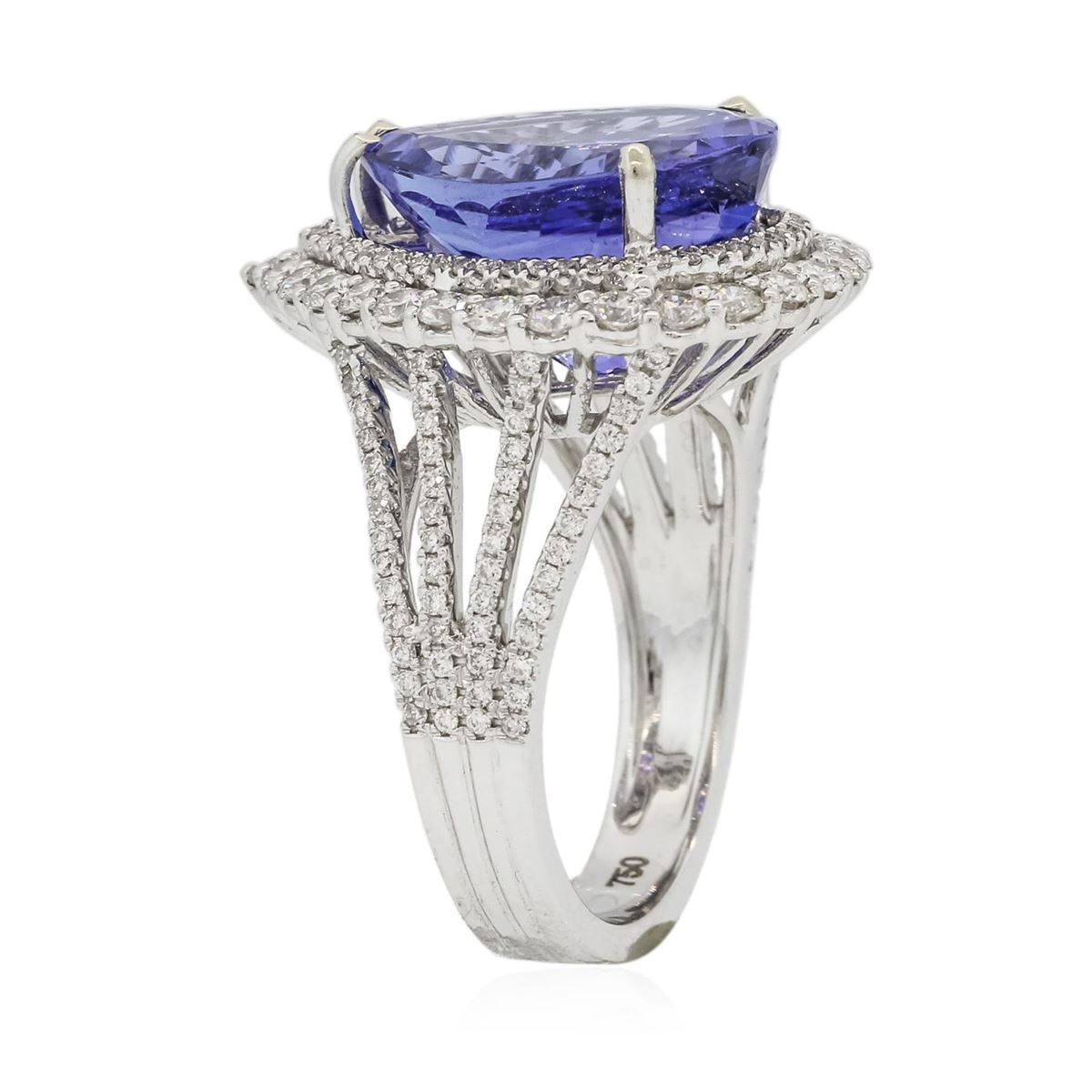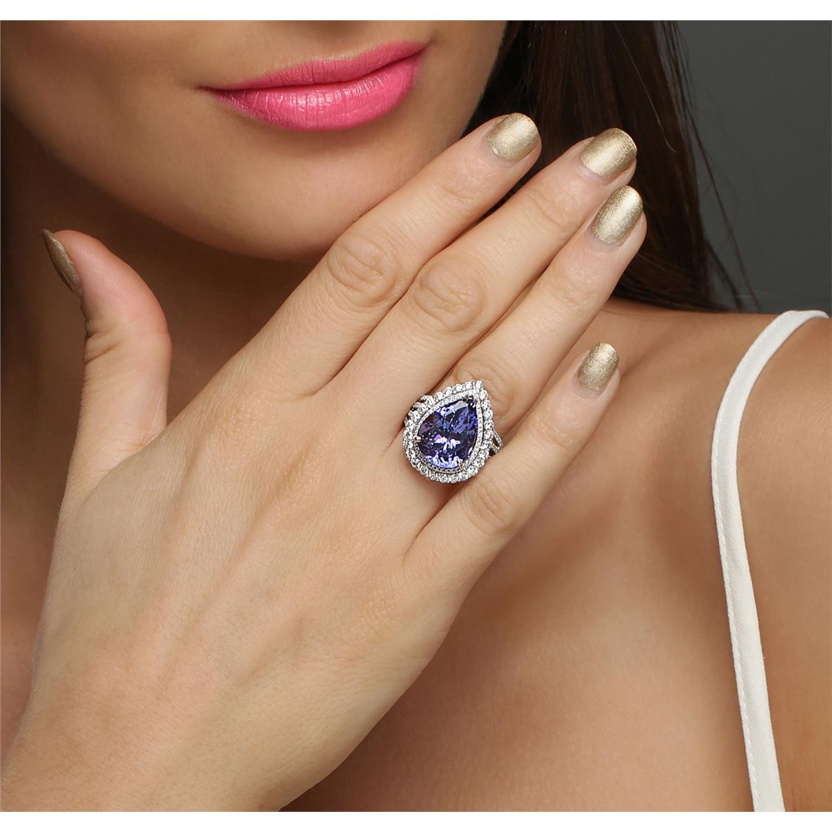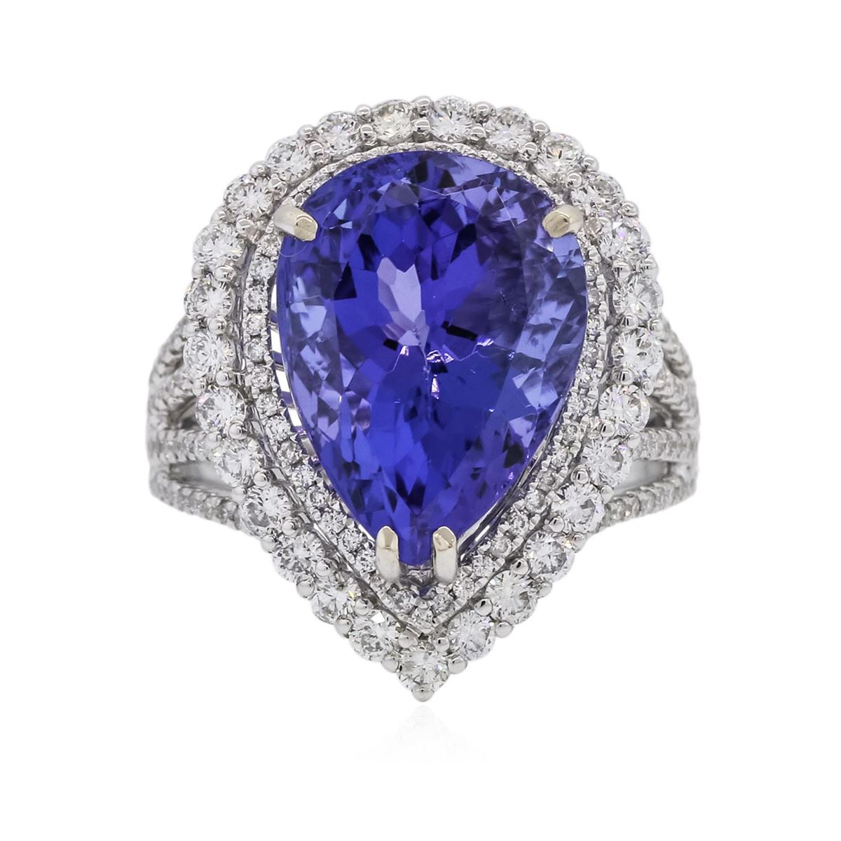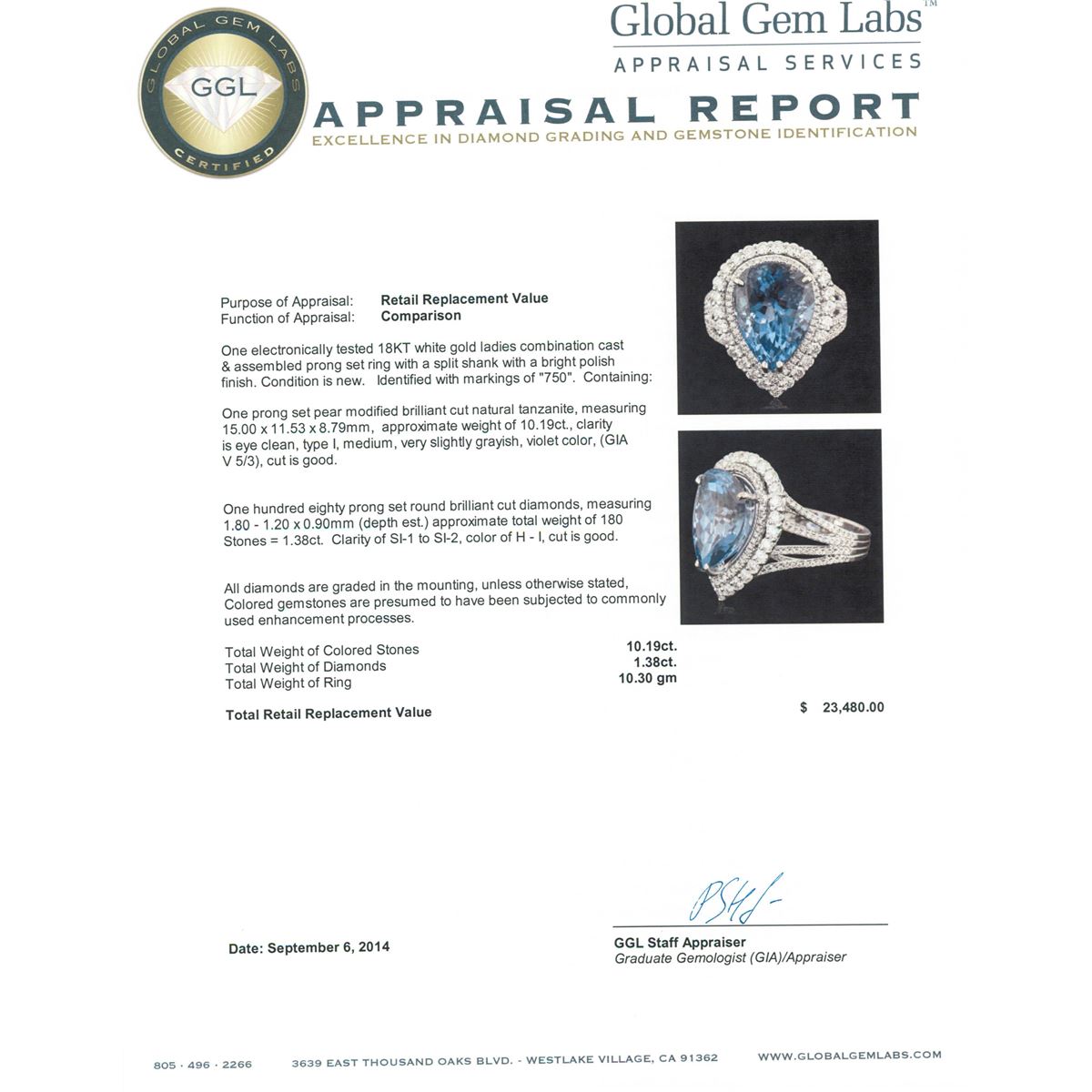 One electronically tested 18KT white gold ladies combination cast & assembled prong set ring with a split shank with a bright polish finish. Identified with markings of "750". Condition is new. Containing: One prong set pear modified brilliant cut natural tanzanite, measuring 15.00 x 11.53 x 8.79mm, approximate weight of 10.19ct., clarity is eye clean, type I, medium, very slightly grayish, violet color, (GIA V 5/3), cut is good. One Hundred Eighty prong set round brilliant cut diamonds, measuring 1.80 - 1.20 x 0.90mm (depth est.) approximate total weight of 180 Stones = 1.38ct. Clarity: SI-1 to SI-2. Color: H - I, Cut is Good. All diamonds are graded in the mounting, unless otherwise stated, Colored gemstones are presumed to have been subjected to commonly used enhancement processes. Total Weight of Colored Stones 10.19ct. Total Weight of Diamonds 1.38ct. Total Weight of Ring 10.30 grams. GGL Appraised at $23,480.00.