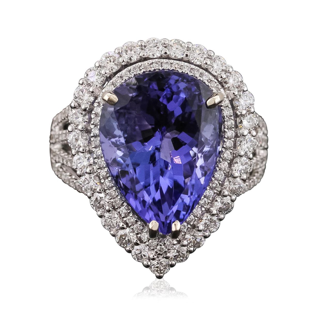 One electronically tested 18KT white gold ladies combination cast & assembled prong set ring with a split shank with a bright polish finish. Identified with markings of "750". Condition is new. Containing: One prong set pear modified brilliant cut natural tanzanite, measuring 15.00 x 11.53 x 8.79mm, approximate weight of 10.19ct., clarity is eye clean, type I, medium, very slightly grayish, violet color, (GIA V 5/3), cut is good. One Hundred Eighty prong set round brilliant cut diamonds, measuring 1.80 - 1.20 x 0.90mm (depth est.) approximate total weight of 180 Stones = 1.38ct. Clarity: SI-1 to SI-2. Color: H - I, Cut is Good. All diamonds are graded in the mounting, unless otherwise stated, Colored gemstones are presumed to have been subjected to commonly used enhancement processes. Total Weight of Colored Stones 10.19ct. Total Weight of Diamonds 1.38ct. Total Weight of Ring 10.30 grams. GGL Appraised at $23,480.00.