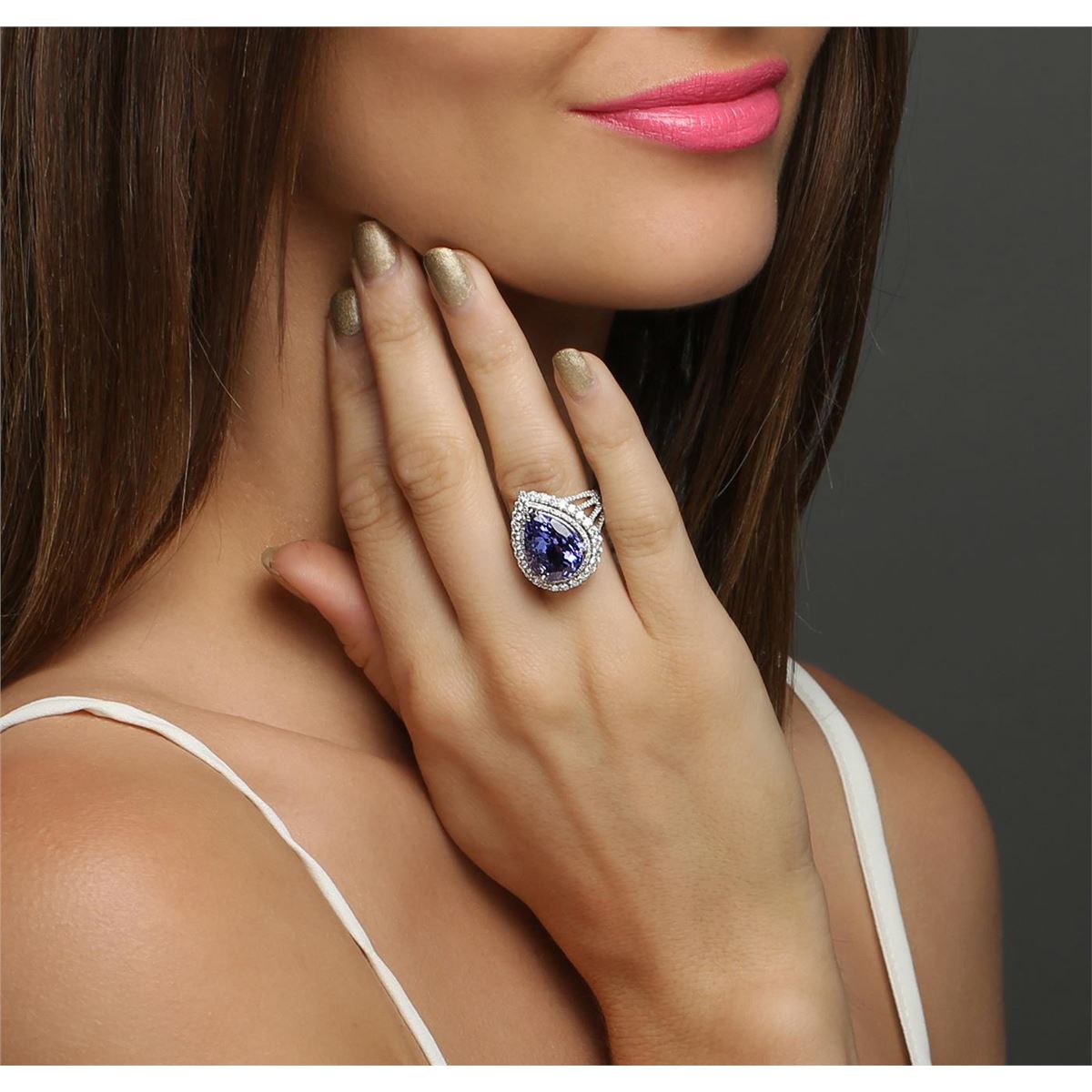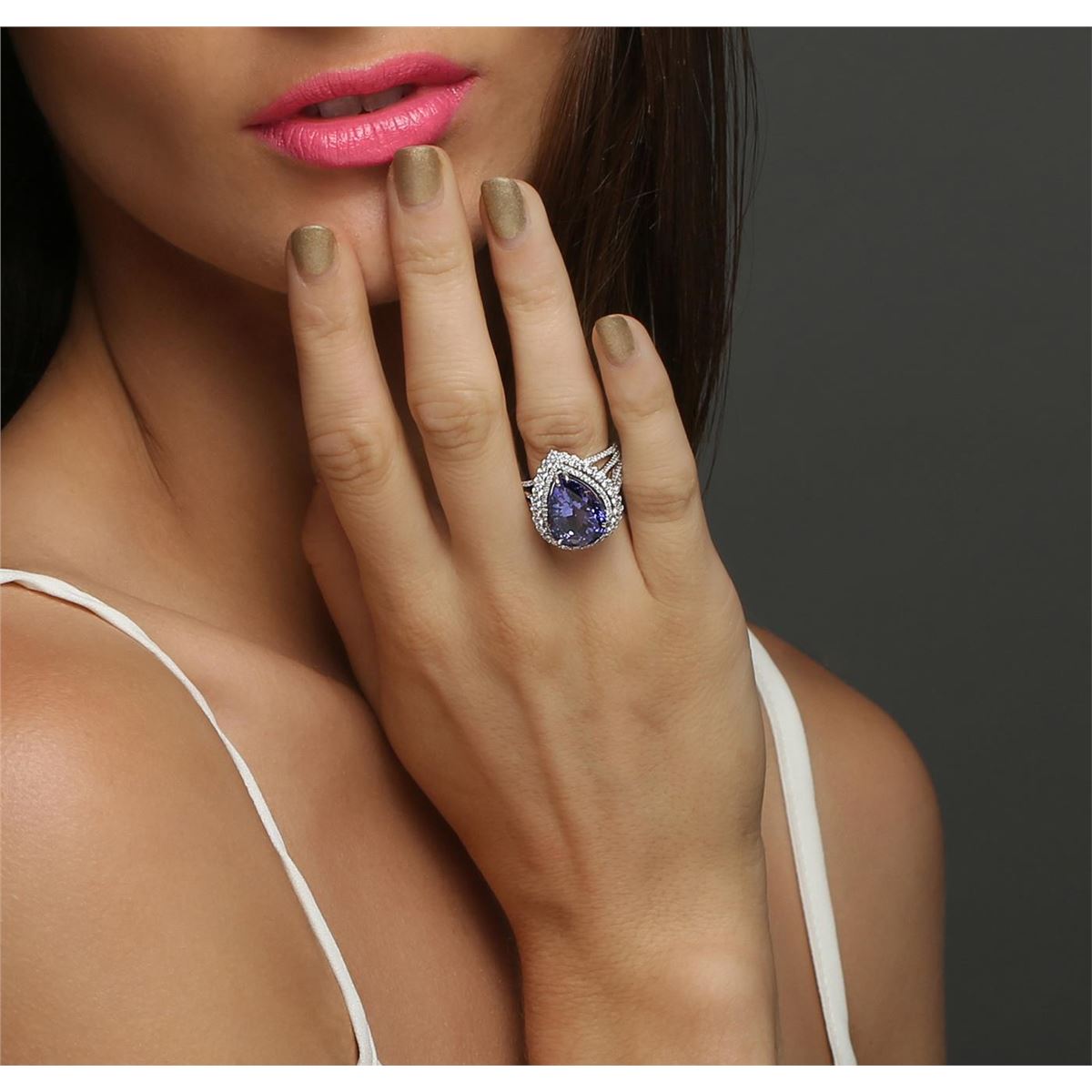 One electronically tested 18KT white gold ladies combination cast & assembled prong set ring with a split shank with a bright polish finish. Identified with markings of "750". Condition is new. Containing: One prong set pear modified brilliant cut natural tanzanite, measuring 15.00 x 11.53 x 8.79mm, approximate weight of 10.19ct., clarity is eye clean, type I, medium, very slightly grayish, violet color, (GIA V 5/3), cut is good. One Hundred Eighty prong set round brilliant cut diamonds, measuring 1.80 - 1.20 x 0.90mm (depth est.) approximate total weight of 180 Stones = 1.38ct. Clarity: SI-1 to SI-2. Color: H - I, Cut is Good. All diamonds are graded in the mounting, unless otherwise stated, Colored gemstones are presumed to have been subjected to commonly used enhancement processes. Total Weight of Colored Stones 10.19ct. Total Weight of Diamonds 1.38ct. Total Weight of Ring 10.30 grams. GGL Appraised at $23,480.00.