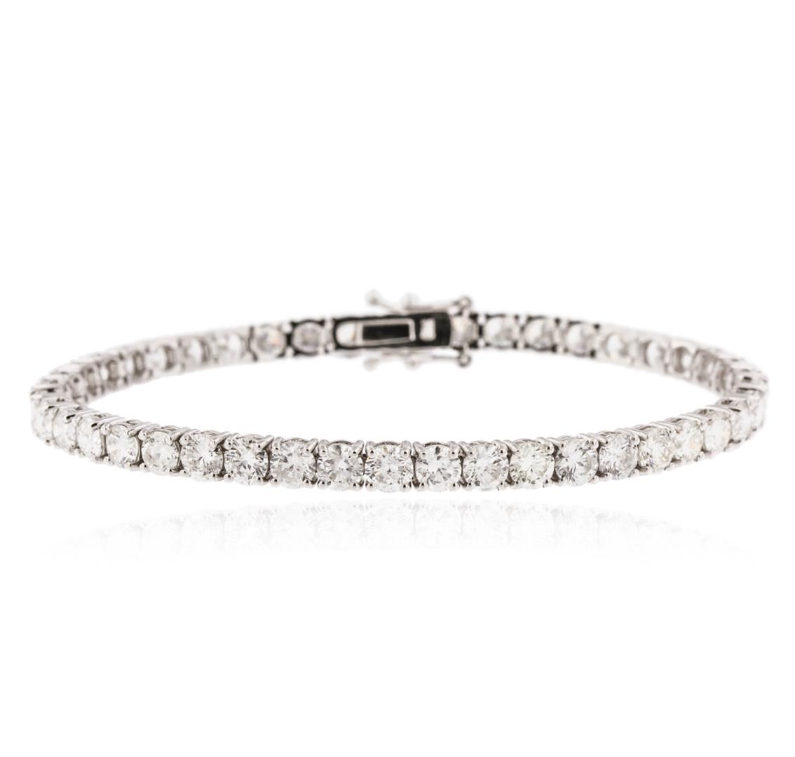 One electronically tested 18KT white gold ladies cast diamond tennis bracelet with a hidden box clasp with safety closer with a bright polish finish. Measurements: 7" in length Identified with markings of "750". Condition is new. Containing: Forty-Four prong set round brilliant cut diamonds, measuring 4.00 - 4.00 x 2.40mm (depth est.) approximate total weight of 44 Stones = 10.31ct. Clarity: SI-2 to I-1. Color: G - I, Cut is Good. All diamonds are graded in the mounting, unless otherwise stated. Total Weight of Diamonds 10.31ct. Total Weight of Tennis Bracelet 13.80 grams. GGL Appraised at $24,585.00.