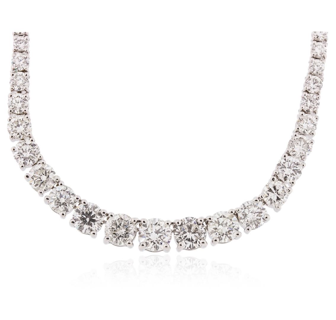 One electronically tested 18KT white gold ladies cast diamond necklace with a hidden box clasp with safety closer with a bright polish finish. Measurements: 16.25" in length Identified with markings of "750". Condition is new. Containing: Fifteen prong set round brilliant cut diamonds, measuring 4.50 - 3.80 x 2.49mm (depth est.) approximate total weight of 15 Stones = 3.92ct. Clarity: SI-1 to SI-2. Color: I - J, Cut is Good. One Hundred Forty prong set round brilliant cut diamonds, measuring 2.50 - 2.20 x 1.41mm (depth est.) approximate total weight of 140 Stones = 6.65ct. Clarity: SI-1 to I-1. Color: I - J, Cut is Good. All diamonds are graded in the mounting, unless otherwise stated. Total Weight of Diamonds 10.57ct. Total Weight of Necklace 19.00 grams. GGL Appraised at $23,525.00.