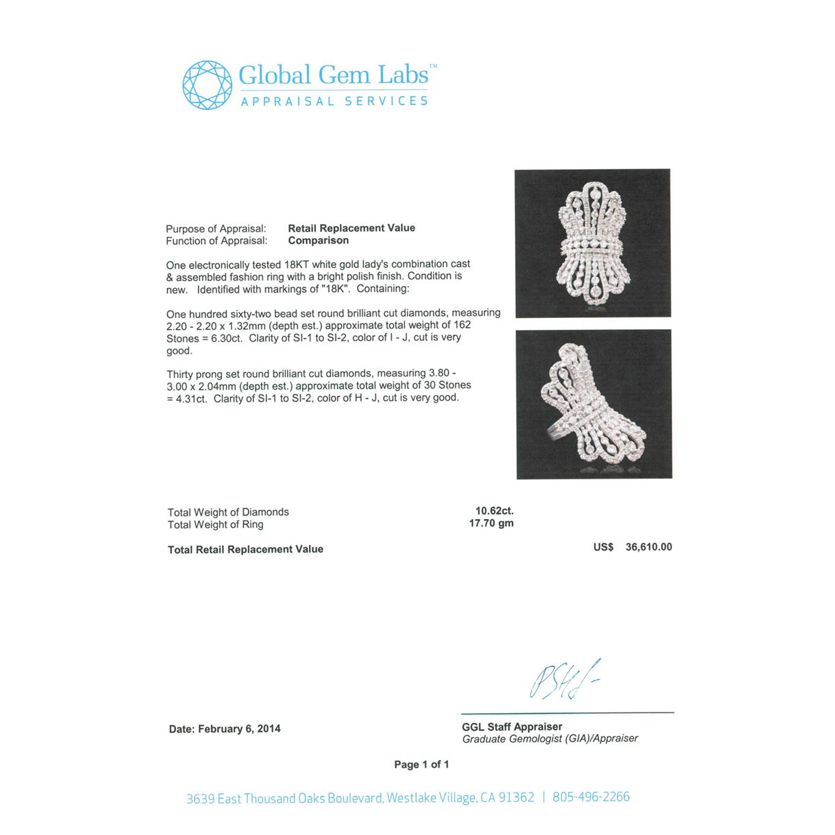 One electronically tested 18KT white gold Ladies combination cast & assembled fashion ring with a bright polish finish. Identified with markings of "18K". Condition is new. Containing: One Hundred Sixty-Two bead set round brilliant cut diamonds, measuring 2.20 - 2.20 x 1.32mm (depth est.) approximate total weight of 162 Stones = 6.30ct. Clarity of SI-1 to SI-2, Color of I - J, Cut is Very Good. Thirty prong set round brilliant cut diamonds, measuring 3.80 - 3.00 x 2.04mm (depth est.) approximate total weight of 30 Stones = 4.31ct. Clarity of SI-1 to SI-2, Color of H - J, Cut is Very Good. Total Weight of Diamonds 10.62ct. Total Weight of Ring 17.70gm. GGL Appraised at $36,610.00.