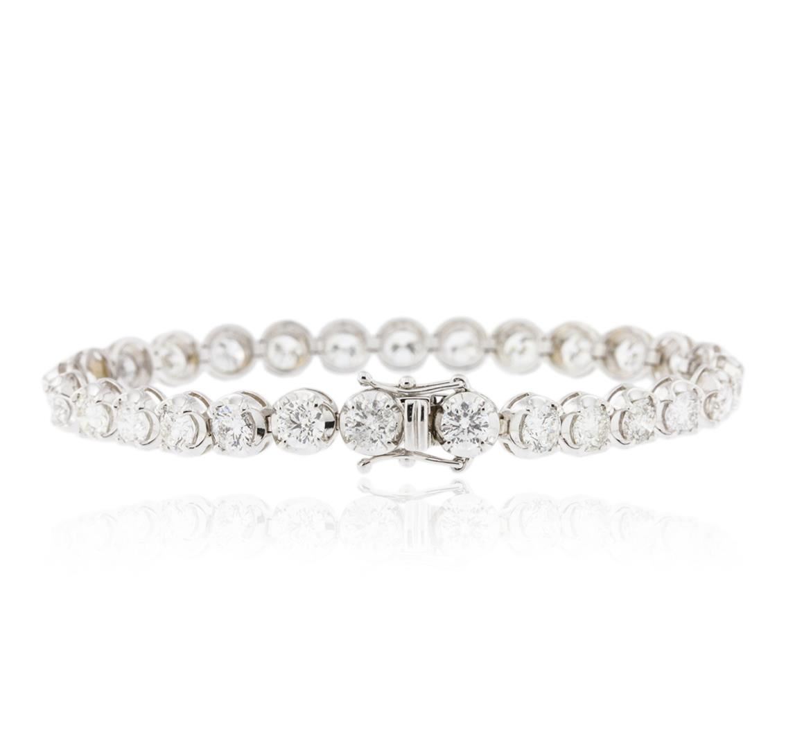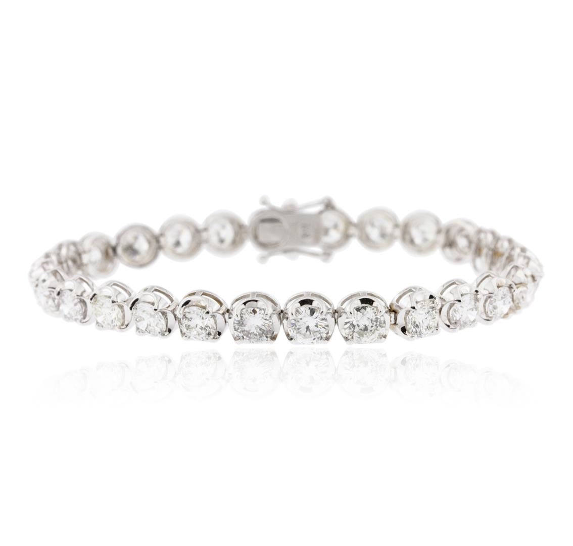 One electronically tested 18KT white gold ladies cast diamond tennis bracelet with a hidden box clasp with a bright polish finish. Measurements: 7" in inch Identified with markings of "750". Condition is new. Containing: Twenty-Eight prong set round brilliant cut diamonds, measuring 4.70 - 4.70 x 2.82mm (depth est.) approximate total weight of 28 Stones = 10.64ct. Clarity: SI-1 to I-1. Color: I - K, Cut is Good. All diamonds are graded in the mounting, unless otherwise stated. Total Weight of Diamonds 10.64ct. Total Weight of Tennis Bracelet 17.40 grams. GGL Appraised at $39,215.00.
