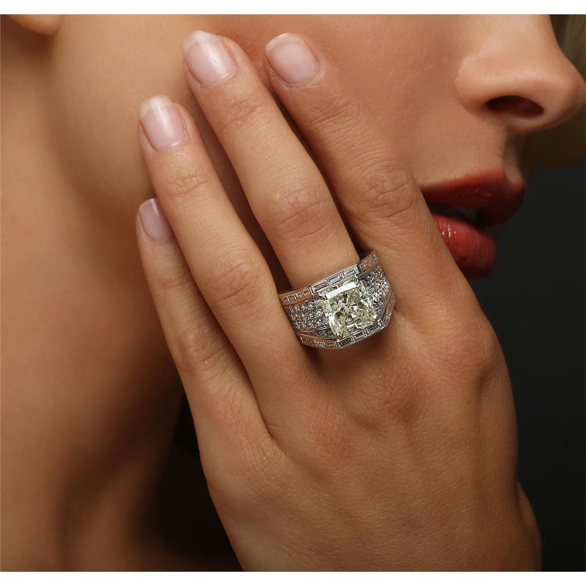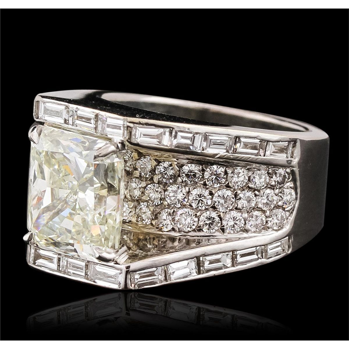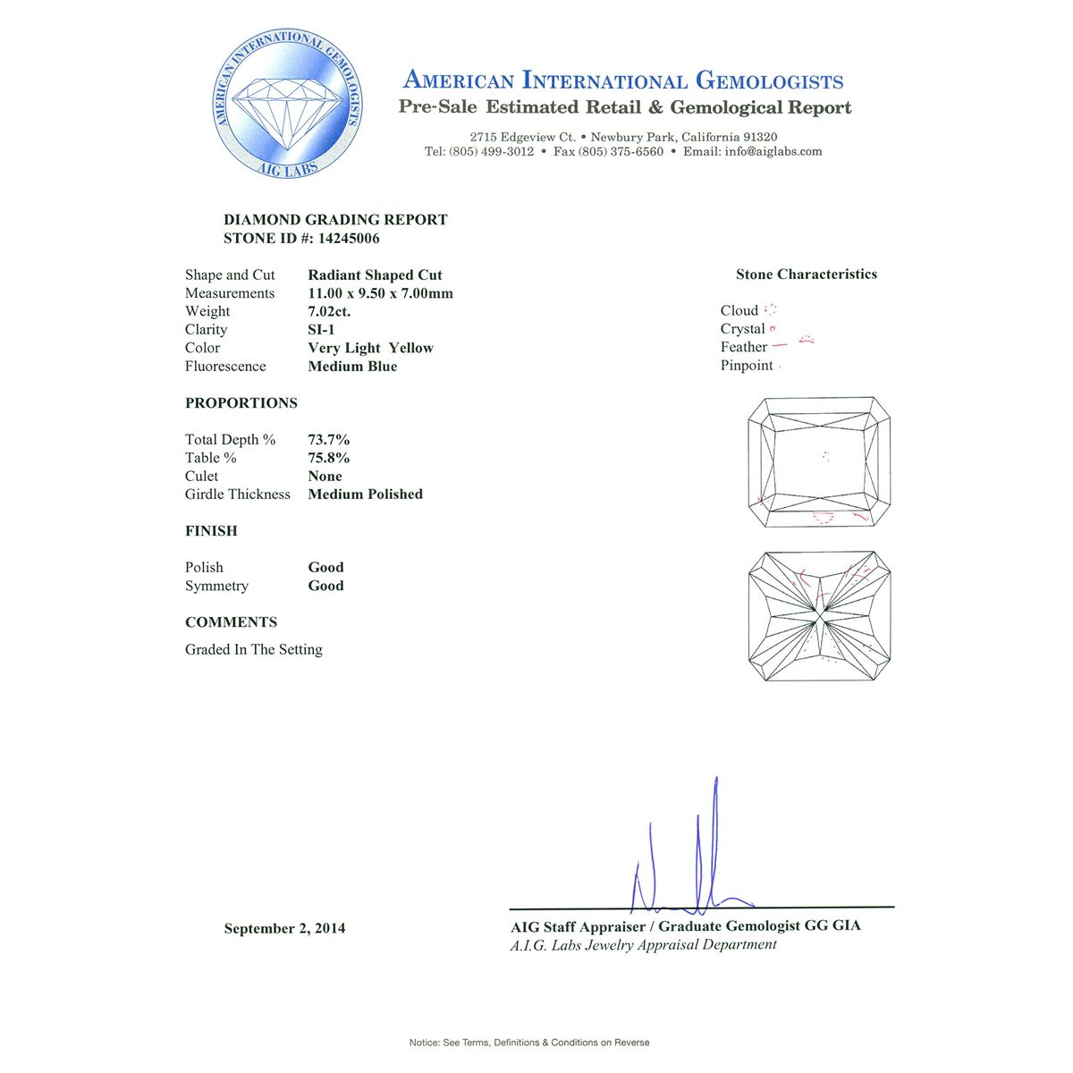 One electronically tested 18KT White Gold cast & hand crafted diamond ring with a bright finish. The tapered block style ring features a radiant cut diamond set above a gallery of smaller round brilliant diamonds, framed by mirroring ribbons of baguette cut diamonds, completed by an eight millimeter wide band. Identified with markings of "750". Condition is new, good workmanship. Containing: One prong set radiant shaped cut diamond, measuring 11.00 x 9.50 x 7.00mm (depth est.), 9.00.% GTCF approximate weight of 7.02ct. Diamond Grading Report attached. Graded in the setting. Clarity: SI-1. Depth: 73.7%. Table 75.8%. Forty-Nine prong set round brilliant cut diamonds, measuring 2.25 - 2.10 x 1.33mm (depth est.) approximate total weight of 49 Stones = 1.88ct. Graded in the setting. Clarity: VVS-2 to VS-1. Color: G - H Twenty-Six channel set baguette cut diamonds, measuring from 3.00 x 2.00 x 1.36mm (depth est.) to 3.30 x 2.10 x 1.47mm (depth est.) approximate total weight of 26 Stones = 2.17ct. Graded in the setting. Clarity: VVS-2 to VS-2. Color: G - I. Total Weight of Diamonds 11.07ct. Total Weight of Ring 32.00 grams. AIG Appraised at $280,000.00.