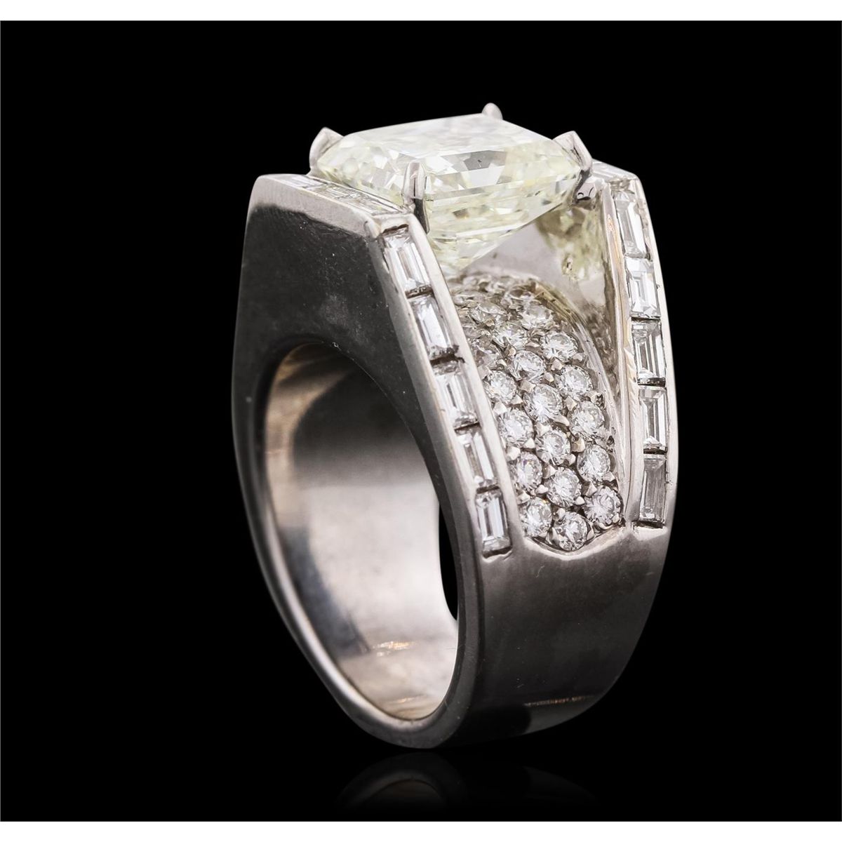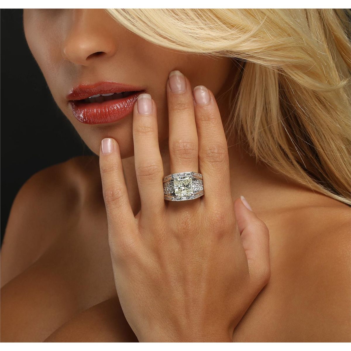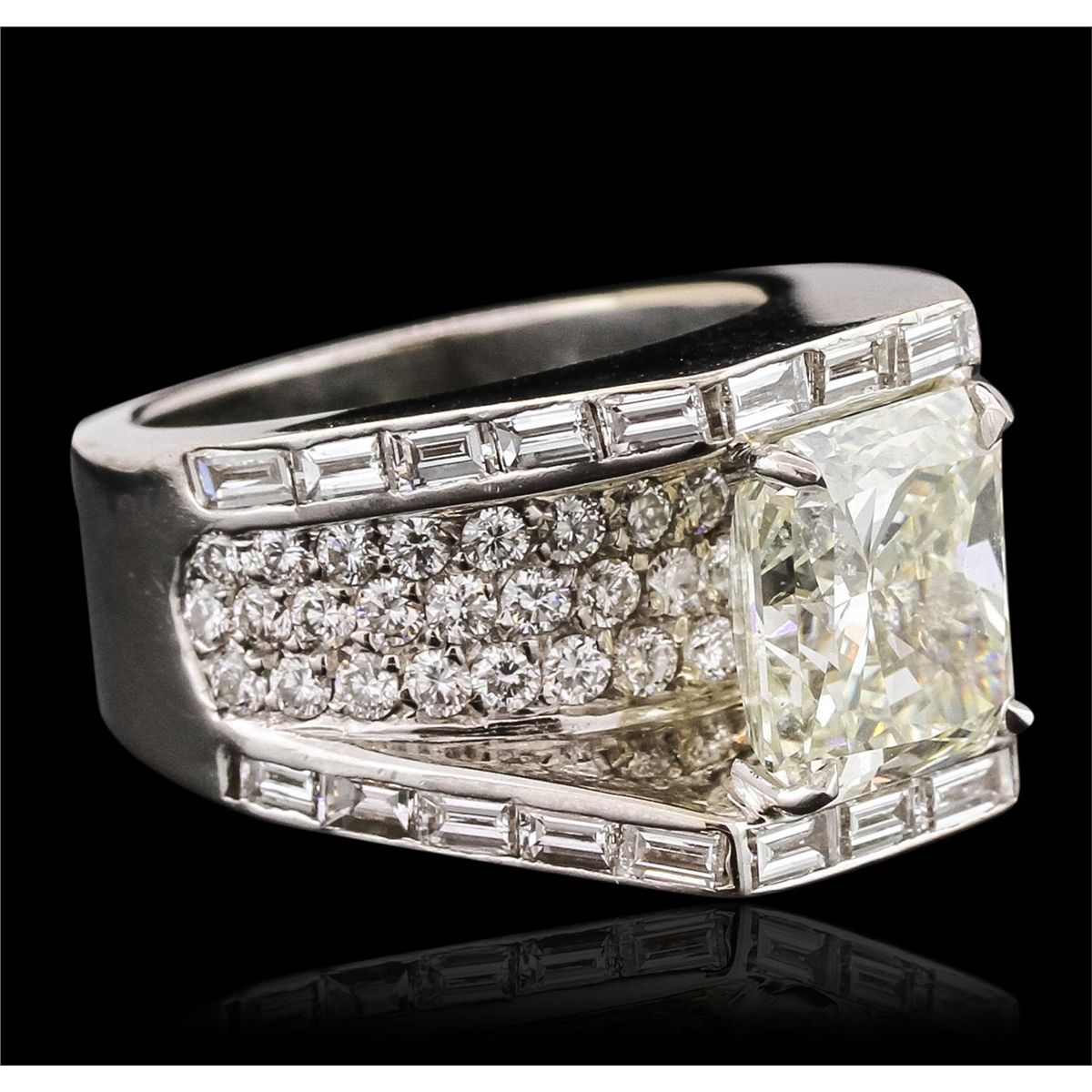 One electronically tested 18KT White Gold cast & hand crafted diamond ring with a bright finish. The tapered block style ring features a radiant cut diamond set above a gallery of smaller round brilliant diamonds, framed by mirroring ribbons of baguette cut diamonds, completed by an eight millimeter wide band. Identified with markings of "750". Condition is new, good workmanship. Containing: One prong set radiant shaped cut diamond, measuring 11.00 x 9.50 x 7.00mm (depth est.), 9.00.% GTCF approximate weight of 7.02ct. Diamond Grading Report attached. Graded in the setting. Clarity: SI-1. Depth: 73.7%. Table 75.8%. Forty-Nine prong set round brilliant cut diamonds, measuring 2.25 - 2.10 x 1.33mm (depth est.) approximate total weight of 49 Stones = 1.88ct. Graded in the setting. Clarity: VVS-2 to VS-1. Color: G - H Twenty-Six channel set baguette cut diamonds, measuring from 3.00 x 2.00 x 1.36mm (depth est.) to 3.30 x 2.10 x 1.47mm (depth est.) approximate total weight of 26 Stones = 2.17ct. Graded in the setting. Clarity: VVS-2 to VS-2. Color: G - I. Total Weight of Diamonds 11.07ct. Total Weight of Ring 32.00 grams. AIG Appraised at $280,000.00.