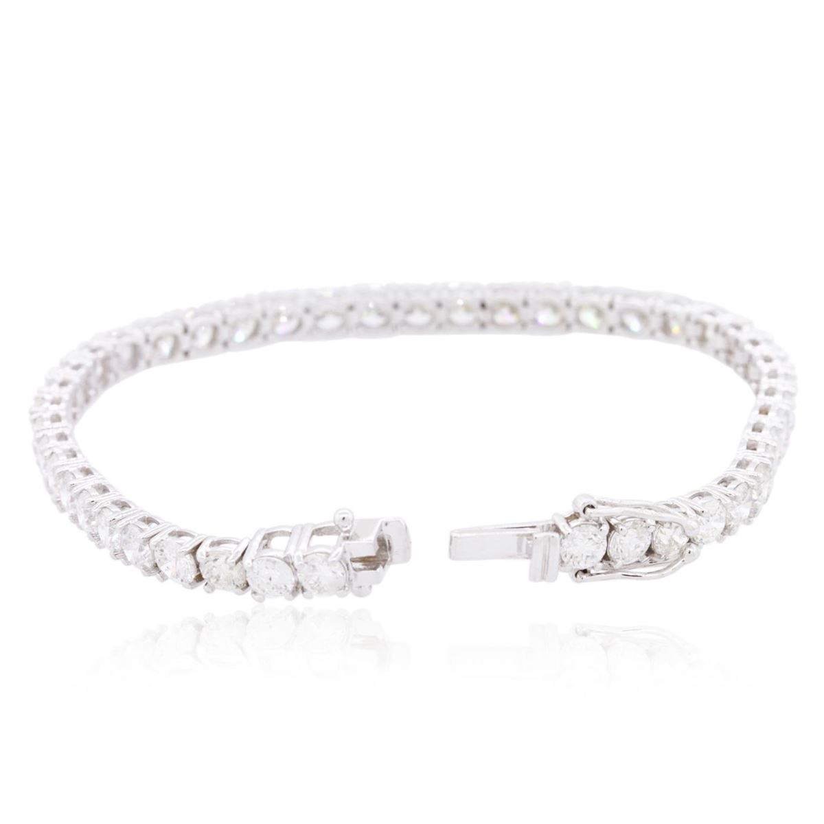 One electronically tested 18KT white gold ladies cast diamond tennis bracelet with a hidden box clasp with a bright polish finish. Measurements: 7.25" in length. Identified with markings of "750". Condition is new. Containing: Forty-Three prong set round brilliant cut diamonds, measuring 4.20 - 4.20 x 2.52mm (depth est.) approximate total Weight of 43 Stones = 11.66ct. Clarity: SI-2 to I-1. Color: I - J, Cut is Good. All diamonds are graded in the mounting, unless otherwise stated. Total Weight of Diamonds 11.66ct. Total Weight of Tennis Bracelet 14.20 grams. GGL Appraised at $40,290.00.