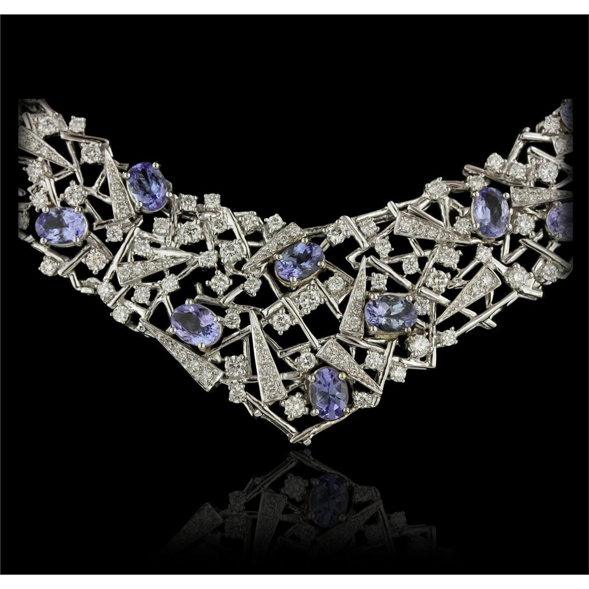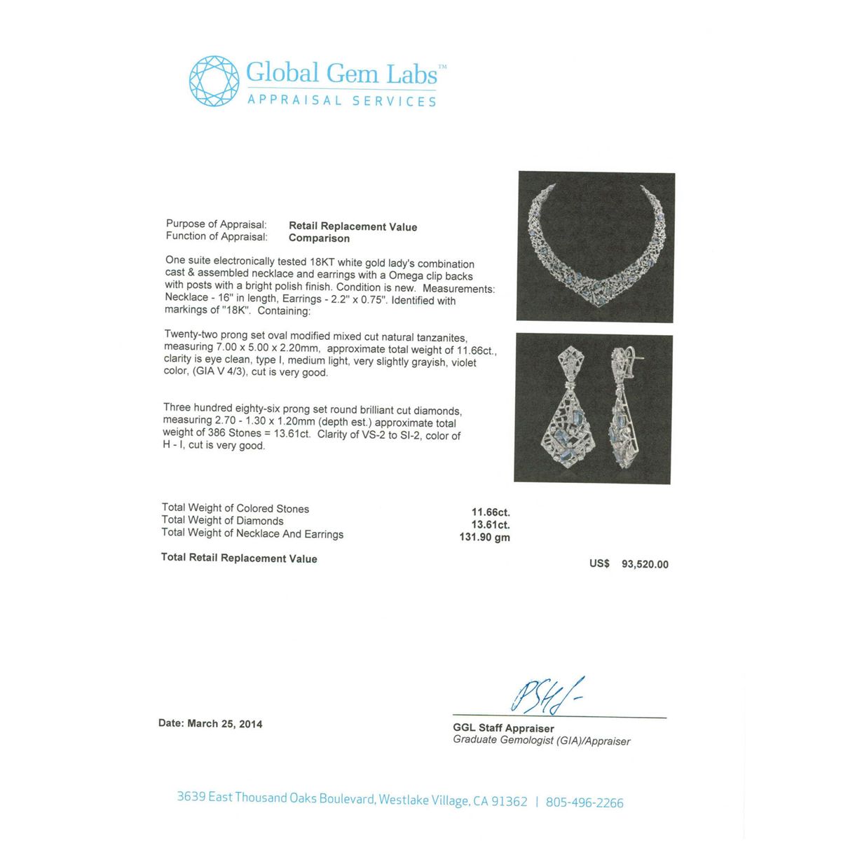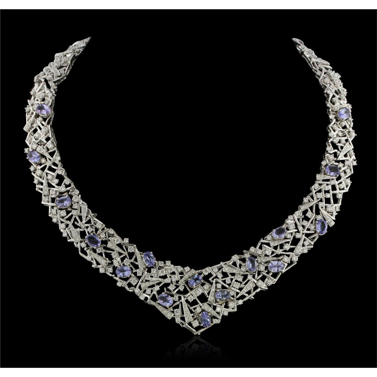 One suite electronically tested 18KT white gold Ladies combination cast & assembled necklace and earrings with a Omega clip backs with posts with a bright polish finish. Condition is new. Measurements: Necklace - 16" in length, Earrings - 2.2" x 0.75". Identified with markings of "18K". Containing: Twenty-two prong set oval modified mixed cut natural tanzanites, measuring 7.00 x 5.00 x 2.20mm, approximate. Total Weight of 11.66ct., clarity is eye clean, type I, medium light, very slightly grayish, violet color, (GIA V 4/3), cut is very good. Three Hundred Eighty-Six prong set round brilliant cut diamonds, measuring 2.70 - 1.30 x 1.20mm (depth est.) approximate. Total Weight of 386 Stones = 13.61ct. Clarity: VS-2 to SI-2. Color: H - I, Cut is Very Good. Total Weight of Colored Stones 11.66ct. Total Weight of Diamonds 13.61ct. Total Weight of Necklace and Earrings 131.90 grams. GGL Appraised at $93,520.00.