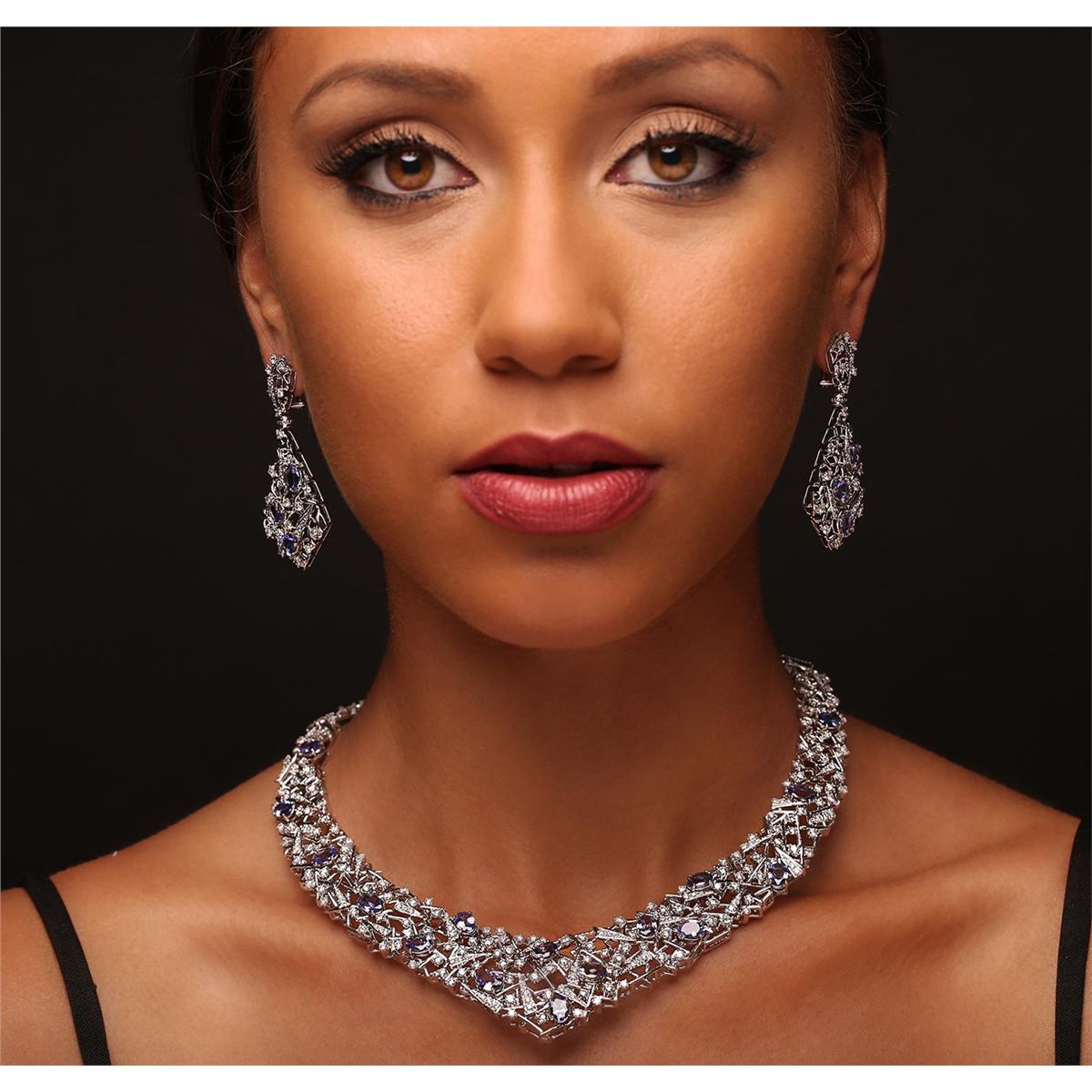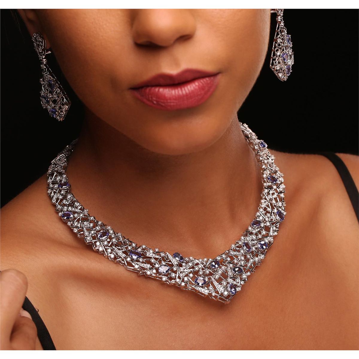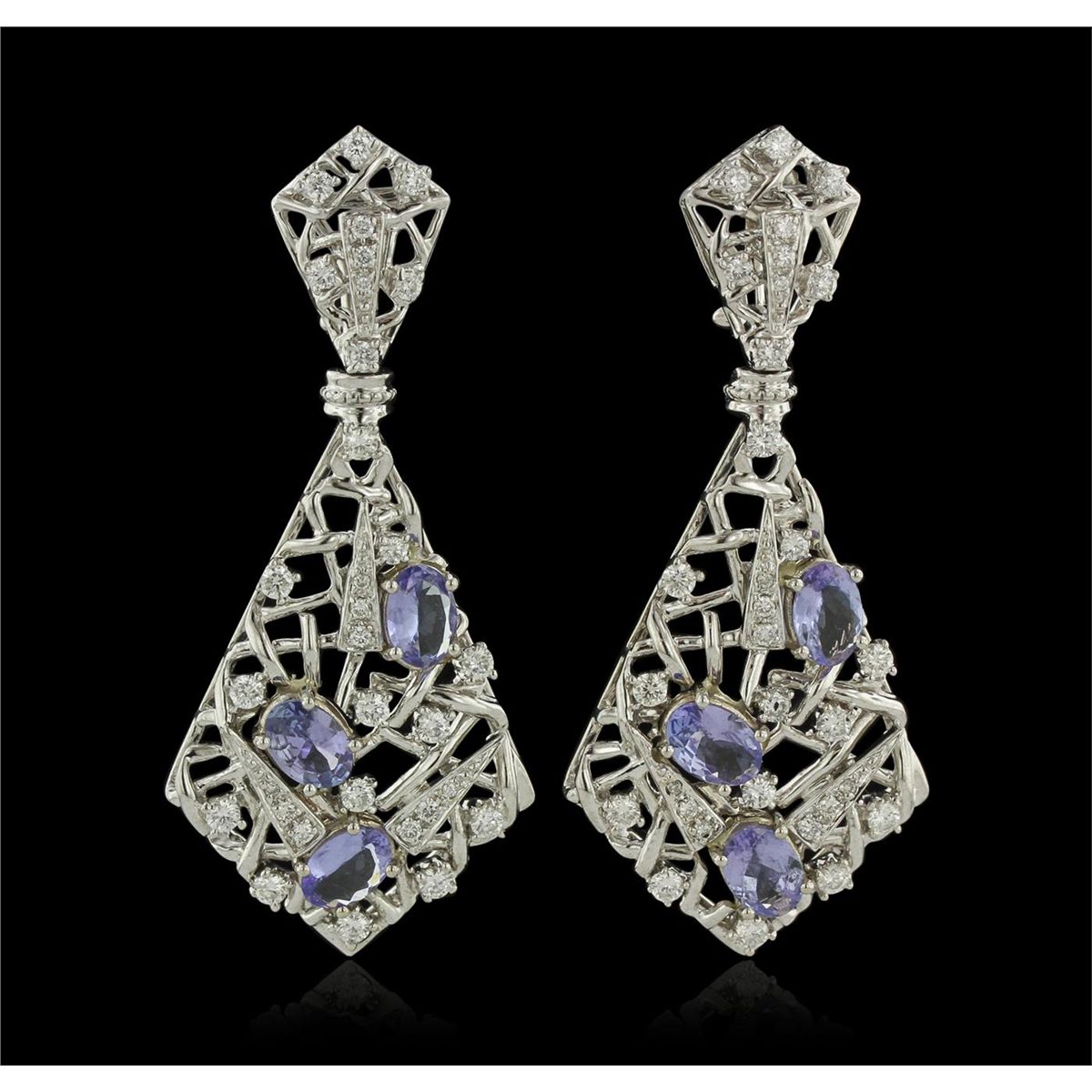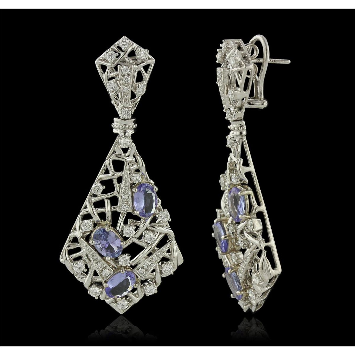 One suite electronically tested 18KT white gold Ladies combination cast & assembled necklace and earrings with a Omega clip backs with posts with a bright polish finish. Condition is new. Measurements: Necklace - 16" in length, Earrings - 2.2" x 0.75". Identified with markings of "18K". Containing: Twenty-two prong set oval modified mixed cut natural tanzanites, measuring 7.00 x 5.00 x 2.20mm, approximate. Total Weight of 11.66ct., clarity is eye clean, type I, medium light, very slightly grayish, violet color, (GIA V 4/3), cut is very good. Three Hundred Eighty-Six prong set round brilliant cut diamonds, measuring 2.70 - 1.30 x 1.20mm (depth est.) approximate. Total Weight of 386 Stones = 13.61ct. Clarity: VS-2 to SI-2. Color: H - I, Cut is Very Good. Total Weight of Colored Stones 11.66ct. Total Weight of Diamonds 13.61ct. Total Weight of Necklace and Earrings 131.90 grams. GGL Appraised at $93,520.00.