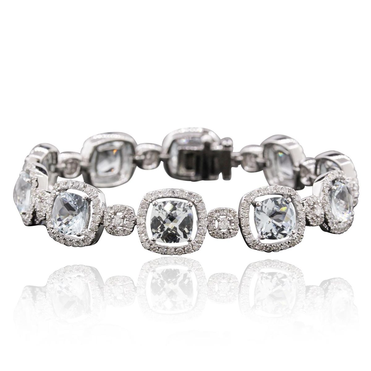 One Ladies polished, stamped and electronically tested solid 18k white gold bracelet mounted with 10 genuine square cushion aquamarine (beryl)s and 370 genuine diamonds. This item weighs 25.6 grams and measures 7.00 inches in length and 11.10mm in width, tapering to 5.34mm. This bracelet has been finished with a slip-in groove closure further secured by a fold-under safety catch. The condition is brand new. The gemstones have been analyzed in the mounting. Main gemstones identity genuine aquamarine (beryl). Shape square cushion (checkerboard). Measurements 7.10 x 7.08 x 4.30mm. Quantity 10. Carat weight 12.60ctw (est). Clarity type I=variety flawless-near flawless. Hue icy blue. Transparency transparent. Tone light-medium. Saturation vivid-bright. Quality 7 - Very Good. Adjacent gemstones identity genuine diamond. Cut round full (faceted). Measurements 1.90 - 0.90 x mm (no depth) (range). Quantity 370 (est). Carat weight 3.42ctw (est) Clarity grade I-1/I-2. Color grade G-H. Cut grade 7 - Very Good. Gemstone carat weight 12.60ctw. Diamond carat weight 3.42ctw. Item gram weight 25.60 grams. GLA Appraised at $37,966.00.