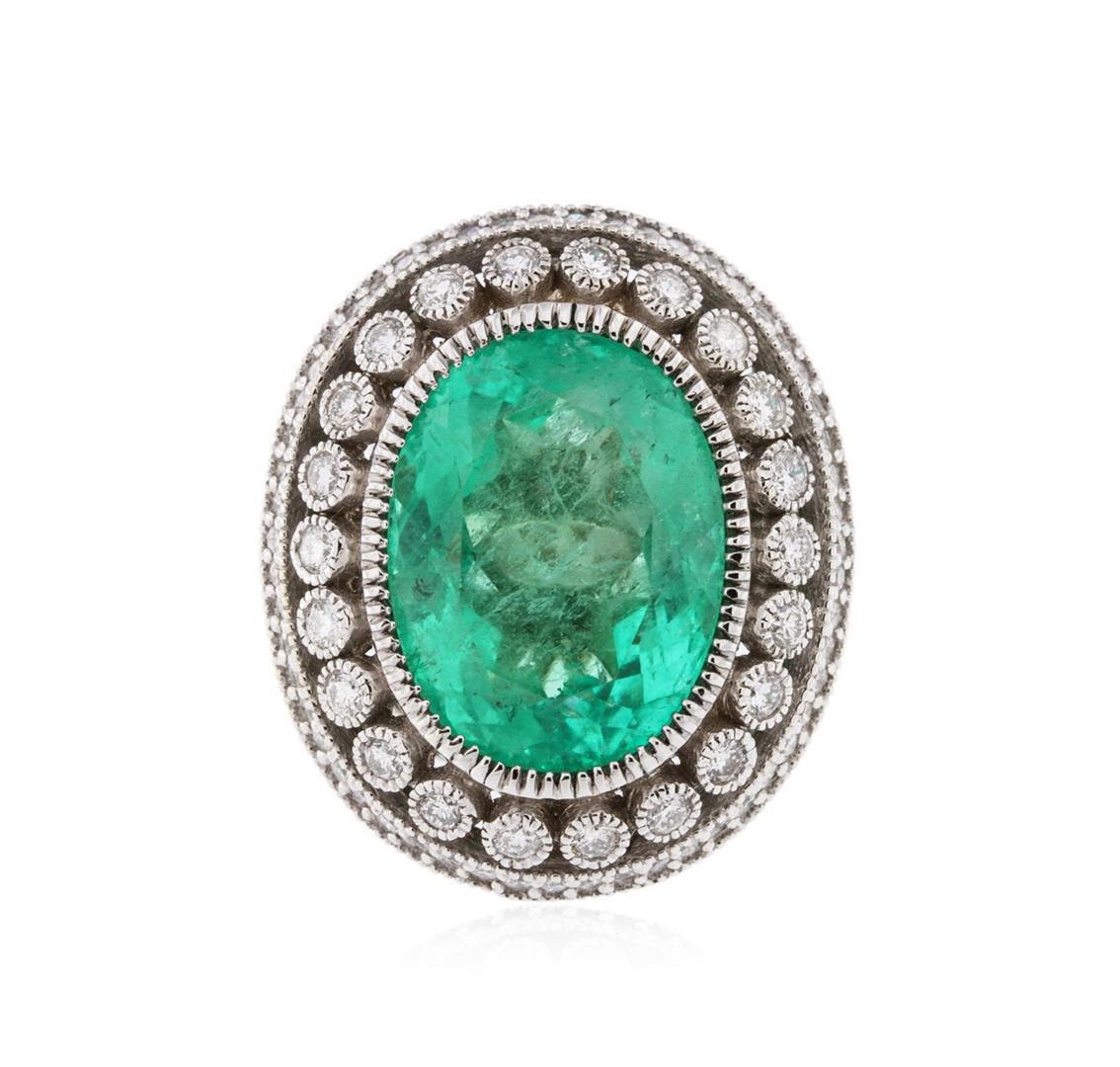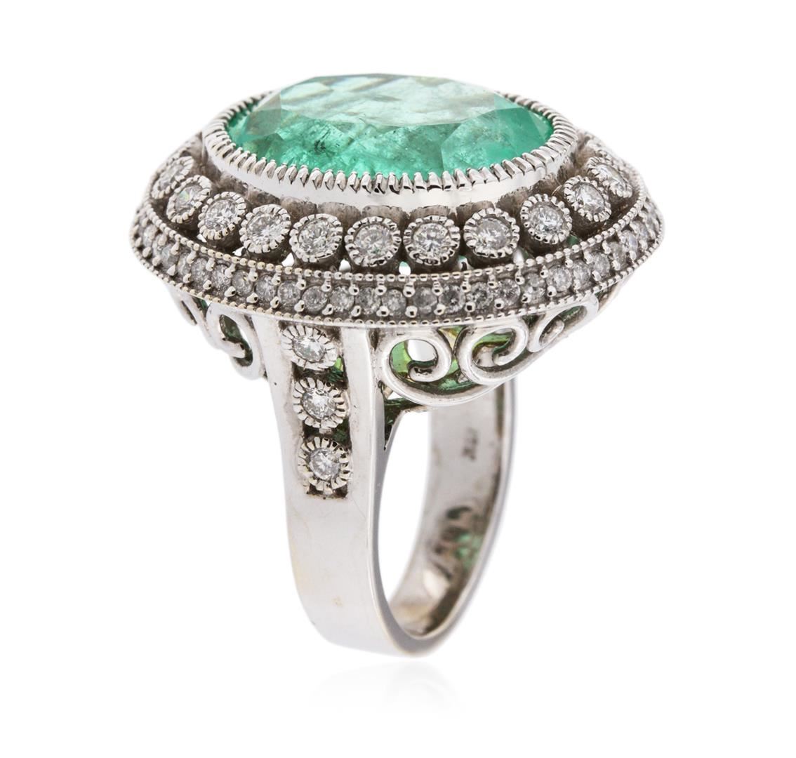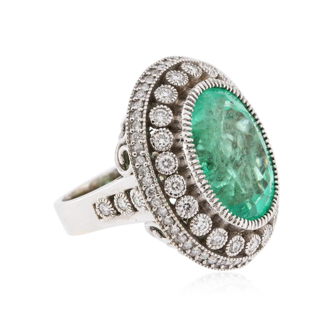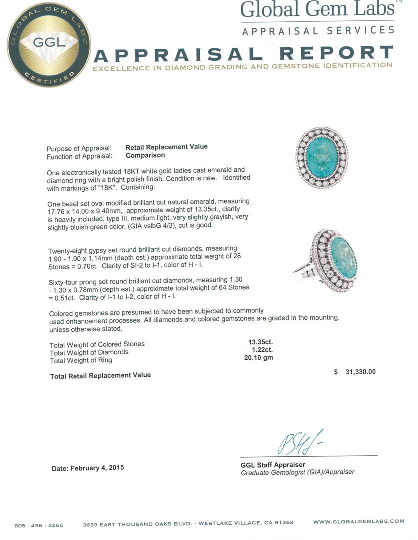 One electronically tested 18KT white gold ladies cast emerald and diamond ring with a bright polish finish. Identified with markings of "18K". Condition is new. Containing: One bezel set oval modified brilliant cut natural emerald, measuring 17.76 x 14.00 x 9.40mm, approximate weight of 13.35ct., clarity is heavily included, type III, medium light, very slightly grayish, very slightly bluish green color, (GIA vslbG 4/3), cut is good. Twenty-Eight gypsy set round brilliant cut diamonds, measuring 1.90 - 1.90 x 1.14mm (depth est.) approximate total weight of 28 Stones = 0.70ct. Clarity: SI-2 to I-1. Color: H - I. Sixty-Four prong set round brilliant cut diamonds, measuring 1.30 - 1.30 x 0.78mm (depth est.) approximate total weight of 64 Stones = 0.51ct. Clarity: I-1 to I-2. Color: H - I. Colored gemstones are presumed to have been subjected to commonly used enhancement processes. All diamonds and colored gemstones are graded in the mounting, unless otherwise stated. Total Weight of Colored Stones 13.35ct. Total Weight of Diamonds 1.22ct. Total Weight of Ring 20.10 grams. GGL Appraised at $31,330.00.