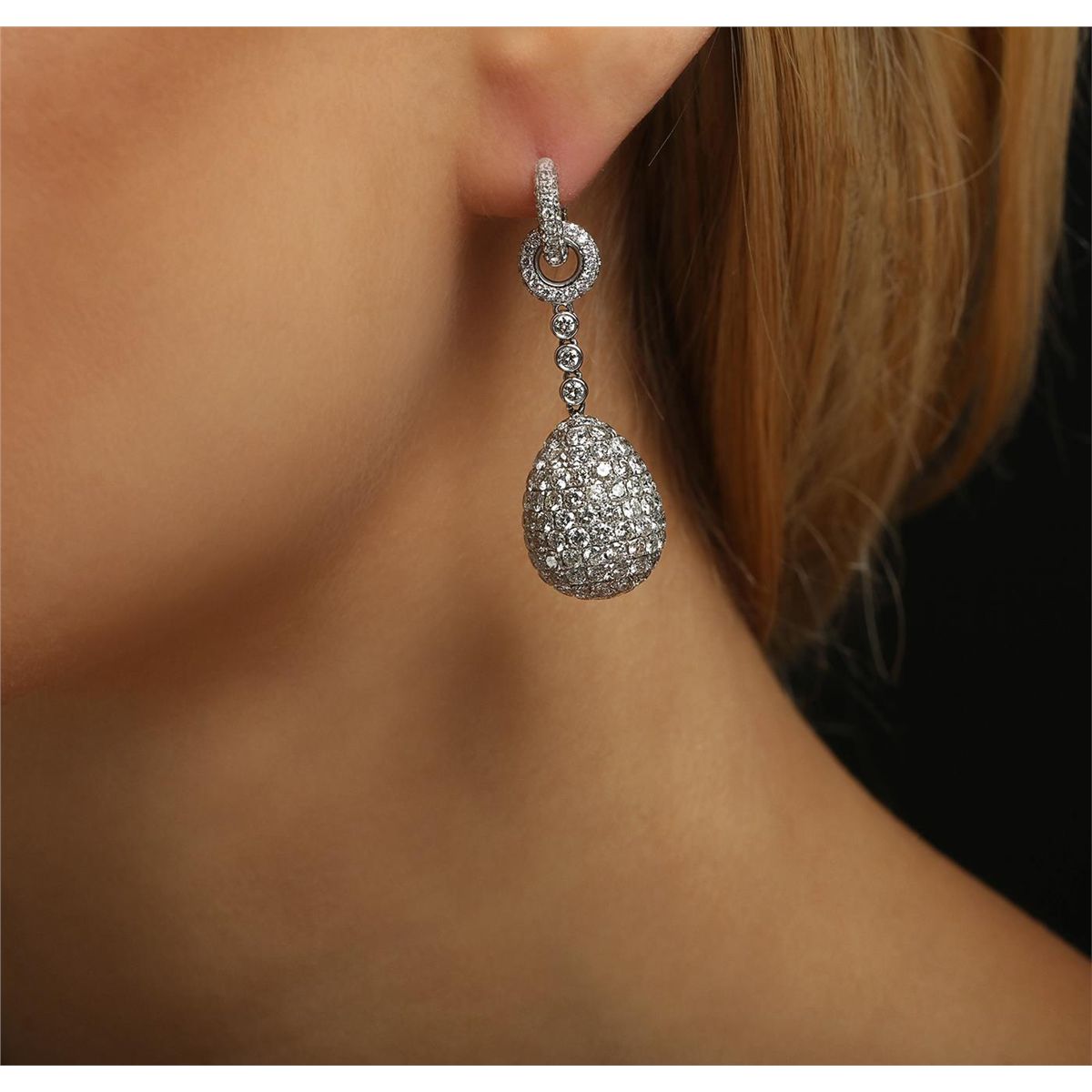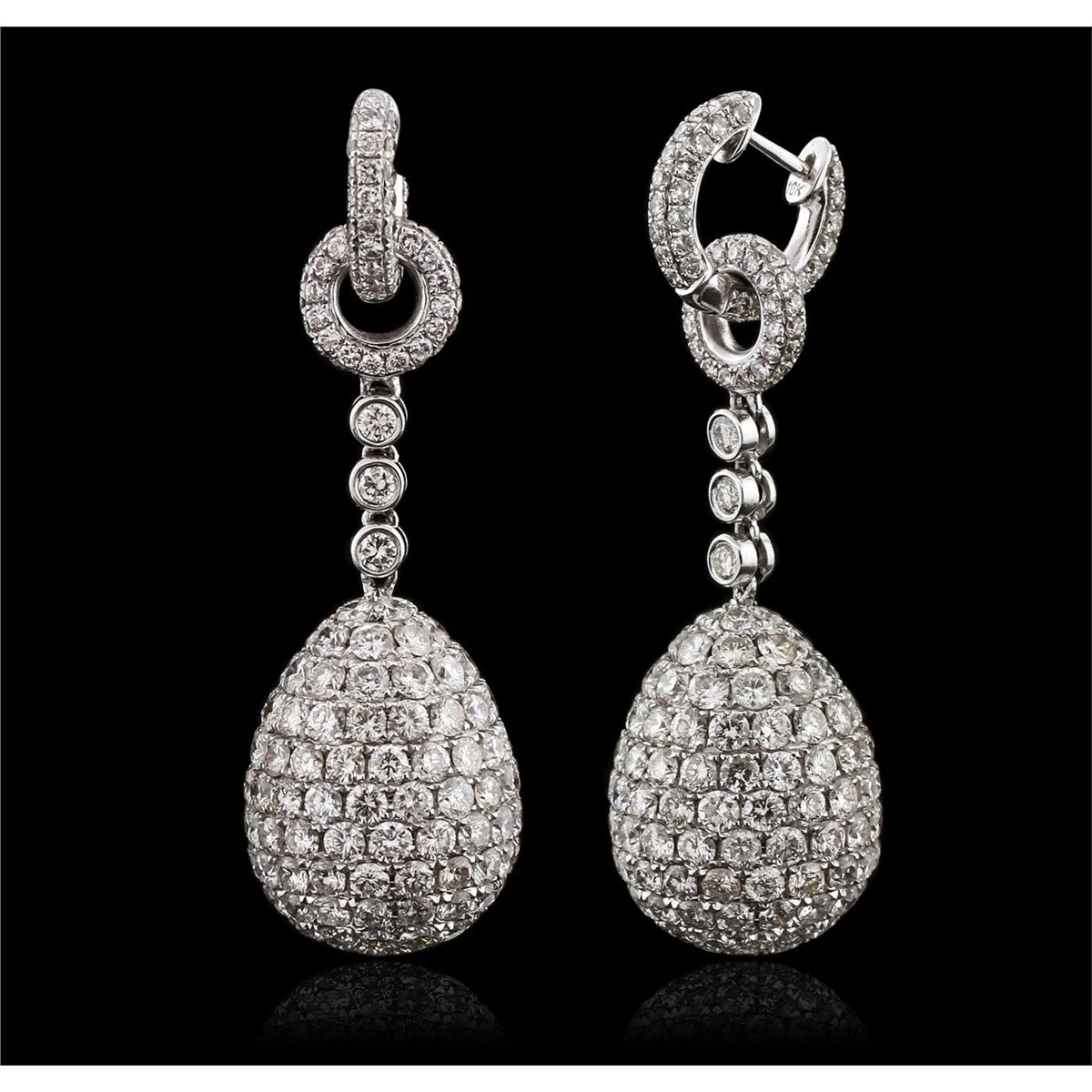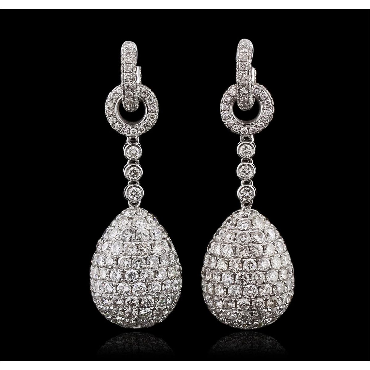One pair electronically tested 18KT white gold ladies cast & assembled diamond dangle earrings with hinged, snap locking posts. Each earring features a removable diamond encrusted drop, completed by a diamond set huggie. Bright polish finish. Identified with markings of "18K". Condition is new, good workmanship. Containing: Five Hundred Six bezel and bead set round brilliant cut diamonds approximate total weight of 506 Stones = 13.36ct. Graded in the setting. Clarity: VS-1 to SI-1. Color: G - I. Total Weight of Diamonds 13.36ct. Total Weight of Earrings 15.44 grams. AIG Appraised at $47,980.00.
