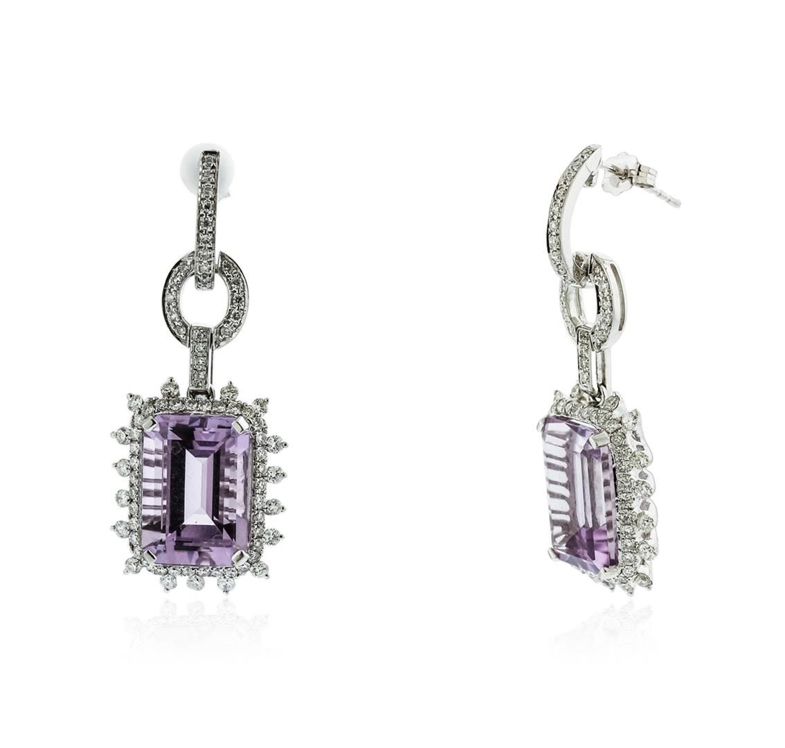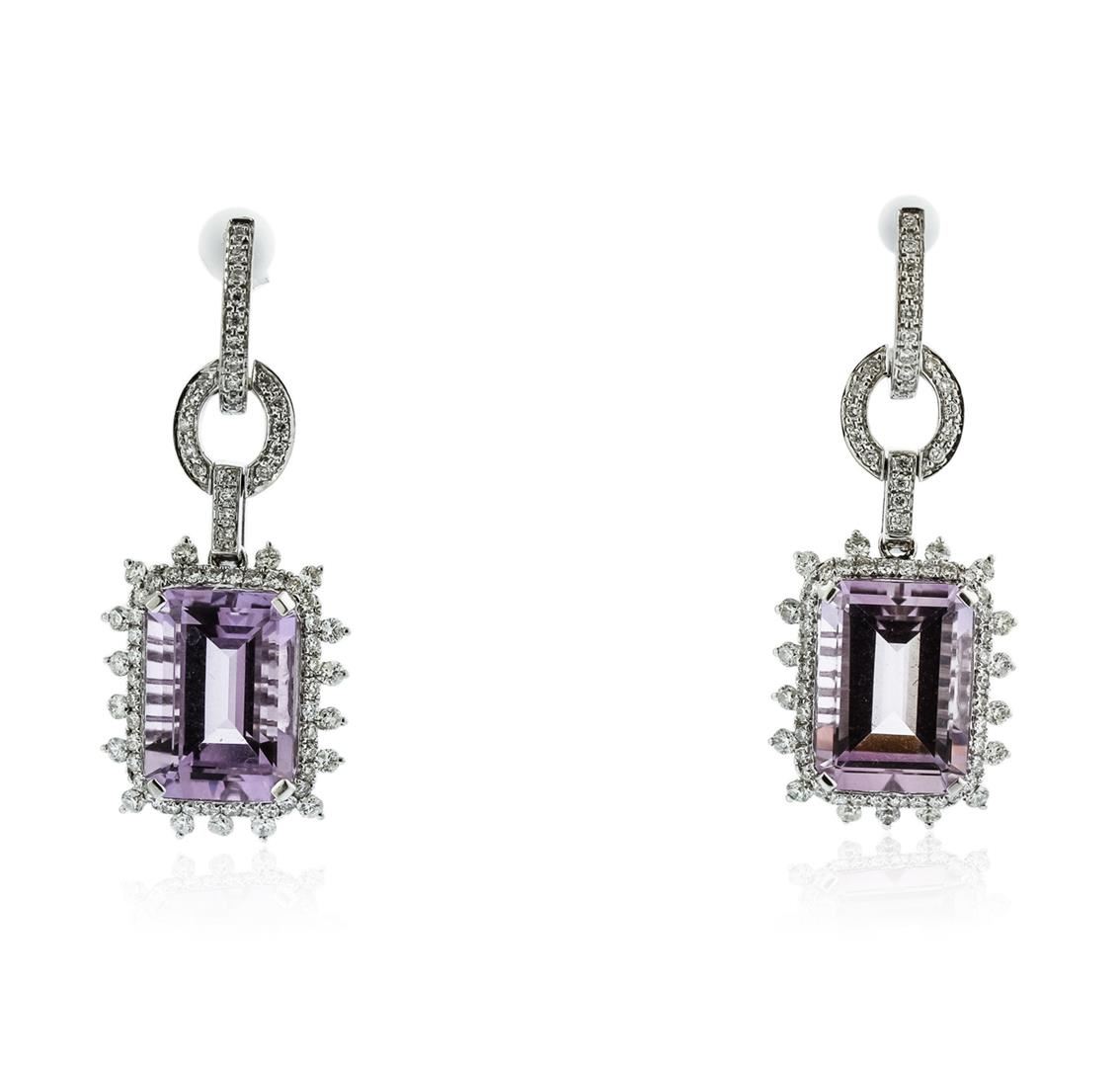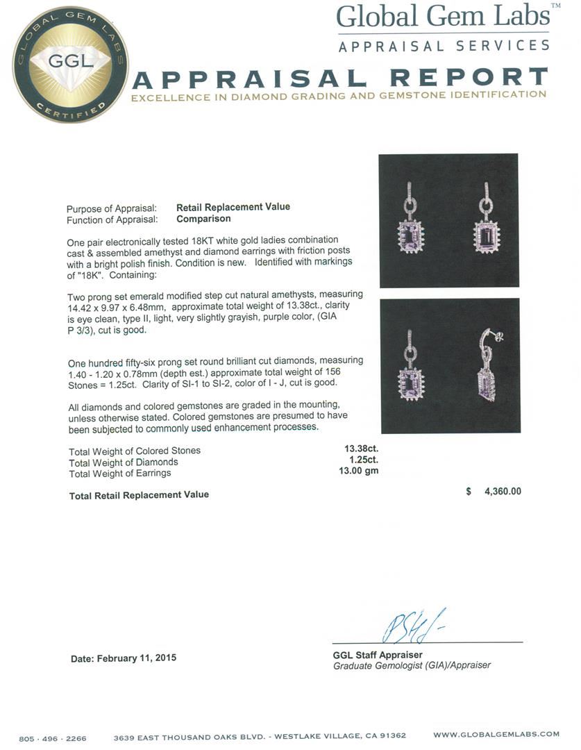 One pair electronically tested 18KT white gold ladies combination cast & assembled amethyst and diamond earrings with friction posts with a bright polish finish. Identified with markings of "18K". Condition is new. Containing: Two prong set emerald modified step cut natural amethysts, measuring 14.42 x 9.97 x 6.48mm, approximate total weight of 13.38ct., clarity is eye clean, type II, light, very slightly grayish, purple color, (GIA P 3/3), cut is good. One Hundred Fifty-Six prong set round brilliant cut diamonds, measuring 1.40 - 1.20 x 0.78mm (depth est.) approximate total weight of 156 Stones = 1.25ct. Clarity: SI-1 to SI-2. Color: I - J, Cut is Good. All diamonds and colored gemstones are graded in the mounting, unless otherwise stated. Colored gemstones are presumed to have been subjected to commonly used enhancement processes. Total Weight of Colored Stones 13.38ct. Total Weight of Diamonds 1.25ct. Total Weight of Earrings 13.00 grams. GGL Appraised at $4,360.00.