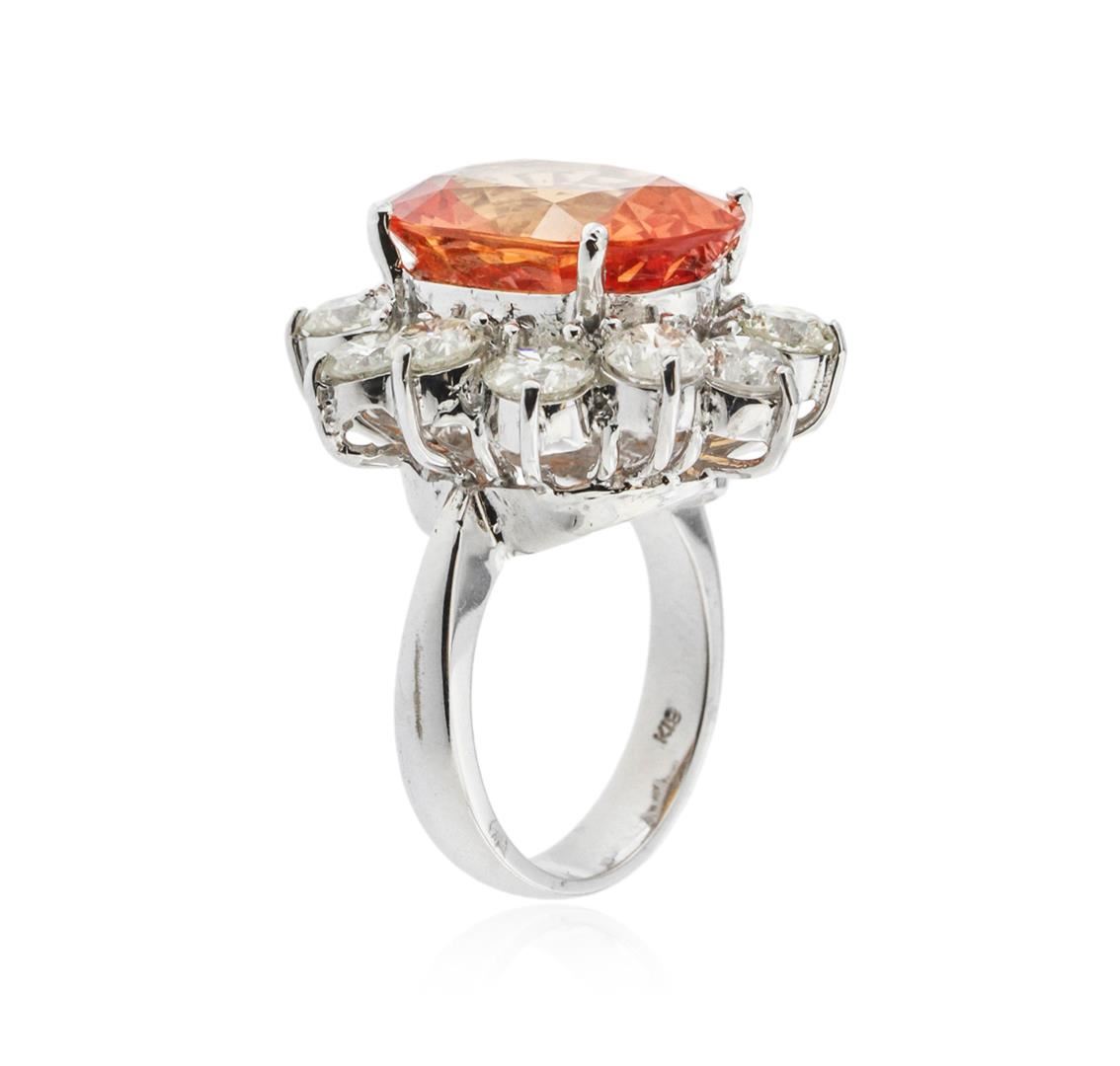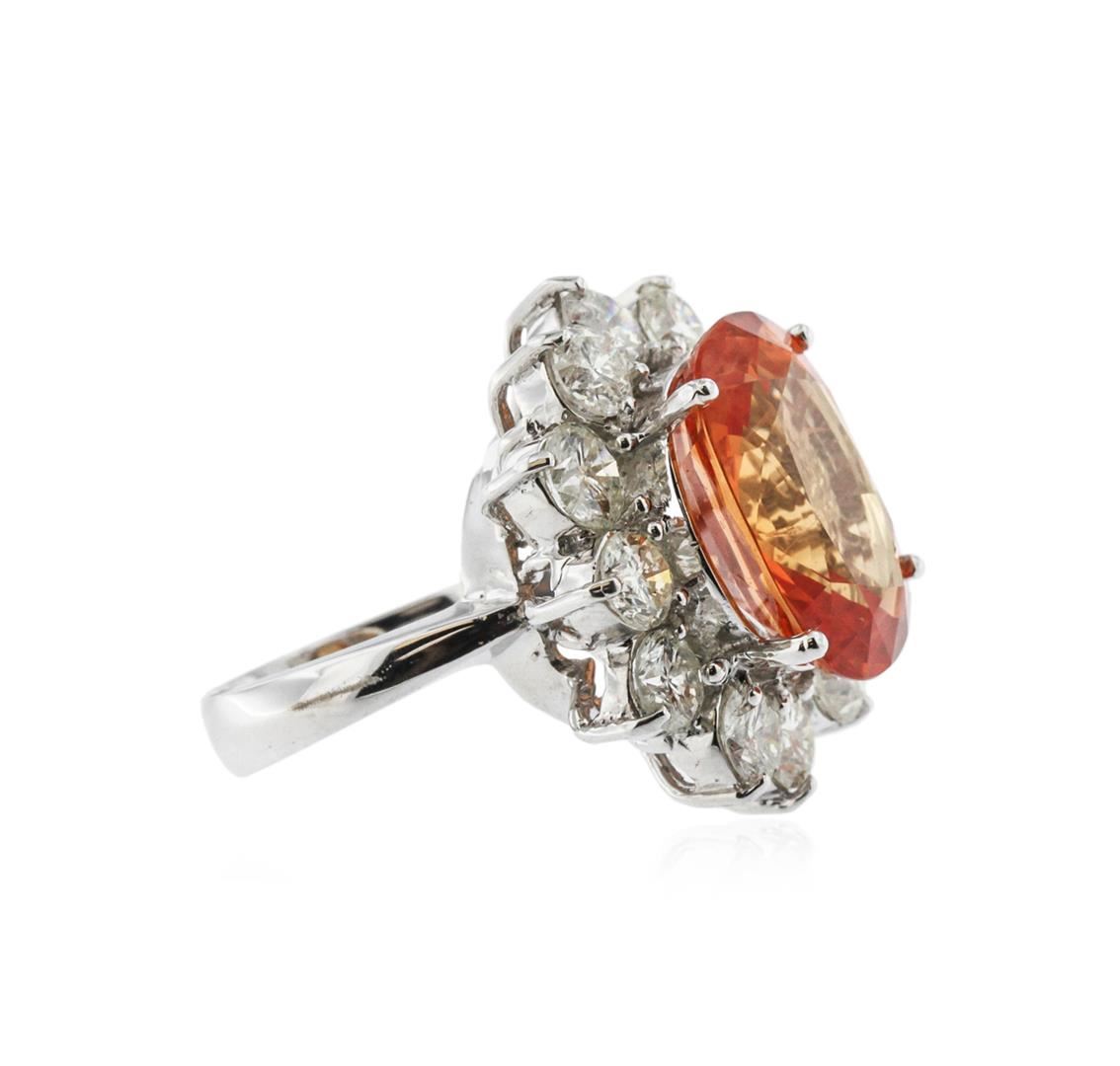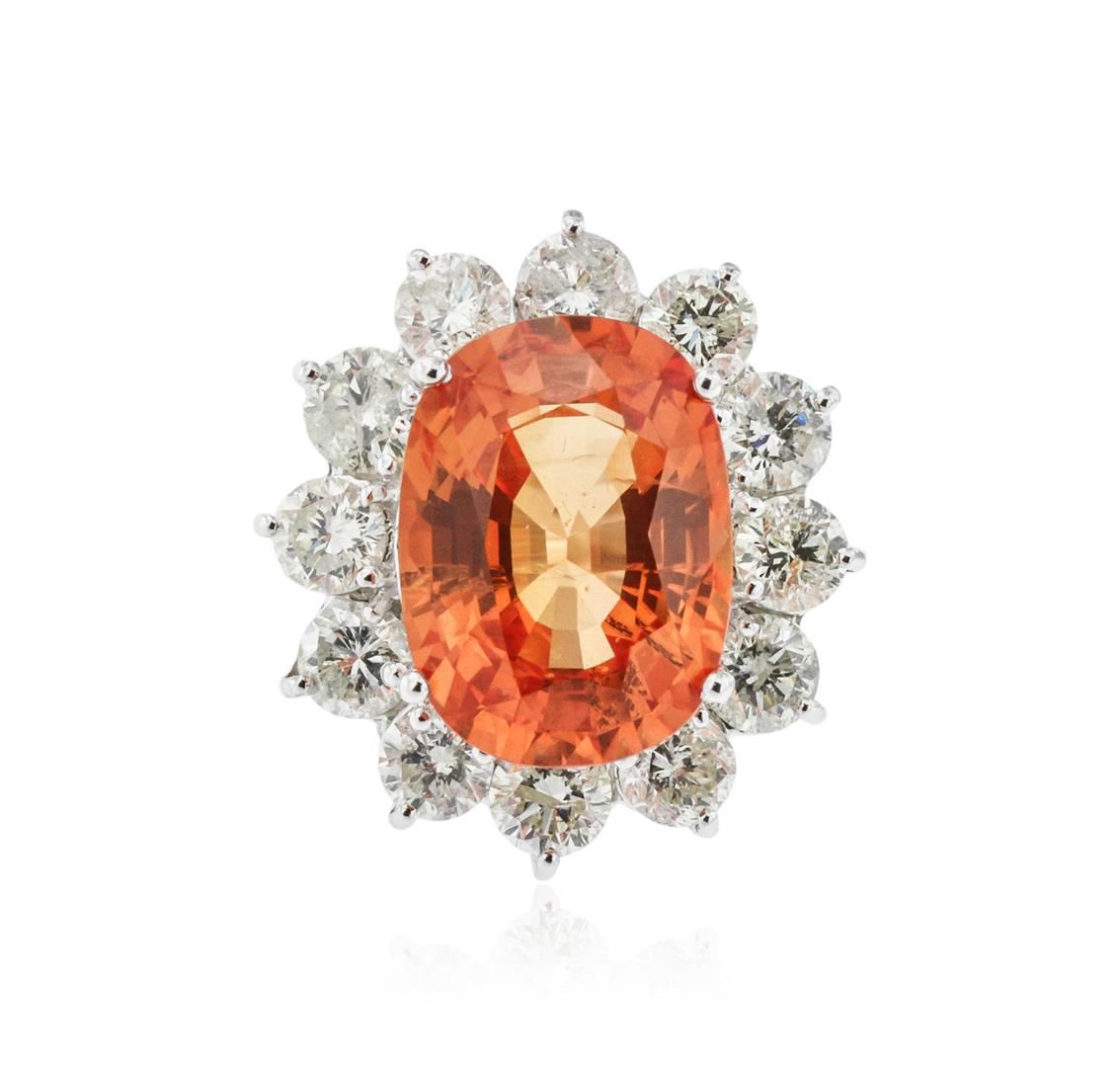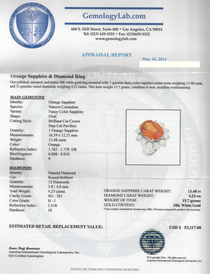 One polished, stamped, and tested 18K white gold ring mounted with: 1 genuine fancy color sapphire center stone weighing 13.48 carat, and 12 genuine round diamonds weighing 4.23 carats. This item weighs 15.7 grams, condition is new, excellent workmanship. MAIN GEMSTONE: Identity: Orange Sapphire. Species: Natural Corundum. Variety: Fancy Color Sapphire. Shape: Oval. Cutting Style: Brilliant Cut Crown Step Cut Pavilion. Quantity: 1 Orange Sapphire. Measurements: 16.59 x 12.21 mm. Weight: 13.48 carat. Color: Orange. Refractive Index: 1.762 - 1.770 DR. Birefringence: 0.008 - 0.010. Hardness: 9. DIAMONDS: Identity: Natural Diamond. Cut: Round Brilliant. Quantity: 12 Diamonds. Measurements: 3.8 - 4.0 mm. Total Weight: 4.23 carats. Clarity Grade: SI2 - SI3. Color Grade: H - I. Refractive Index: 2.418. Hardness: 10. Orange Sapphire Carat Weight: 13.48ct. Diamond Carat Weight: 4.23 cts. Weight of Item: 15.7 grams. Gold Content: 18K White Gold. AIGL Appraised at $53,117.00.
