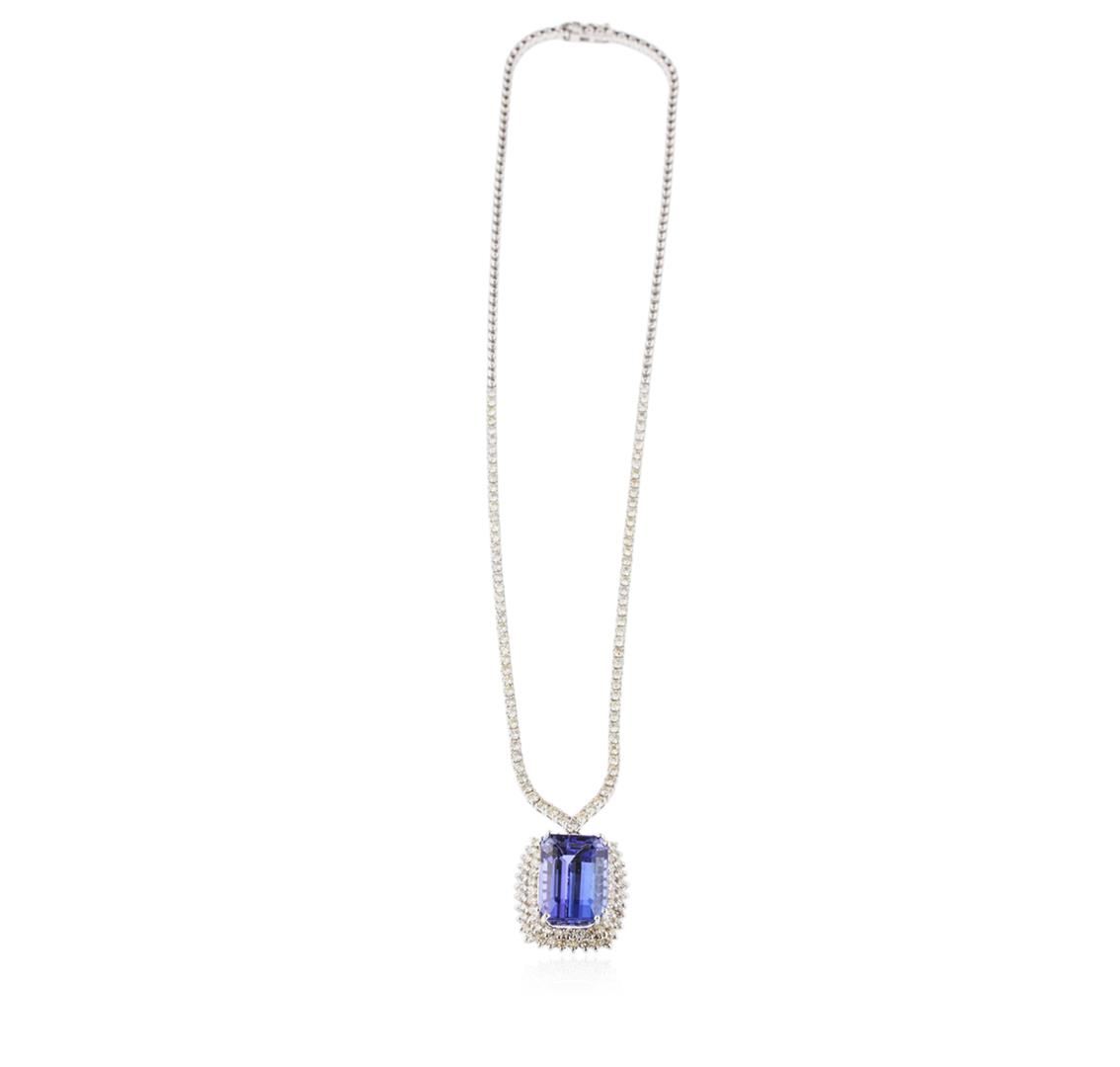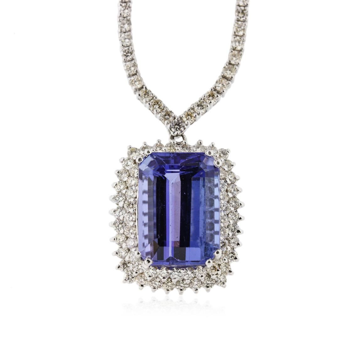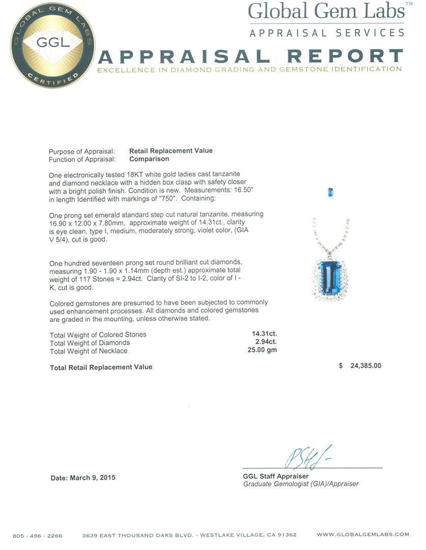 One electronically tested 18KT white gold ladies cast tanzanite and diamond necklace with a hidden box clasp with safety closer with a bright polish finish. Measurements: 16.50" in length Identified with markings of "750". Condition is new. Containing: One prong set emerald standard step cut natural tanzanite, measuring 16.90 x 12.00 x 7.80mm, approximate weight of 14.31ct., clarity is eye clean, type I, medium, moderately strong, violet color, (GIA V 5/4), cut is good. One Hundred Seventeen prong set round brilliant cut diamonds, measuring 1.90 - 1.90 x 1.14mm (depth est.) approximate total weight of 117 Stones = 2.94ct. Clarity: SI-2 to I-2. Color: I - K, Cut is Good. Colored gemstones are presumed to have been subjected to commonly used enhancement processes. All diamonds and colored gemstones are graded in the mounting, unless otherwise stated. Total Weight of Colored Stones 14.31ct. Total Weight of Diamonds 2.94ct. Total Weight of Necklace 25.00 grams. GGL Appraised at $24,385.00.