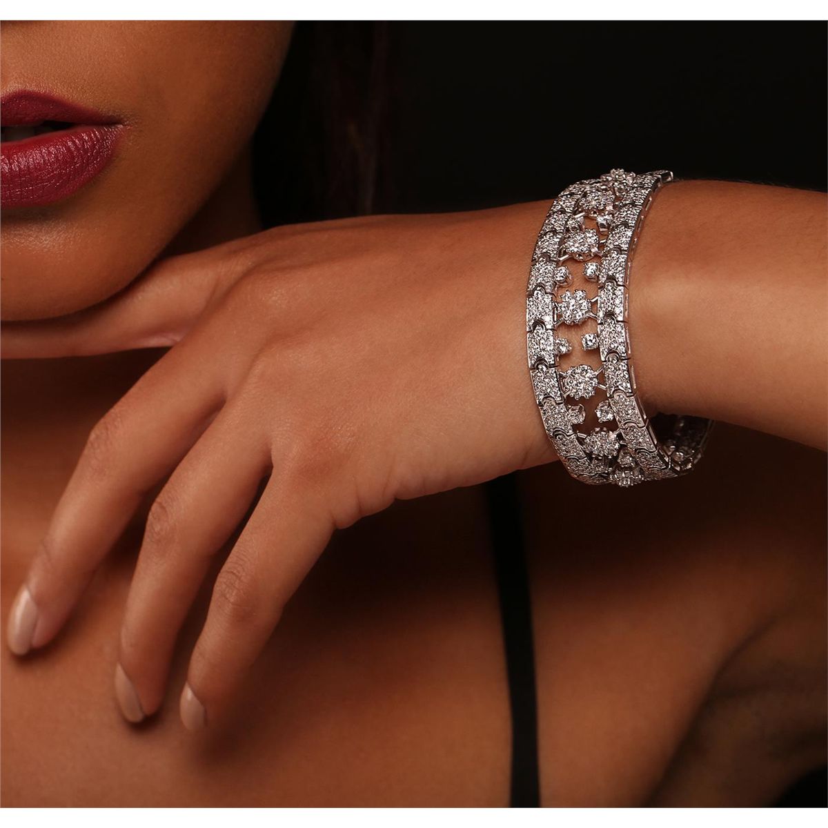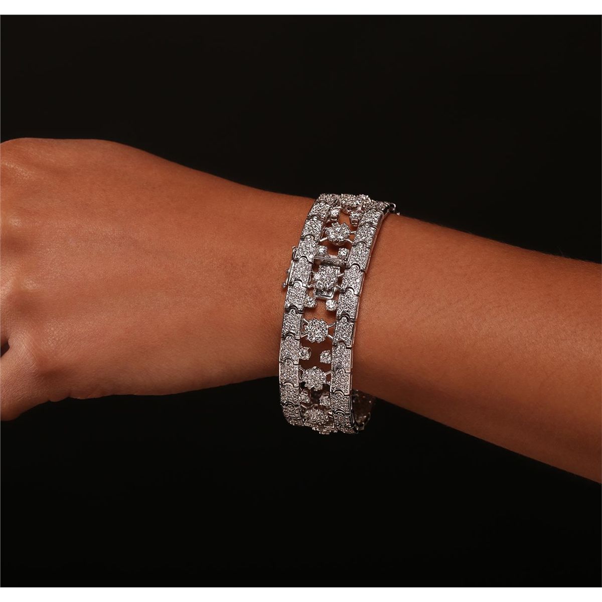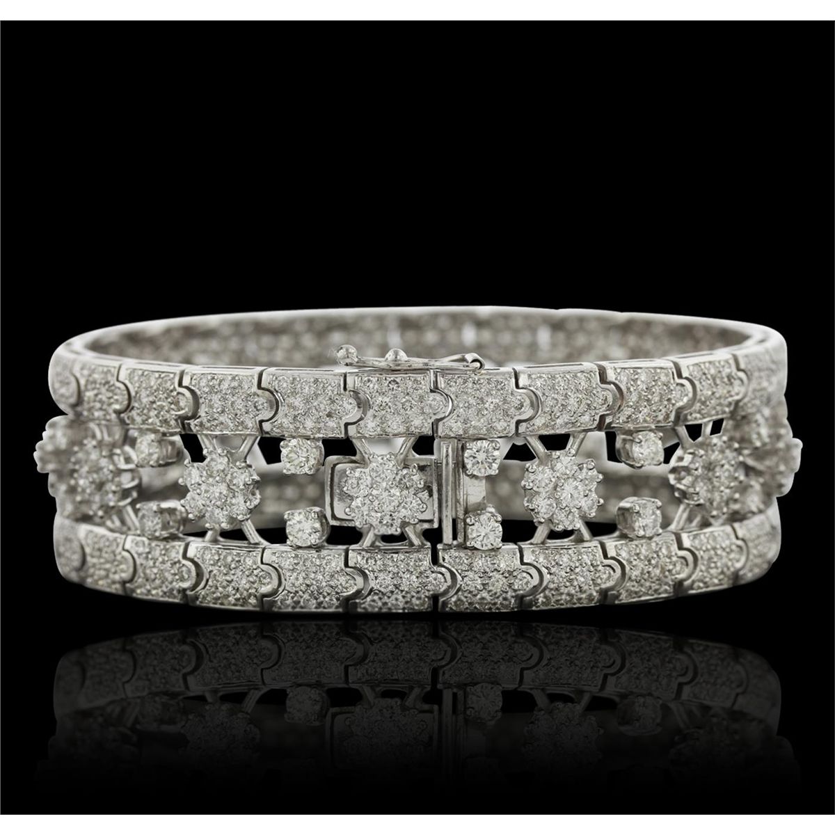 One electronically tested 18KT white gold ladies cast & assembled diamond bracelet with a bright polish finish. Condition is good. Seven and one-half inch length bracelet features a section of diamond florets, framed by two mirroring ribbons of diamonds terminating in a concealed clasp with safety. Identified with markings of "750". Containing: Twenty-Six prong set round brilliant cut diamonds, measuring 3.10 - 3.10 x 1.86mm (depth est.) approximate. Total Weight of 26 Stones = 2.94ct. Graded in the setting. Clarity: VS-2 to SI-2. Color: G - I Ninety-One prong set round brilliant cut diamonds, measuring 2.60 - 2.60 x 1.56mm (depth est.) approximate. Total Weight of 91 Stones = 5.95ct. Graded in the setting. Clarity: SI-1 to I-1. Color: G - I Four Hundred Sixty-Eight bead set round brilliant cut diamonds, measuring 1.50 - 1.50 x 0.90mm (depth est.) approximate. Total Weight of 468 Stones = 5.86ct. Graded in the setting. Clarity: SI-1 to I-1. Color: G - I. Total Weight of Diamonds 14.75ct. Total Weight of Bracelet 57.30 grams. AIG Appraised at $60,080.00.