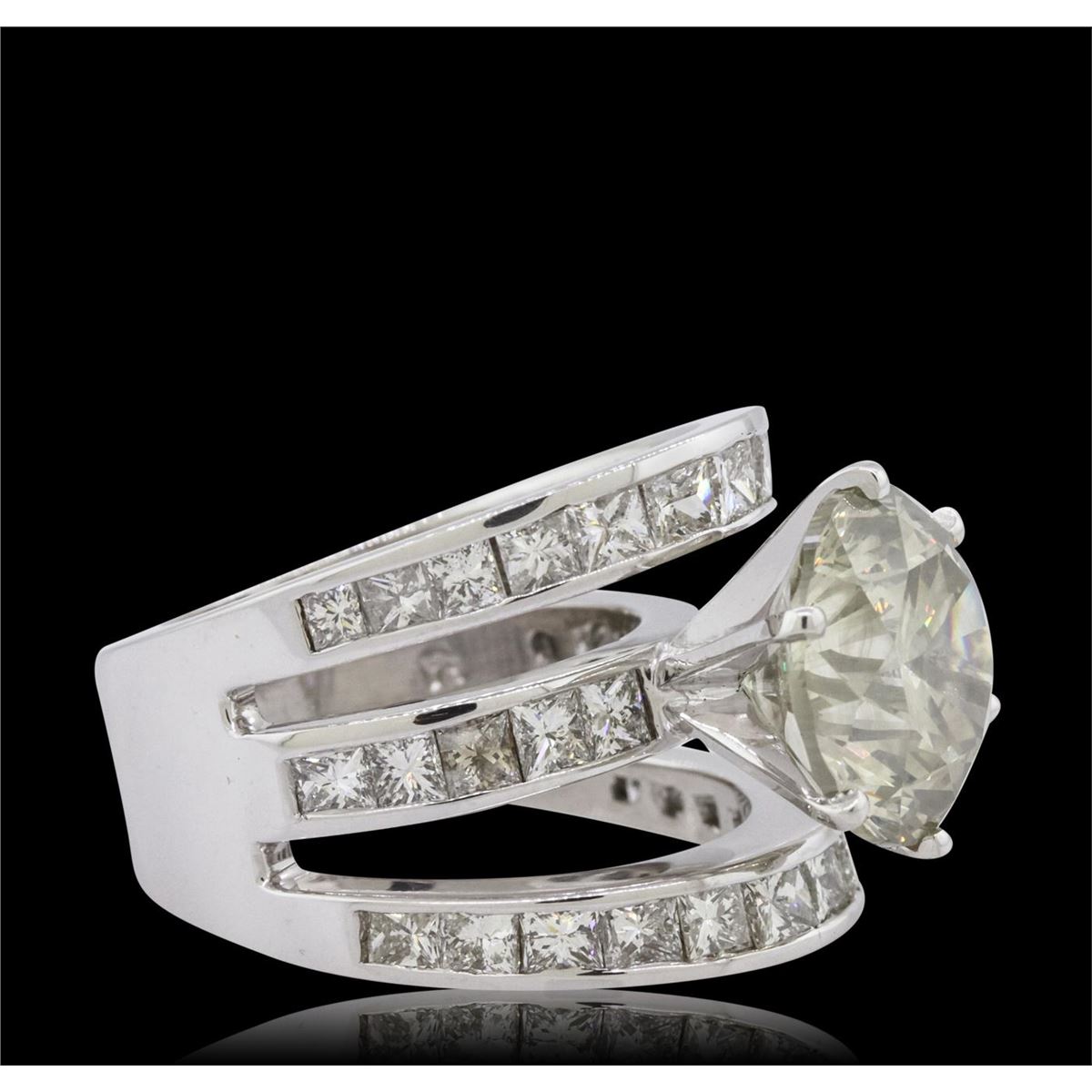 One electronically tested 18KT white gold ladies cast & assembled diamond unity ring with a bright polish finish. The featured diamond is set within mirroring elevated diamond ribbons supported by diamond set shoulders, completed by a nine millimeter wide band. Trademark is SA. Identified with markings of "18K". Condition is new, good workmanship. Containing: One prong set round brilliant cut diamond, measuring 12.90 - 12.90 x 8.10mm (depth est.), 11.00.%. GTCF approximate weight of 9.22ct with a faint yellow fluorescence. Faint grayish brown secondary color throughout. Diamond Grading Report attached. Graded in the setting. Clarity: I-1. Depth: 62.8%. Table 58.1%. Thirty-Six channel set princess cut diamonds, measuring 3.20 x 2.90 x 2.00mm (depth est.) approximate total weight of 36 Stones = 5.57ct. Graded in the setting. Clarity: VS-2 to SI-2. Color: H - J. Total Weight of Diamonds 14.79ct. Total Weight of Ring 21.65 grams. AIG Appraised at $114,095.00.