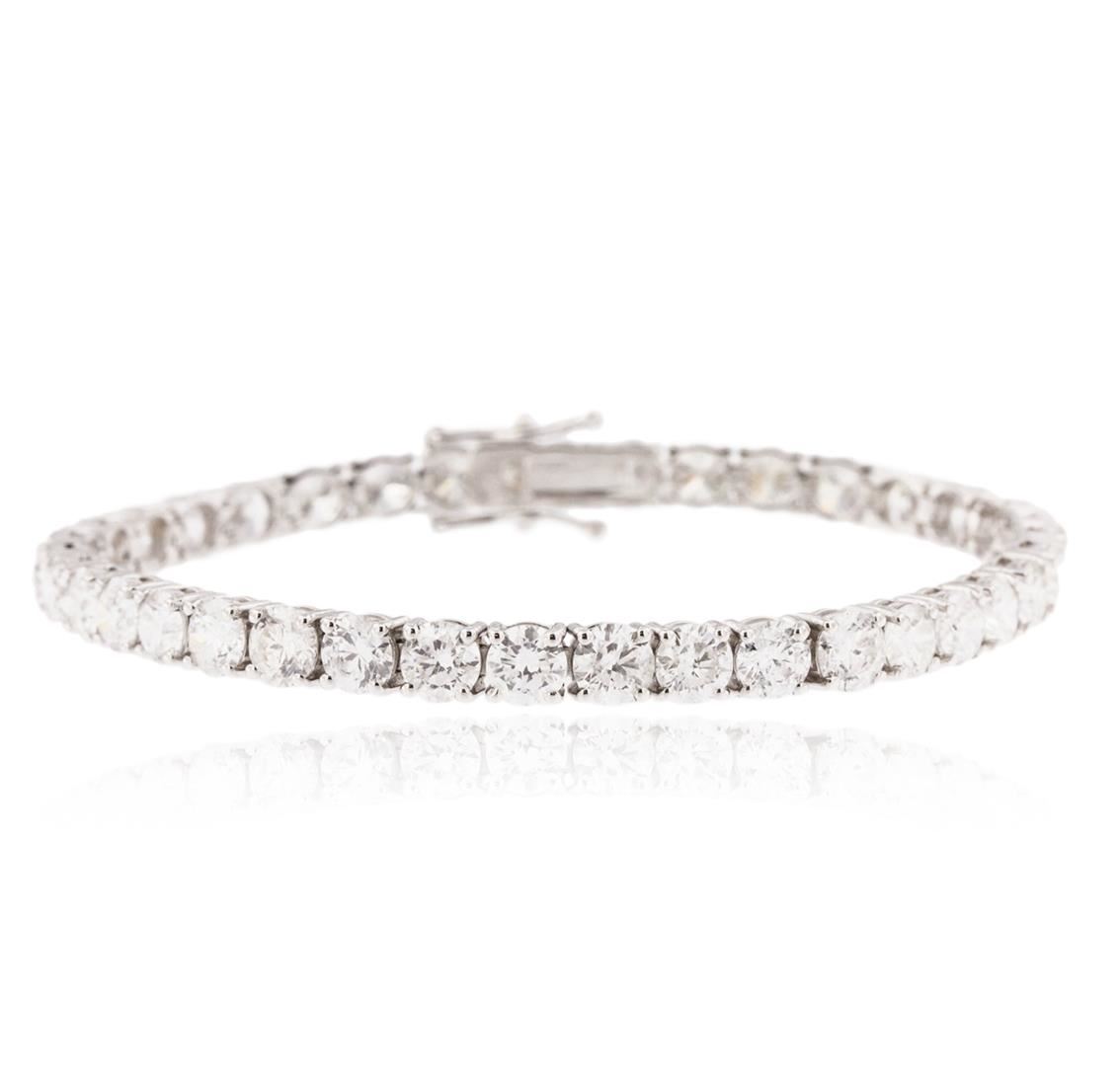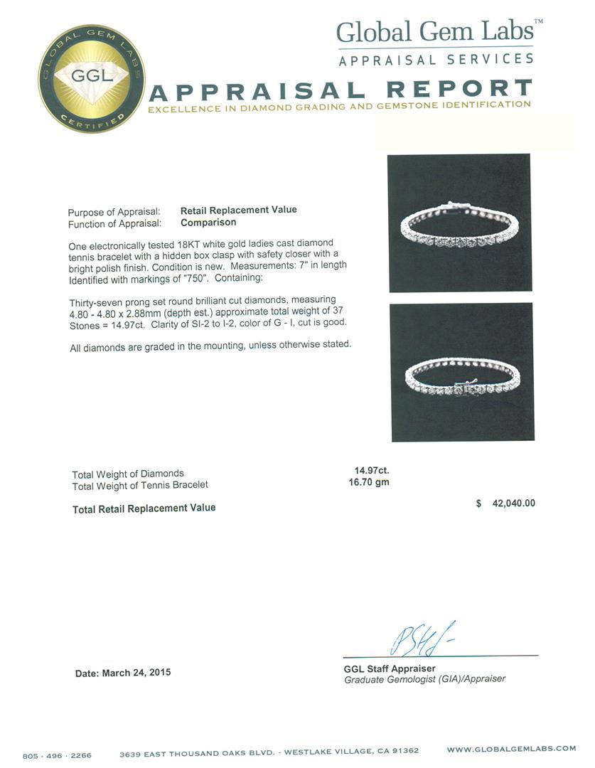 One electronically tested 18KT white gold ladies cast diamond tennis bracelet with a hidden box clasp with safety closer with a bright polish finish. Measurements: 7" in length Identified with markings of "750". Condition is new. Containing: Thirty-Seven prong set round brilliant cut diamonds, measuring 4.80 - 4.80 x 2.88mm (depth est.) approximate total weight of 37 Stones = 14.97ct. Clarity: SI-2 to I-2. Color: G - I, Cut is Good. All diamonds are graded in the mounting, unless otherwise stated. Total Weight of Diamonds 14.97ct. Total Weight of Tennis Bracelet 16.70 grams. GGL Appraised at $42,040.00.