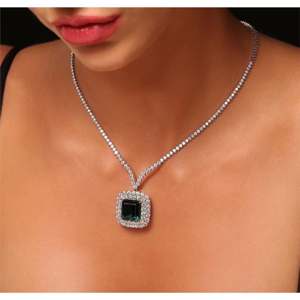 One electronically tested 18KT white gold Ladies combination cast & assembled necklace with a hidden box clasp with a bright polish finish. Condition is new. Measurements: 16" in length. Identified with markings of "14K". Containing: One prong set emerald standard step cut natural blue/green tourmaline, measuring 13.80 x 13.30 x 9.15mm, exact weight 15.54ct., clarity is eye clean, type I, medium light, very slightly grayish, green blue color, (GIA GB 4/3), cut is very good. GIA Report: 2151953693. Sixty prong set round brilliant cut diamonds, measuring 2.00 - 2.00 x 1.20mm (depth est.) approximate. Total Weight of 60 Stones = 1.75ct. Clarity: SI-1 to I-1. Color: H - I, Cut is Good. Seventy-Eight prong set round brilliant cut diamonds, measuring 3.00 - 2.70 x 1.71mm (depth est.) approximate. Total Weight of 78 Stones = 8.06ct. Clarity: SI-2 to I-1. Color: I - J, Cut is Good. Total Weight of Colored Stones 15.54ct. Total Weight of Diamonds 9.81ct. Total Weight of Necklace 31.30 grams. GGL Appraised at $48,930.00.