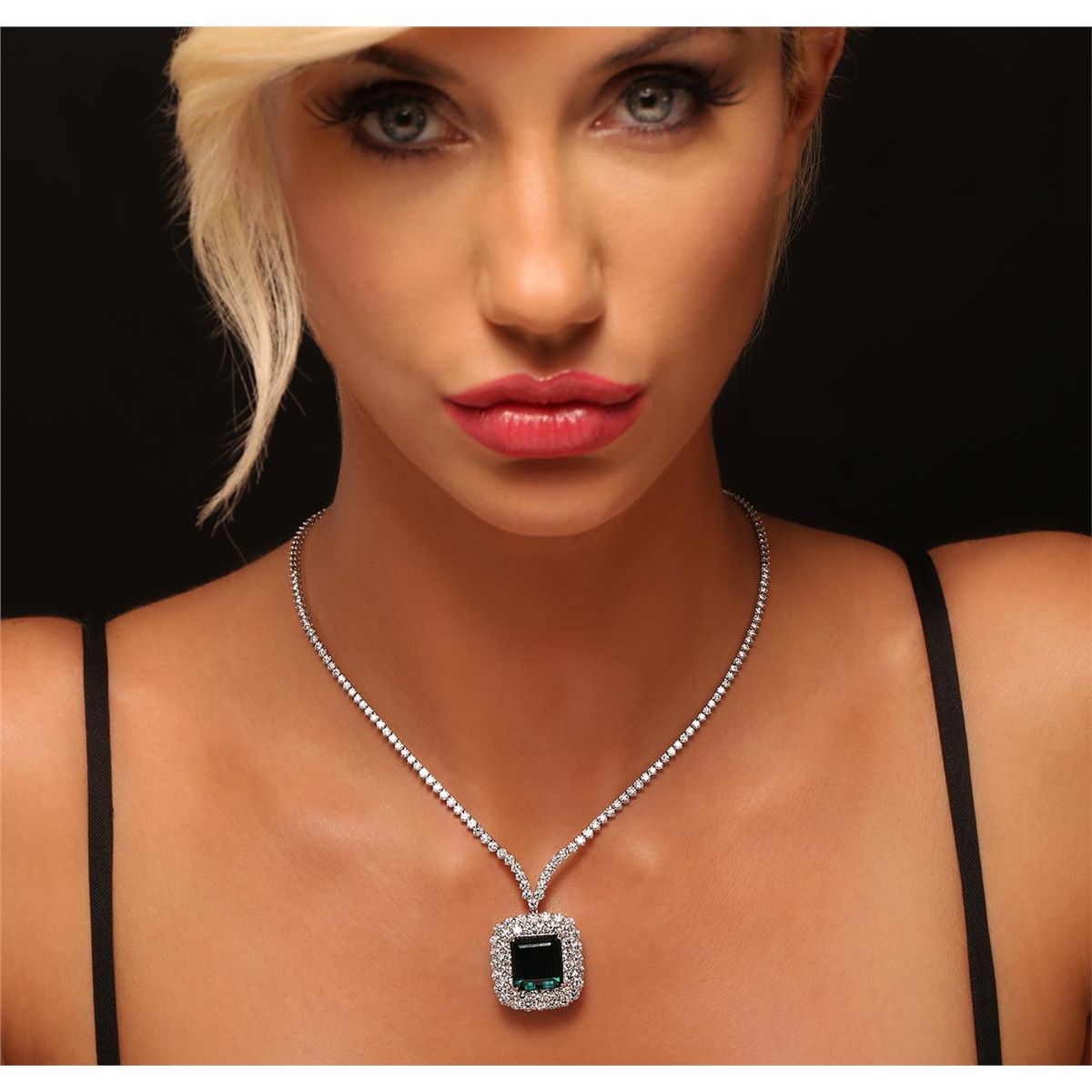 One electronically tested 18KT white gold Ladies combination cast & assembled necklace with a hidden box clasp with a bright polish finish. Condition is new. Measurements: 16" in length. Identified with markings of "14K". Containing: One prong set emerald standard step cut natural blue/green tourmaline, measuring 13.80 x 13.30 x 9.15mm, exact weight 15.54ct., clarity is eye clean, type I, medium light, very slightly grayish, green blue color, (GIA GB 4/3), cut is very good. GIA Report: 2151953693. Sixty prong set round brilliant cut diamonds, measuring 2.00 - 2.00 x 1.20mm (depth est.) approximate. Total Weight of 60 Stones = 1.75ct. Clarity: SI-1 to I-1. Color: H - I, Cut is Good. Seventy-Eight prong set round brilliant cut diamonds, measuring 3.00 - 2.70 x 1.71mm (depth est.) approximate. Total Weight of 78 Stones = 8.06ct. Clarity: SI-2 to I-1. Color: I - J, Cut is Good. Total Weight of Colored Stones 15.54ct. Total Weight of Diamonds 9.81ct. Total Weight of Necklace 31.30 grams. GGL Appraised at $48,930.00.