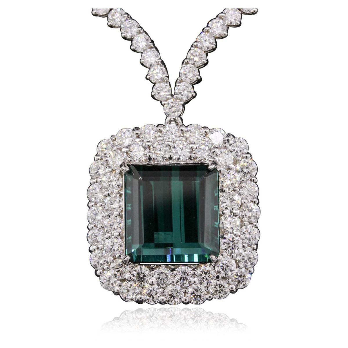 One electronically tested 18KT white gold Ladies combination cast & assembled necklace with a hidden box clasp with a bright polish finish. Condition is new. Measurements: 16" in length. Identified with markings of "14K". Containing: One prong set emerald standard step cut natural blue/green tourmaline, measuring 13.80 x 13.30 x 9.15mm, exact weight 15.54ct., clarity is eye clean, type I, medium light, very slightly grayish, green blue color, (GIA GB 4/3), cut is very good. GIA Report: 2151953693. Sixty prong set round brilliant cut diamonds, measuring 2.00 - 2.00 x 1.20mm (depth est.) approximate. Total Weight of 60 Stones = 1.75ct. Clarity: SI-1 to I-1. Color: H - I, Cut is Good. Seventy-Eight prong set round brilliant cut diamonds, measuring 3.00 - 2.70 x 1.71mm (depth est.) approximate. Total Weight of 78 Stones = 8.06ct. Clarity: SI-2 to I-1. Color: I - J, Cut is Good. Total Weight of Colored Stones 15.54ct. Total Weight of Diamonds 9.81ct. Total Weight of Necklace 31.30 grams. GGL Appraised at $48,930.00.