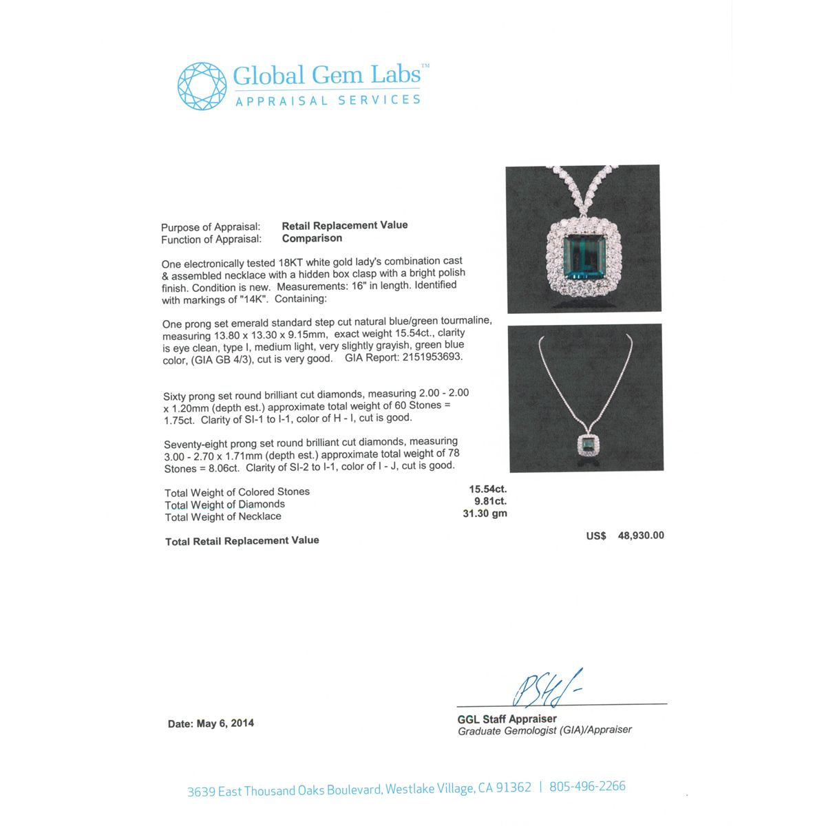 One electronically tested 18KT white gold Ladies combination cast & assembled necklace with a hidden box clasp with a bright polish finish. Condition is new. Measurements: 16" in length. Identified with markings of "14K". Containing: One prong set emerald standard step cut natural blue/green tourmaline, measuring 13.80 x 13.30 x 9.15mm, exact weight 15.54ct., clarity is eye clean, type I, medium light, very slightly grayish, green blue color, (GIA GB 4/3), cut is very good. GIA Report: 2151953693. Sixty prong set round brilliant cut diamonds, measuring 2.00 - 2.00 x 1.20mm (depth est.) approximate. Total Weight of 60 Stones = 1.75ct. Clarity: SI-1 to I-1. Color: H - I, Cut is Good. Seventy-Eight prong set round brilliant cut diamonds, measuring 3.00 - 2.70 x 1.71mm (depth est.) approximate. Total Weight of 78 Stones = 8.06ct. Clarity: SI-2 to I-1. Color: I - J, Cut is Good. Total Weight of Colored Stones 15.54ct. Total Weight of Diamonds 9.81ct. Total Weight of Necklace 31.30 grams. GGL Appraised at $48,930.00.