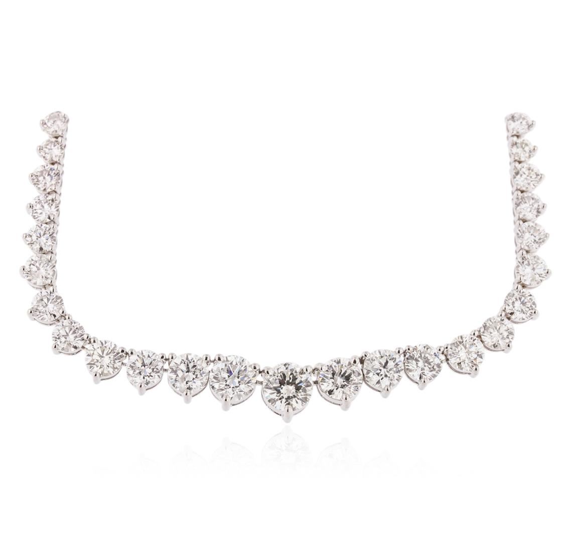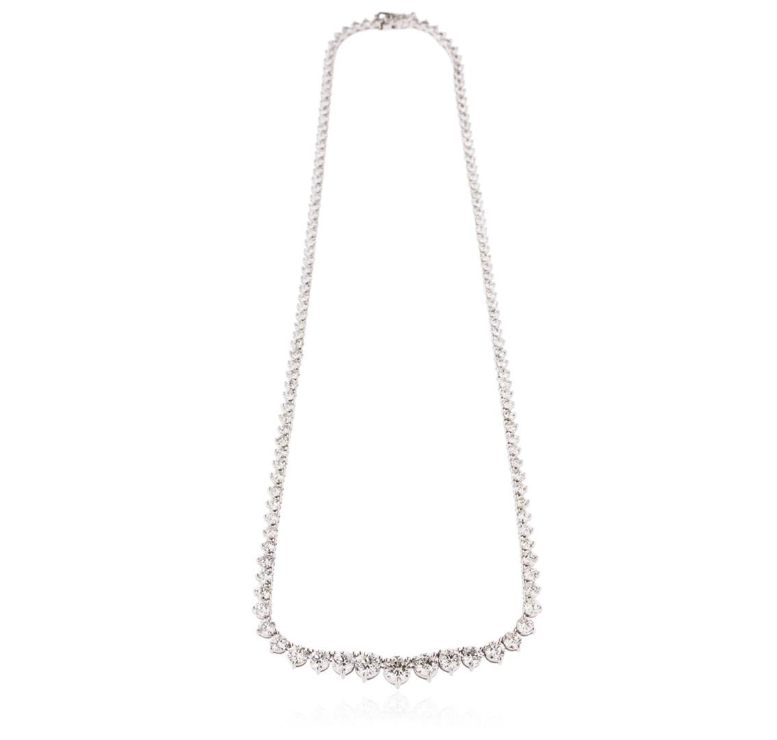 One electronically tested 18KT white gold ladies cast diamond necklace with a hidden box clasp with safety closer with a bright polish finish. Measurements: 16.25" in length Identified with markings of "750". Condition is new. Containing: One prong set round brilliant cut diamond, measuring 6.10 - 6.00 x 3.63mm (depth est.) approximate weight of 0.81ct. Clarity: I-1. Color: K, Cut is Good. Ten prong set round brilliant cut diamonds, measuring 5.00 - 4.00 x 2.70mm (depth est.) approximate total weight of 10 Stones = 3.34ct. Clarity: SI-2 to I-1. Color: I - J, Cut is Good. One Hundred Eighteen prong set round brilliant cut diamonds, measuring 3.50 - 2.50 x 1.80mm (depth est.) approximate total weight of 118 Stones = 11.66ct. Clarity: SI-1 to I-1. Color: I - J, Cut is Good. All diamonds are graded in the mounting, unless otherwise stated. Total Weight of Diamonds 15.80ct. Total Weight of Necklace 19.70 grams. GGL Appraised at $33,065.00.