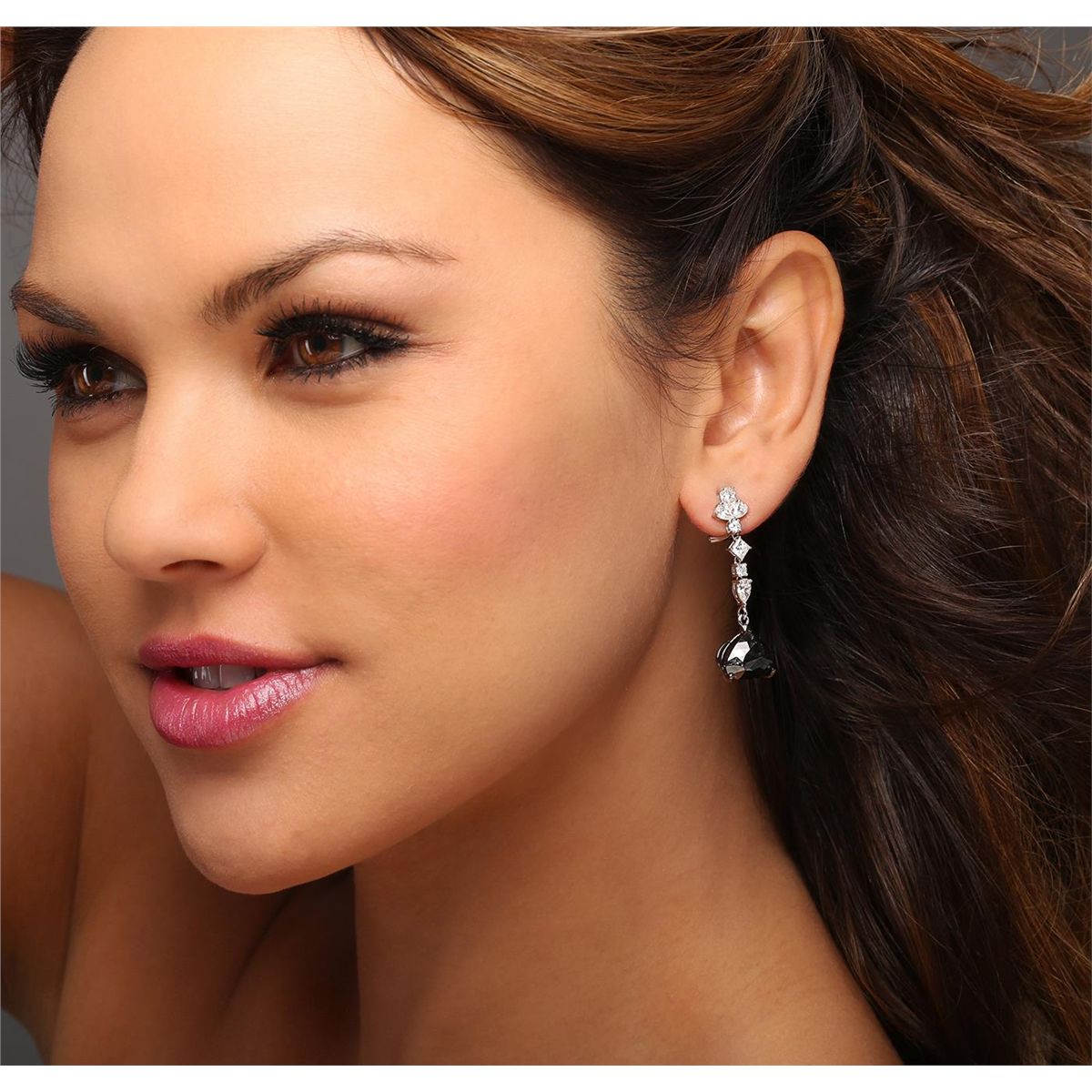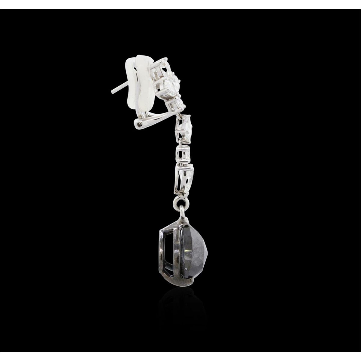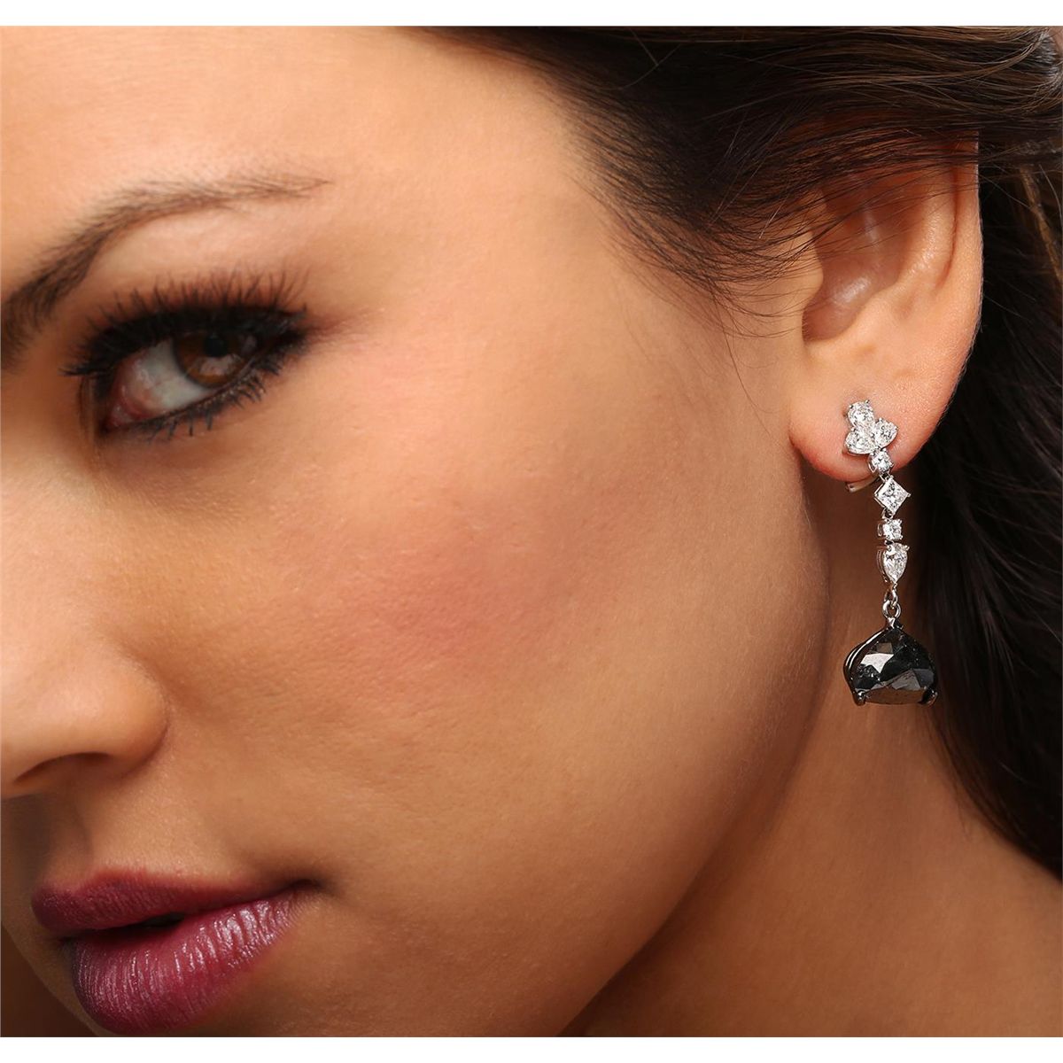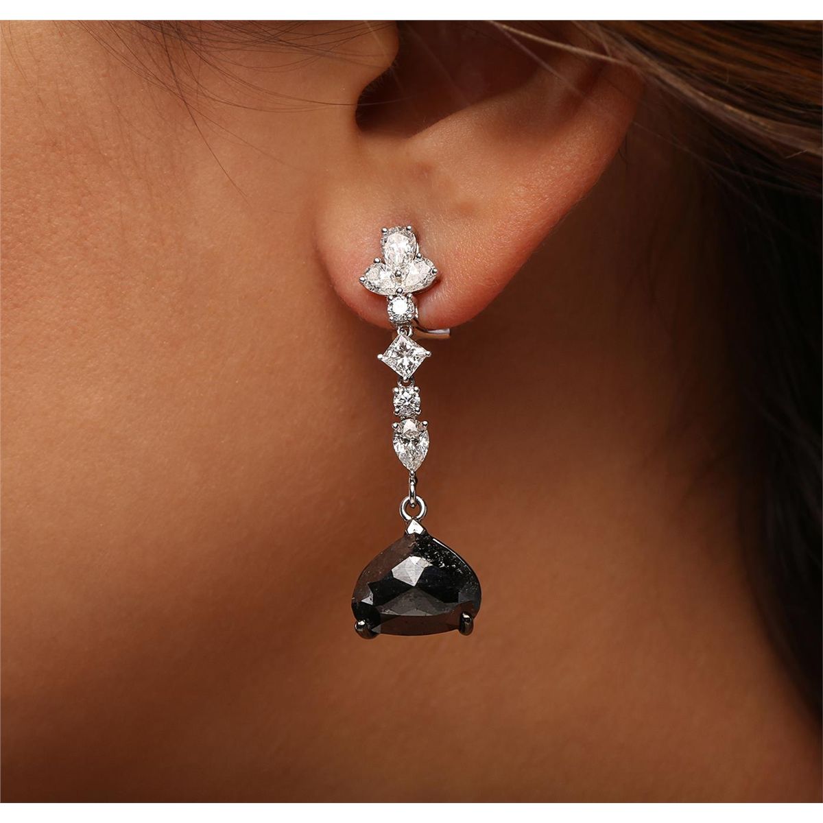 One pair of white gold earrings stamped 18k containing two natural pear rose cut fancy black diamonds, enhanced for color, with a total weight of 13.24ct. The earrings also contain 14 diamonds that are H-I color, VS2-SI2 clarity with a total weight of 2.7