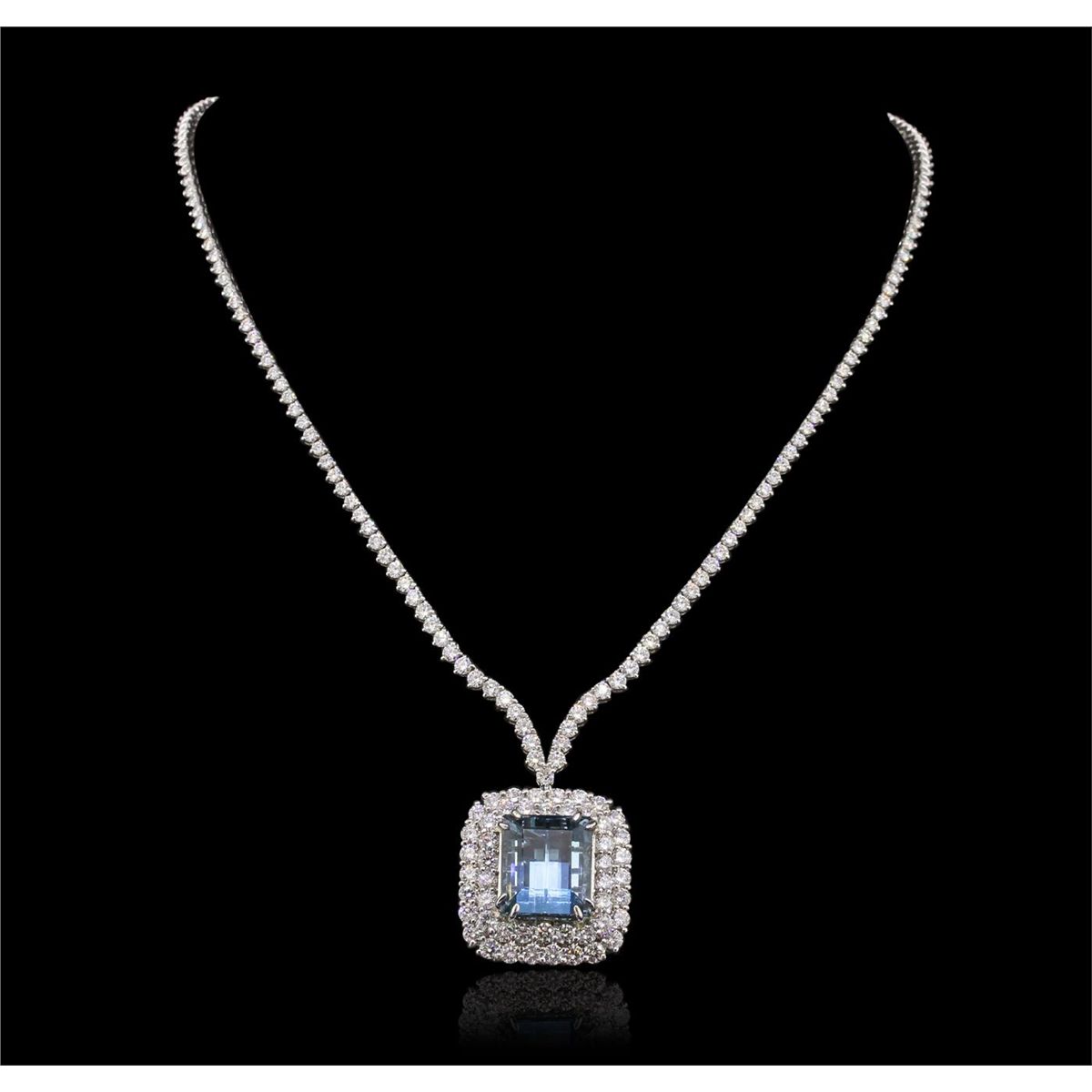 One electronically tested 18KT white gold Ladies combination cast & assembled pendant & chain 16.8 inch long, medium with a hidden box clasp with a bright polish finish. Condition is new. Identified with markings of "750". Containing: One prong set emerald standard step cut natural aquamarine, measuring 15.03 x 13.17 x 11.04mm, exact weight 16.60ct., clarity is eye clean, type I, medium light, very slightly grayish, blue color, (GIA B 4/3), cut is very good. GIA Report: 2151964329. Ninety-Five prong set round brilliant cut diamonds, measuring 2.60 - 2.60 x 1.56mm (depth est.) approximate. Total Weight of 95 Stones = 6.11ct. . Clarity: I-1 to I-2. Color: I - J, Cut is Good. Forty-Eight prong set round brilliant cut diamonds, measuring 3.00 - 3.00 x 1.80mm (depth est.) approximate. Total Weight of 48 Stones = 4.74ct. . Clarity: SI-1 to SI-2. Color: J - K, Cut is Good. Total Weight of Colored Stones 16.60ct. Total Weight of Diamonds 10.85ct. Total Weight of Pendant & Chain 32.50 grams. GGLAppraised at $53,625.00.